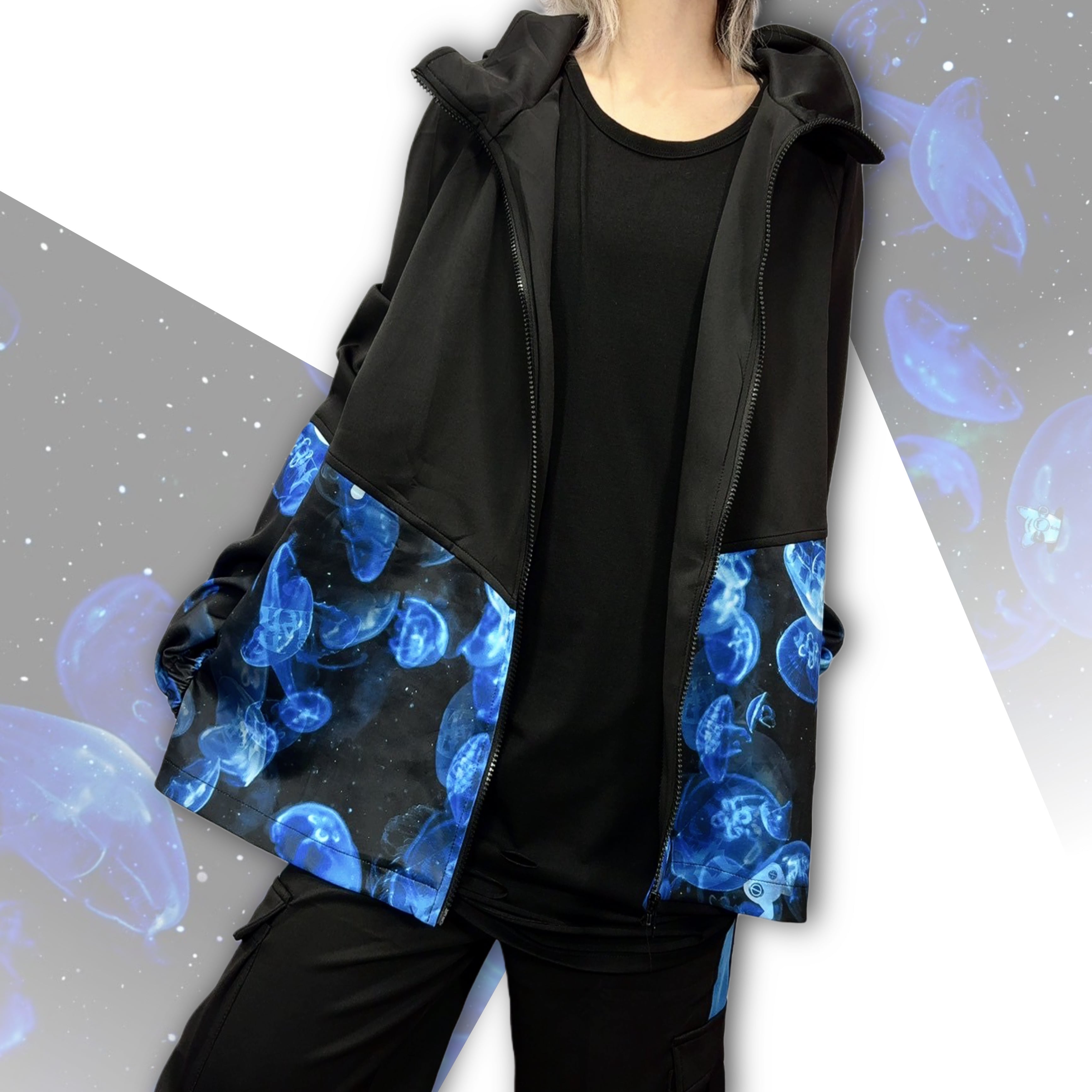 オリジナルデザインの闇夜を泳ぐ海月の神秘的な光を大胆にプリントした唯一無二のアウターが新登場☆