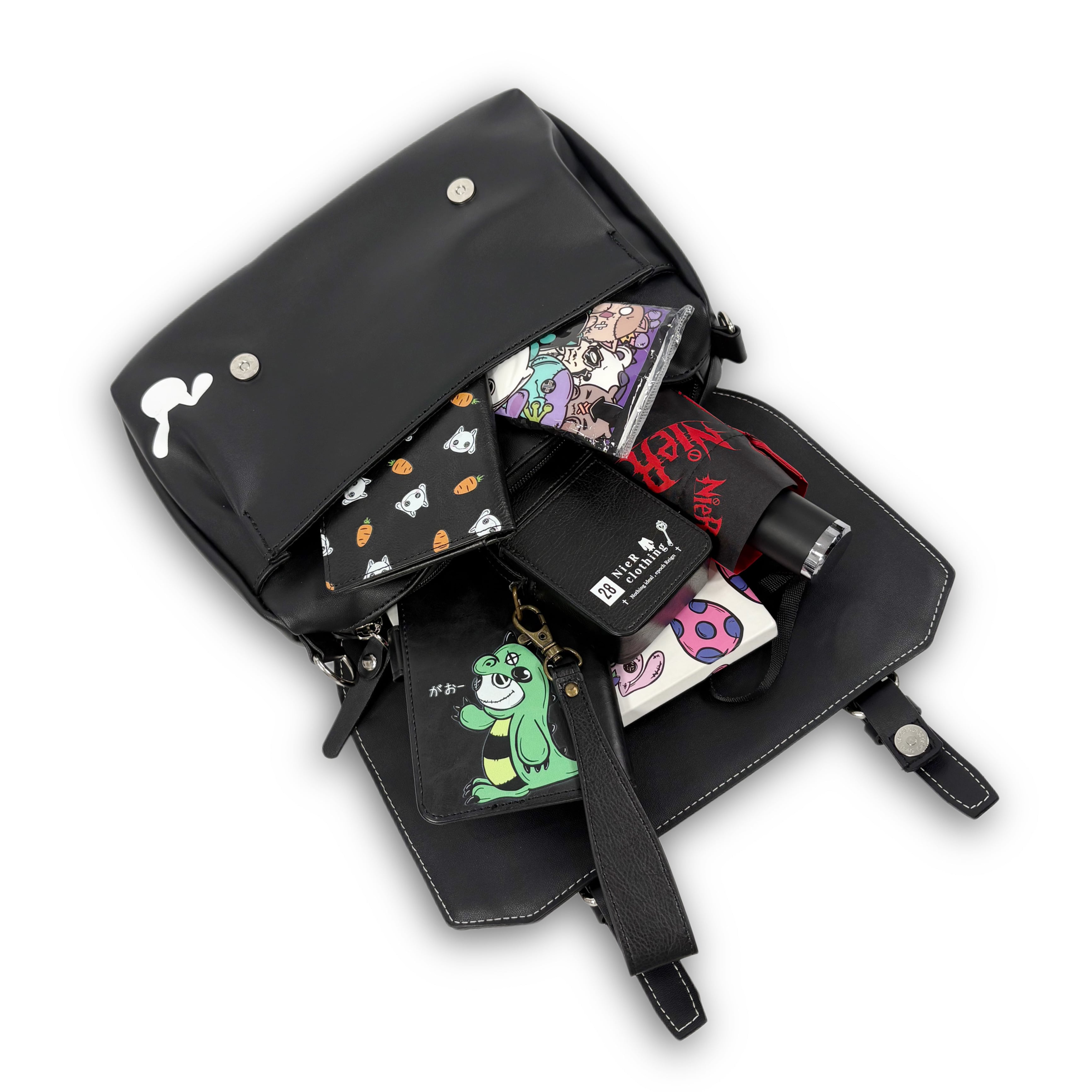 艶めくブラックレザー調×ホワイトプリントのコントラストで、日常も非日常も映える2WAYバッグ。