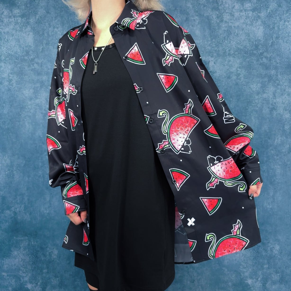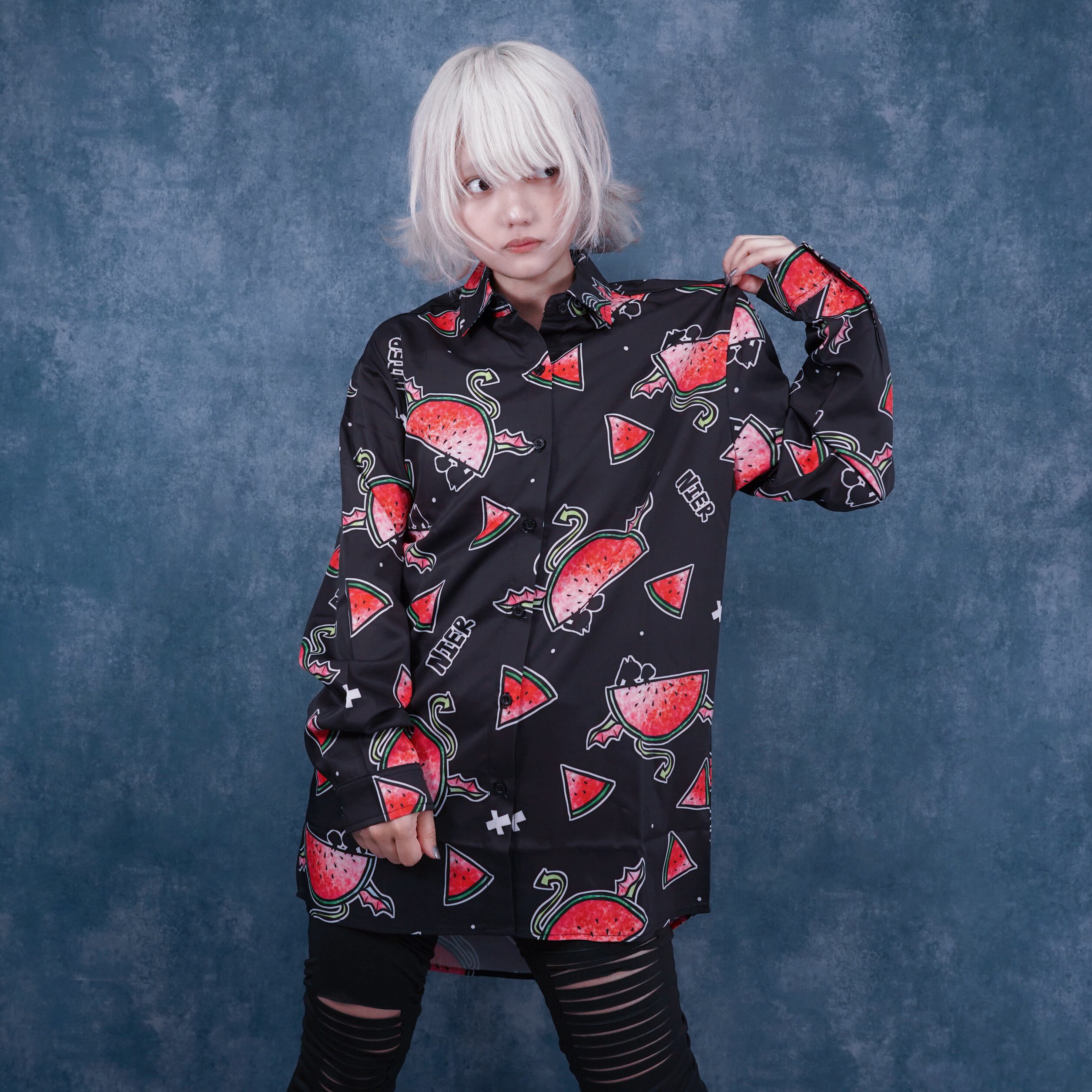 印象的なスイカ総柄デザインのロングシャツとなっております。