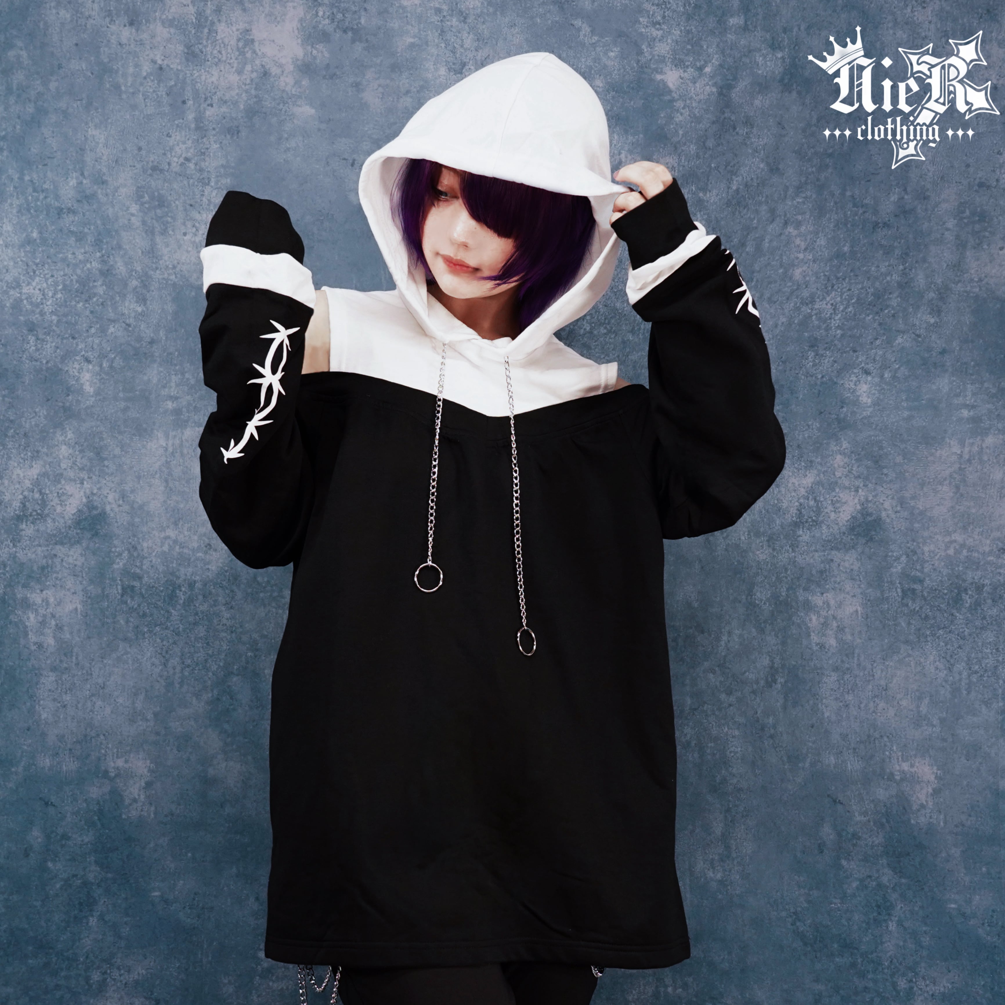 ホワイトのフードを効かせたモノトーン配色に、