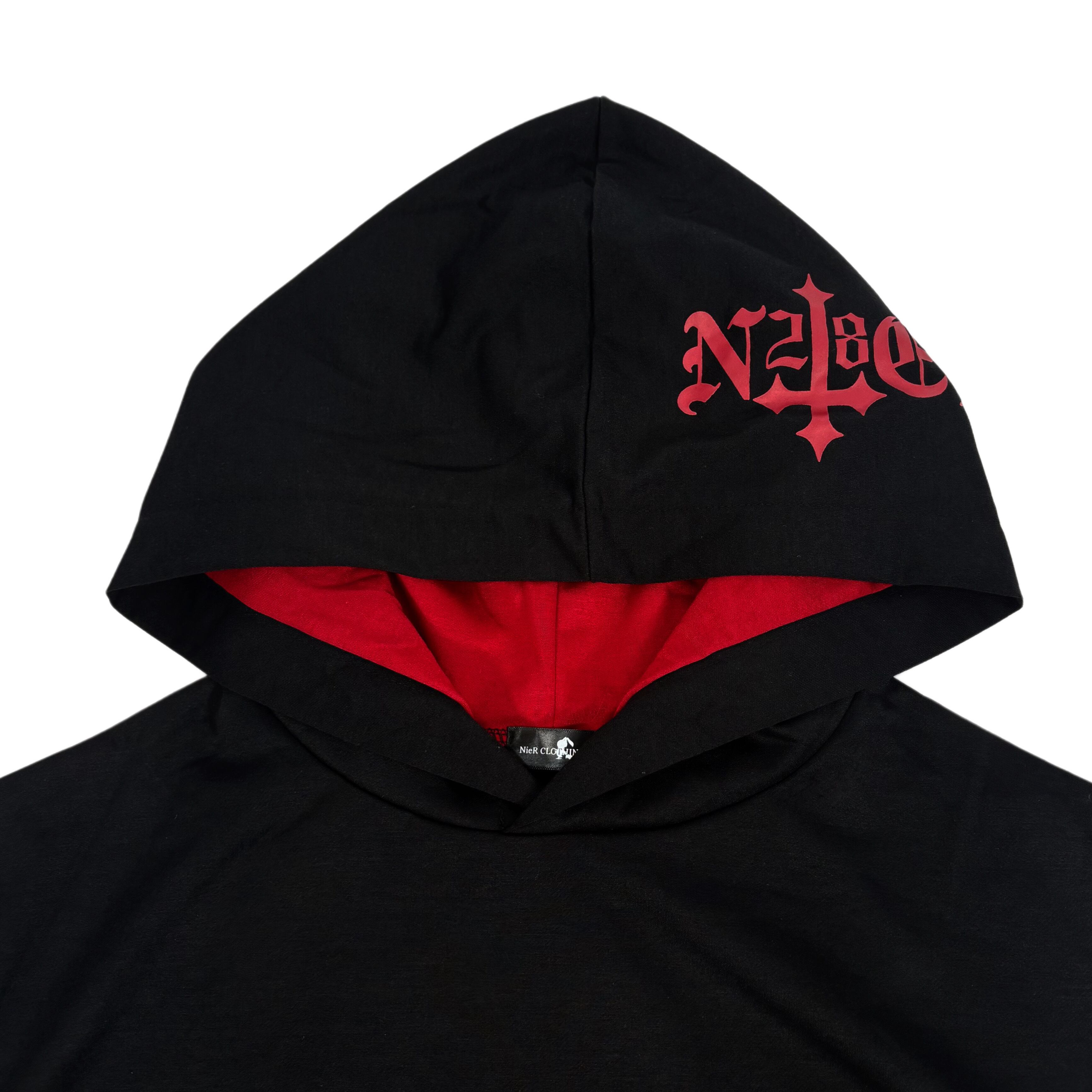 深紅のフード裏地と表地のロゴプリントが、ブラックボディに映える仕上がり。