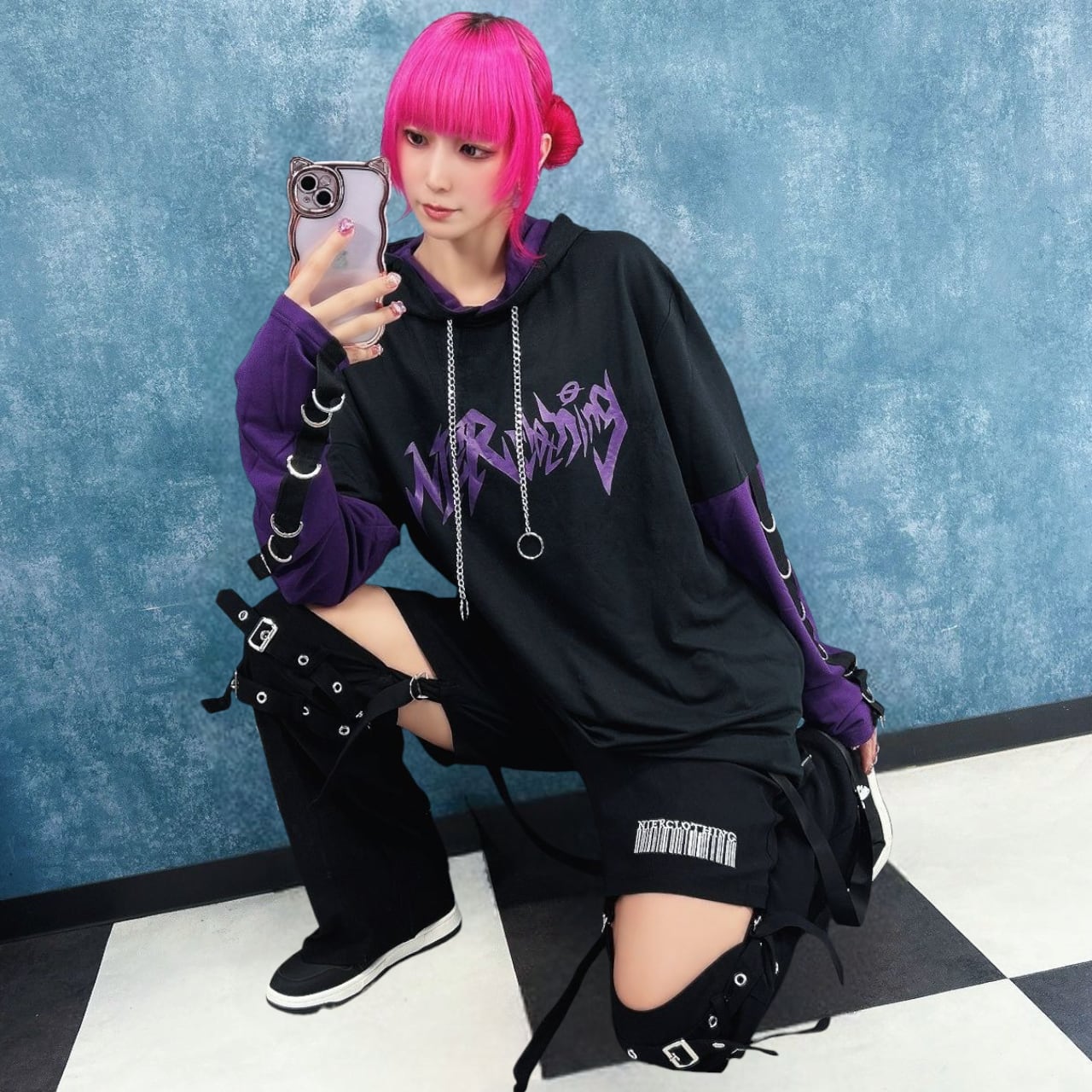 ベルト装飾や垂れ下がるハーネスストラップが視線を惹きつけ、スタイリングの主役に✨
