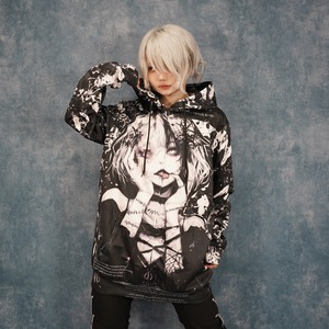 フロントからバックまで大胆に描かれた、退廃的で魅惑的なモノクロアートが印象的なフルグラフィックパーカーとなっております。