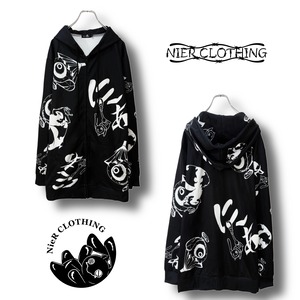 妖しげに微笑むから傘お化けや、吊り下がったNIERちゃん、そしてタヌキをモチーフにしたダークポップな総柄デザインとなっております。