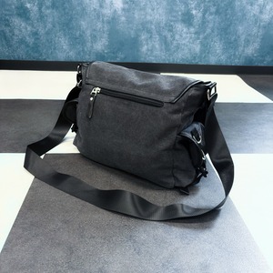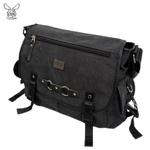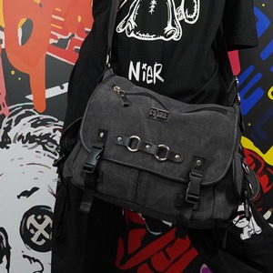 重厚感あるダークグレーのキャンバス地に、メタルリングとベルトストラップを大胆に配置した存在感抜群のメッセンジャーバッグになります。