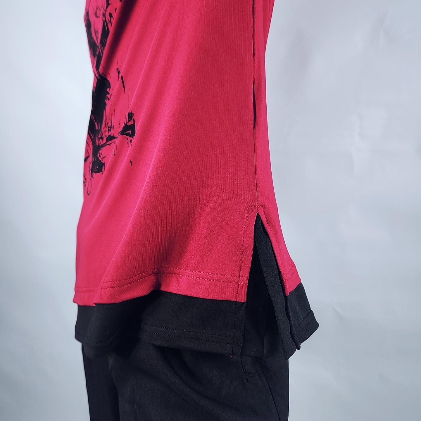 赤×黒のコントラストが映えるダブルレイヤーデザインで、袖と裾から覗くブラックの切替がコーデ全体を引き締めます。