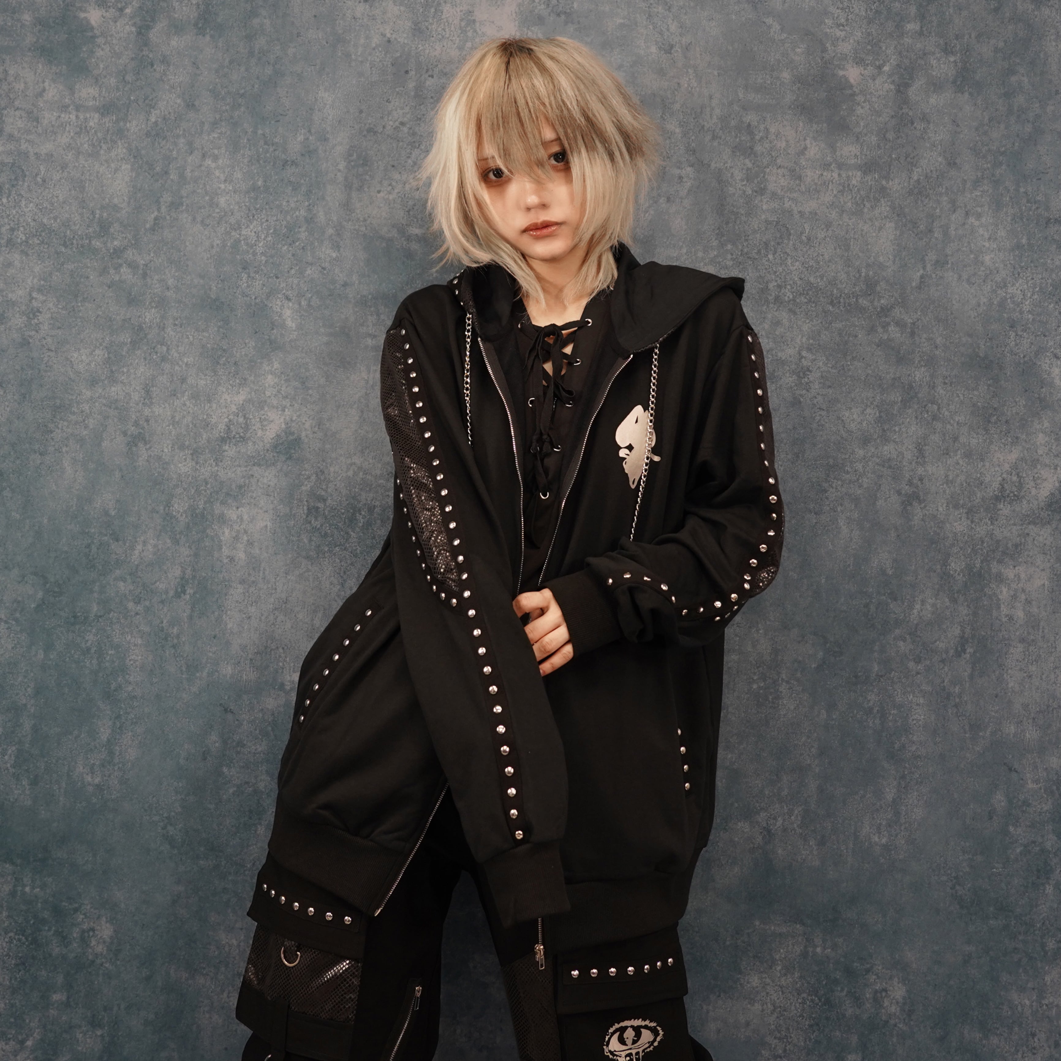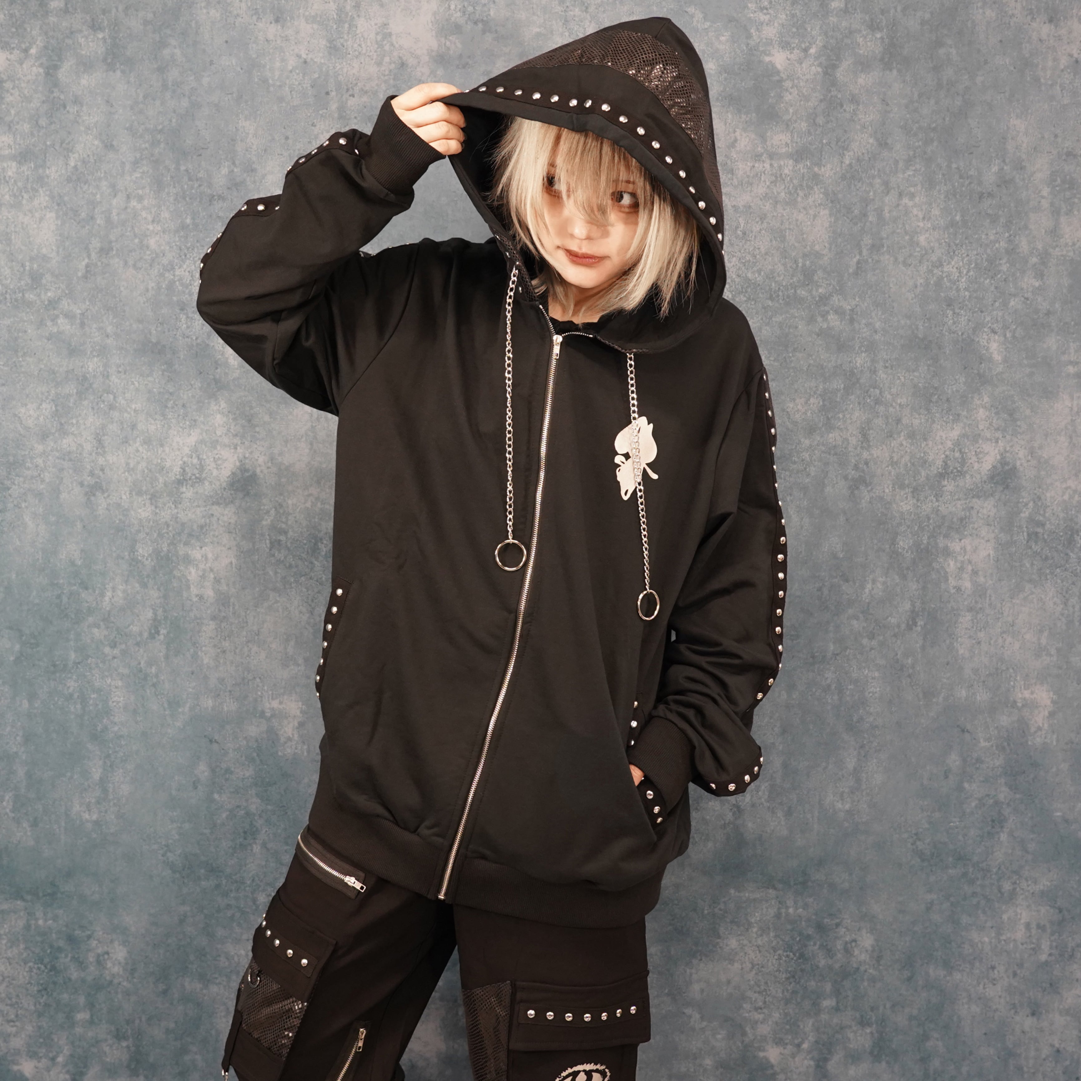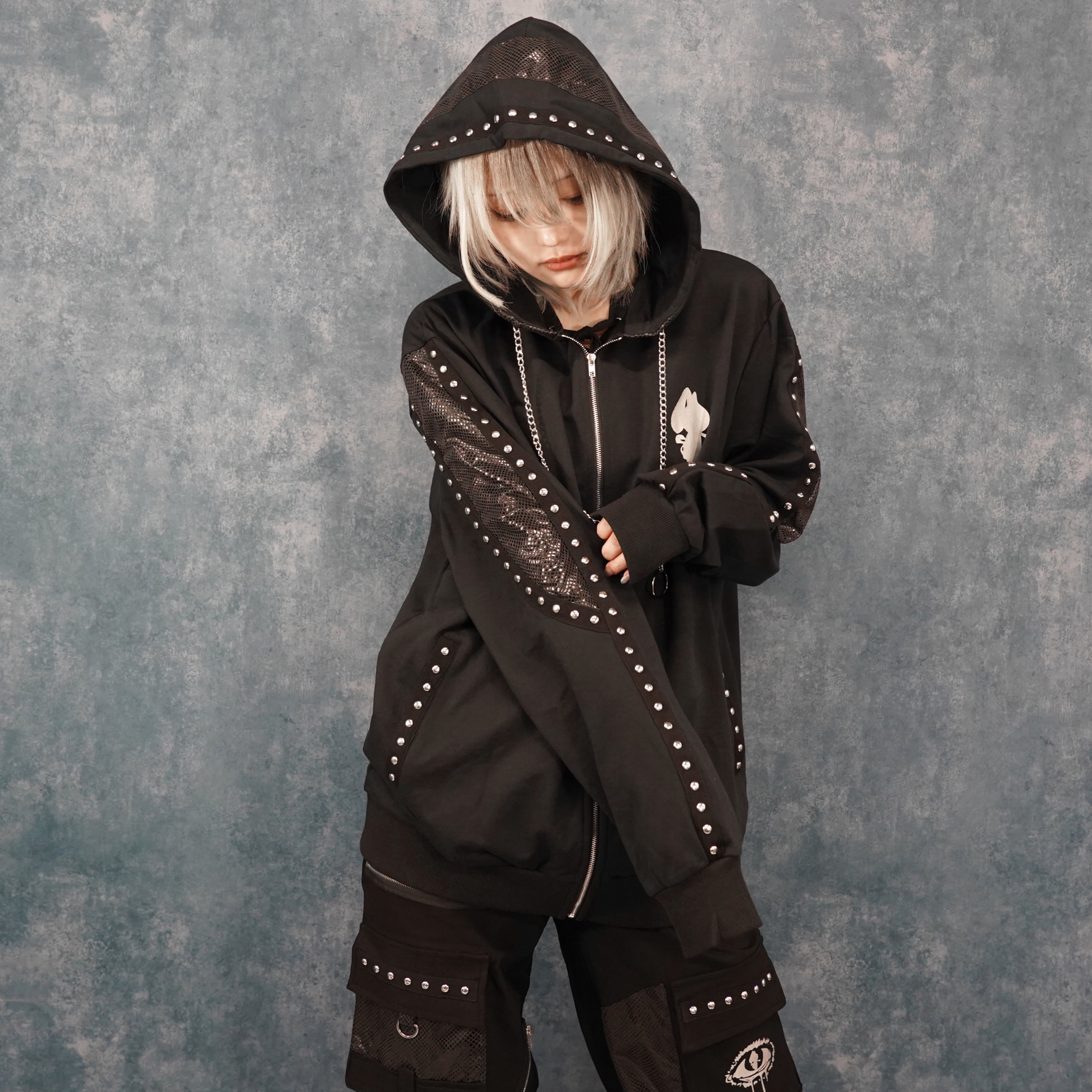 袖からフードにかけて施された異素材切替とシルバースタッズが、