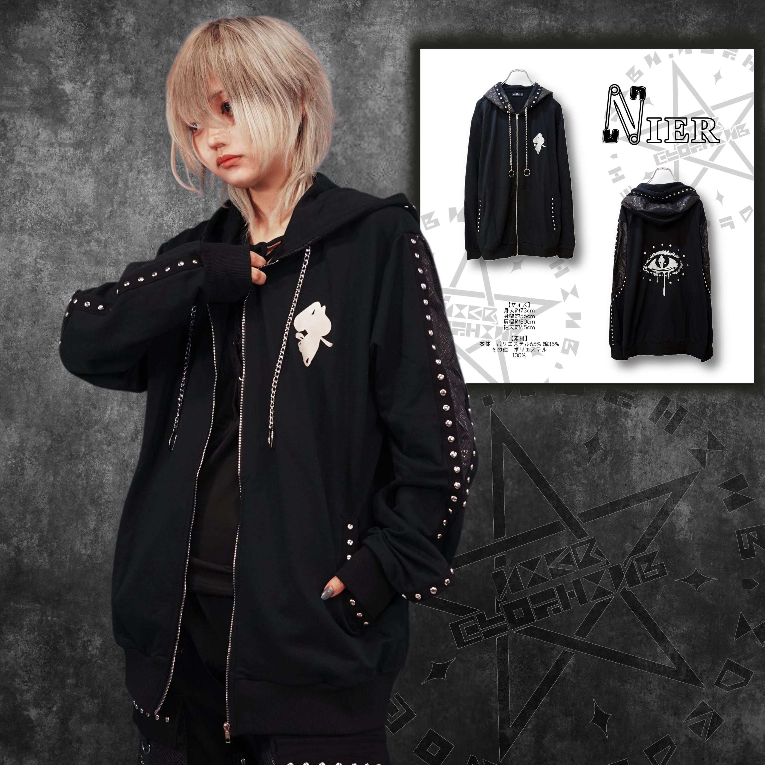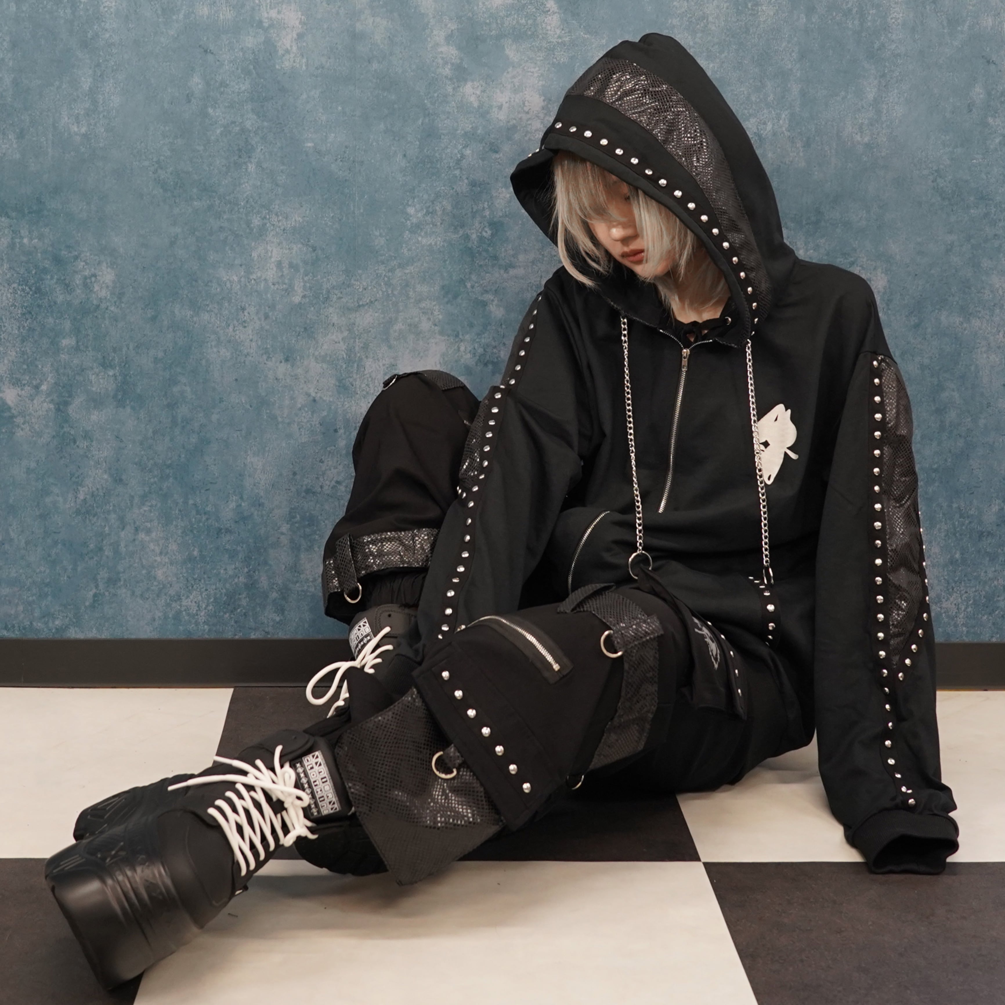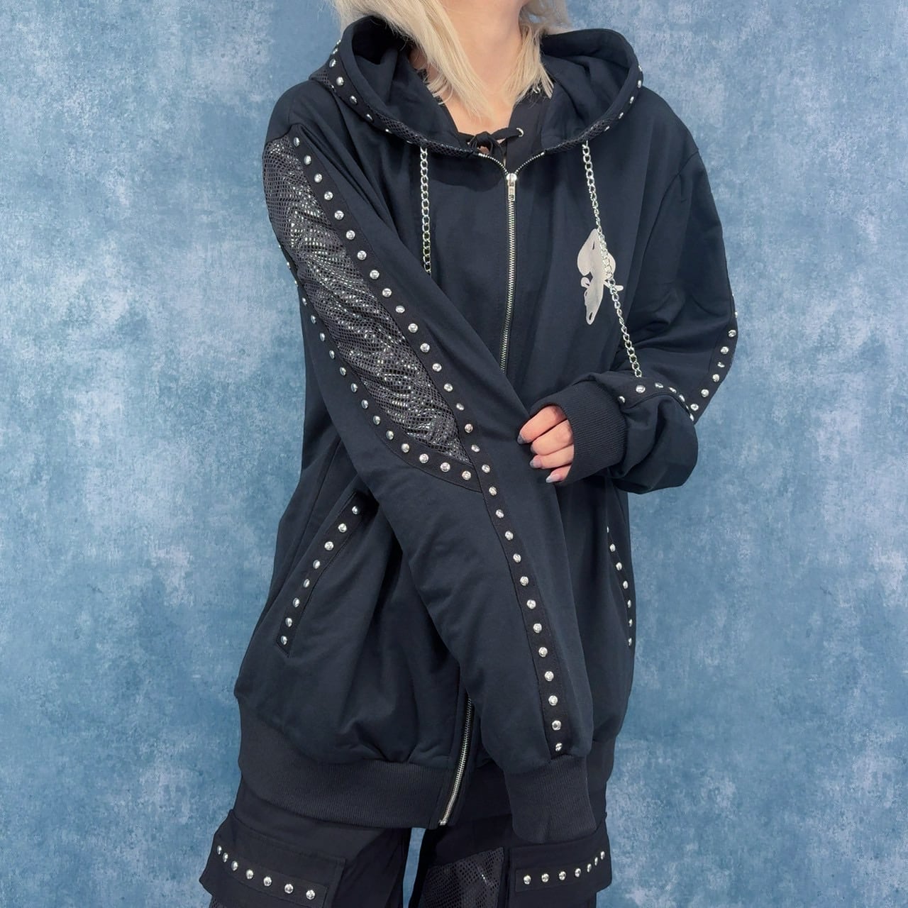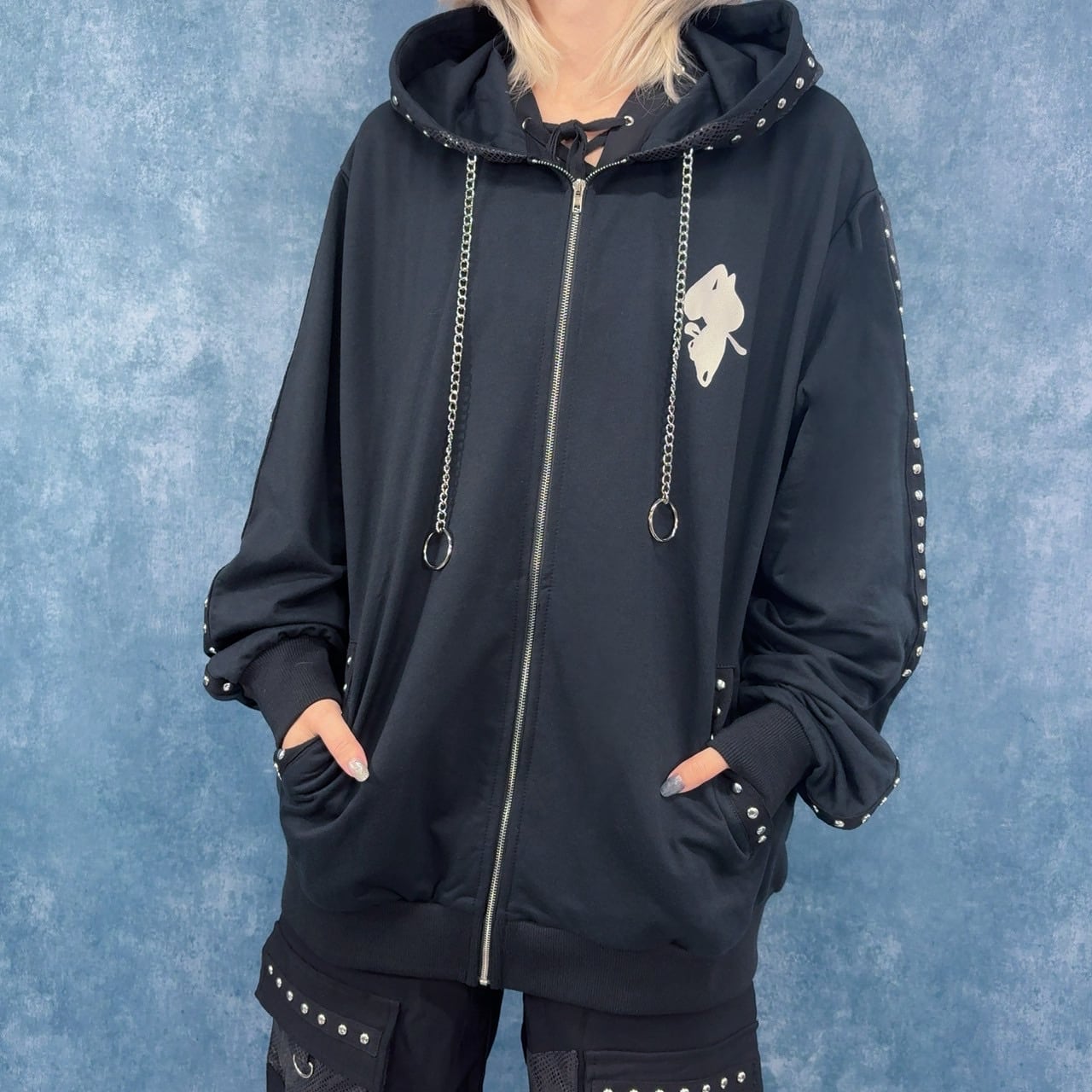 袖からフードにかけて施された異素材切替とシルバースタッズが、