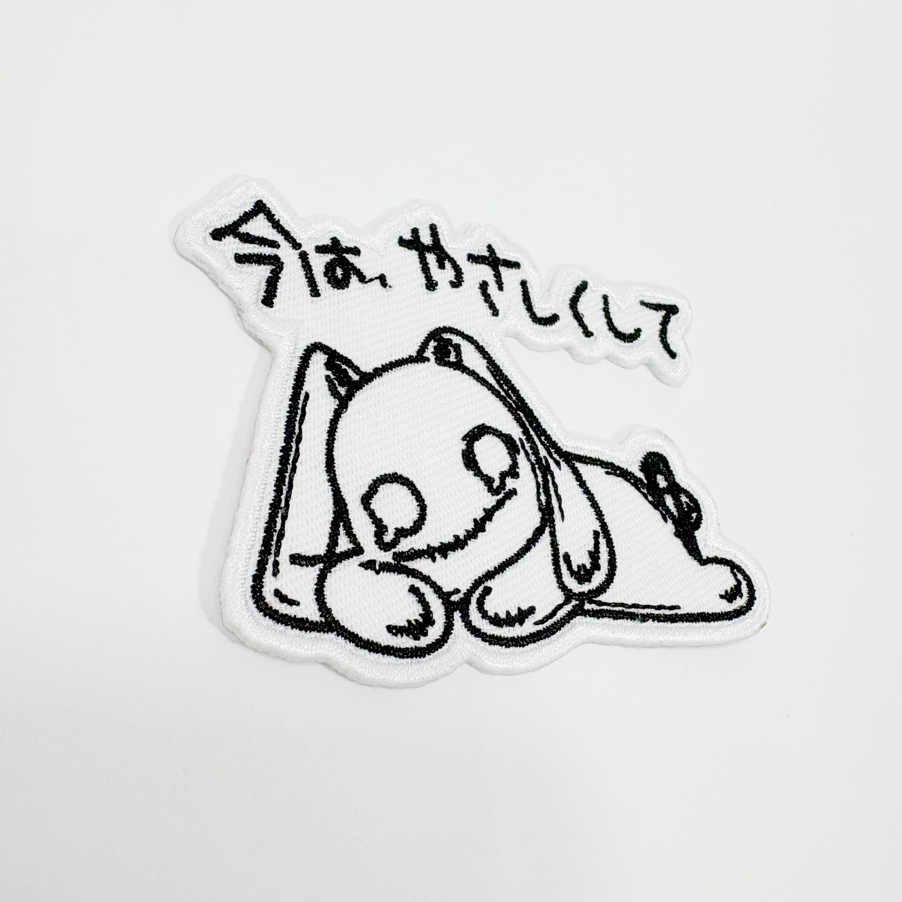 くたっと寝そべる、ちょっぴり切ない表情のNIERちゃんと「今は、やさしくして」のメッセージが心に刺さる、オリジナル刺繍ワッペンとなっております。