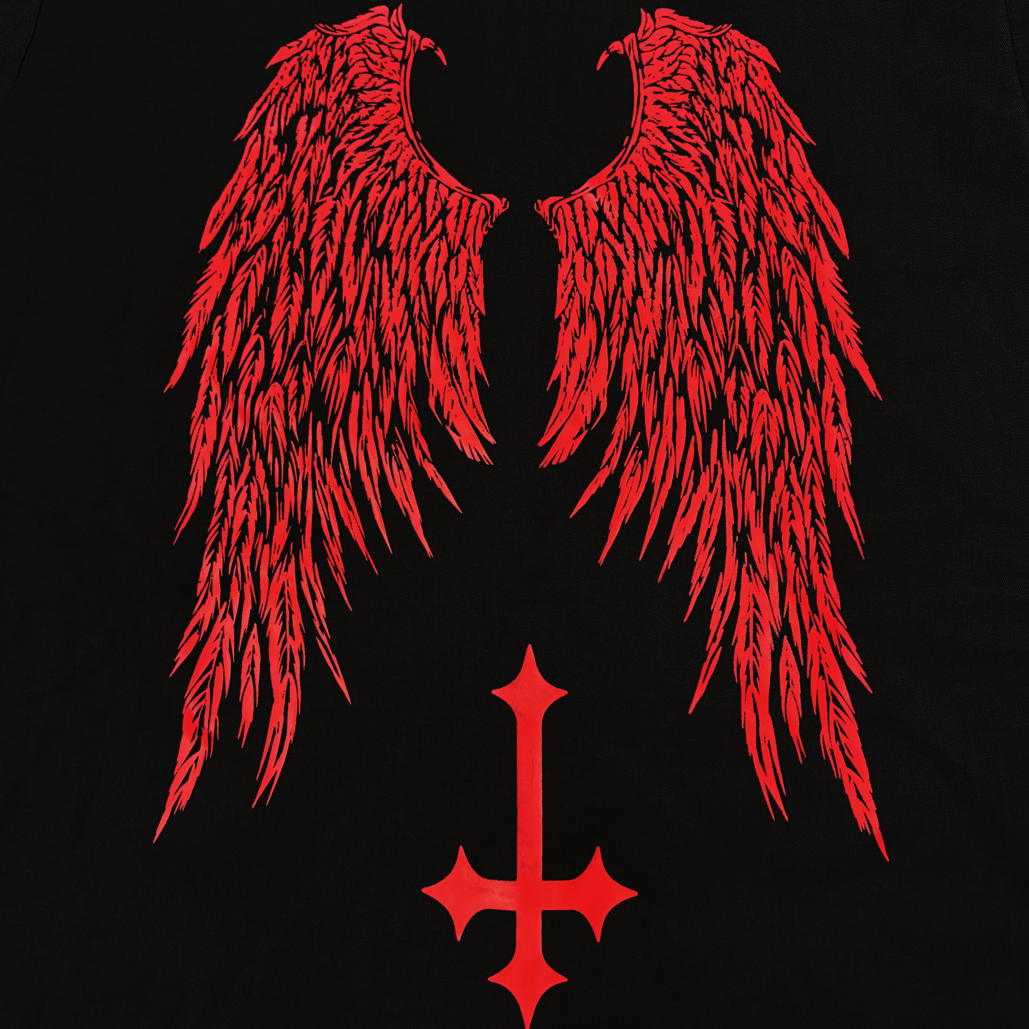 袖には同色ラインとクロスモチーフのプリントを配置し、バックには存在感のある羽根グラフィックをプリントしております。