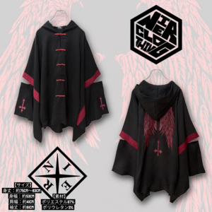 フード付きのルーズシルエットに、着物風の極太スリーブを組み合わせた和×ゴシックのチャイナトップスとなっております。