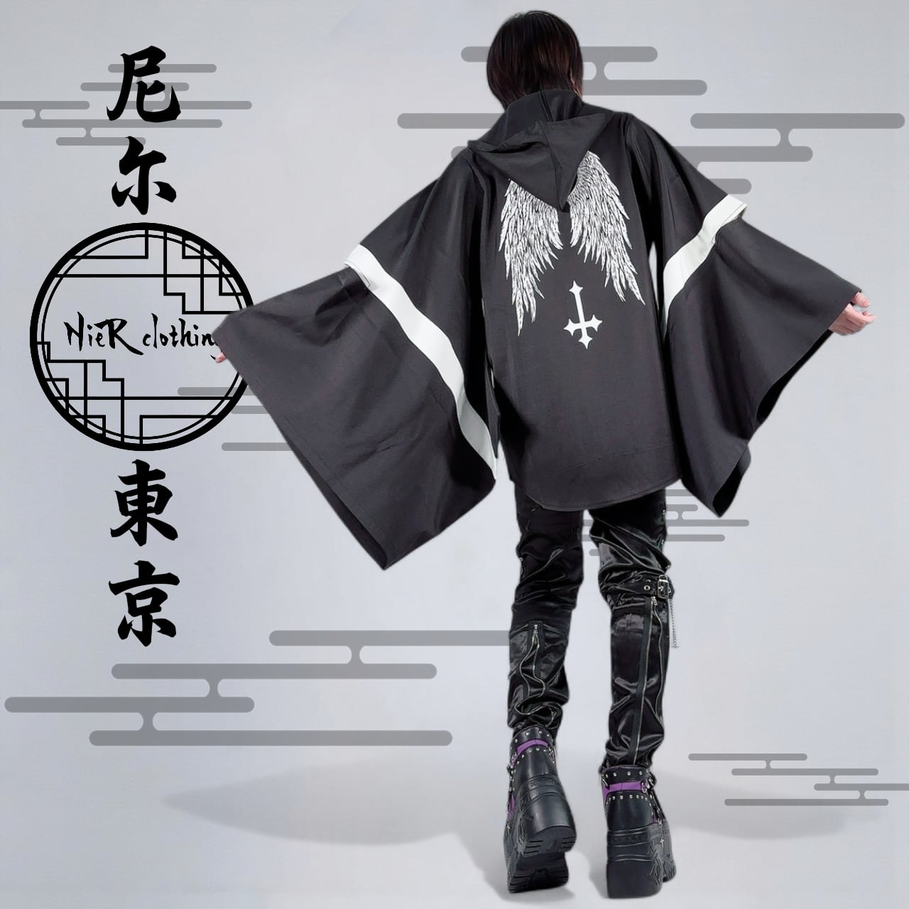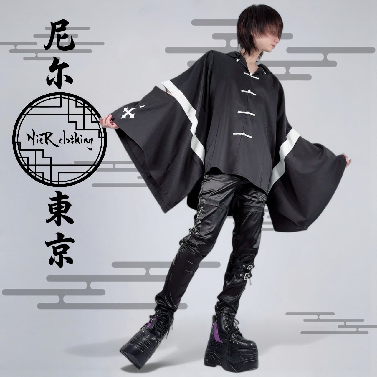袖はゆったりと広がる着物風袖で、クロスモチーフが印象的に映えます。