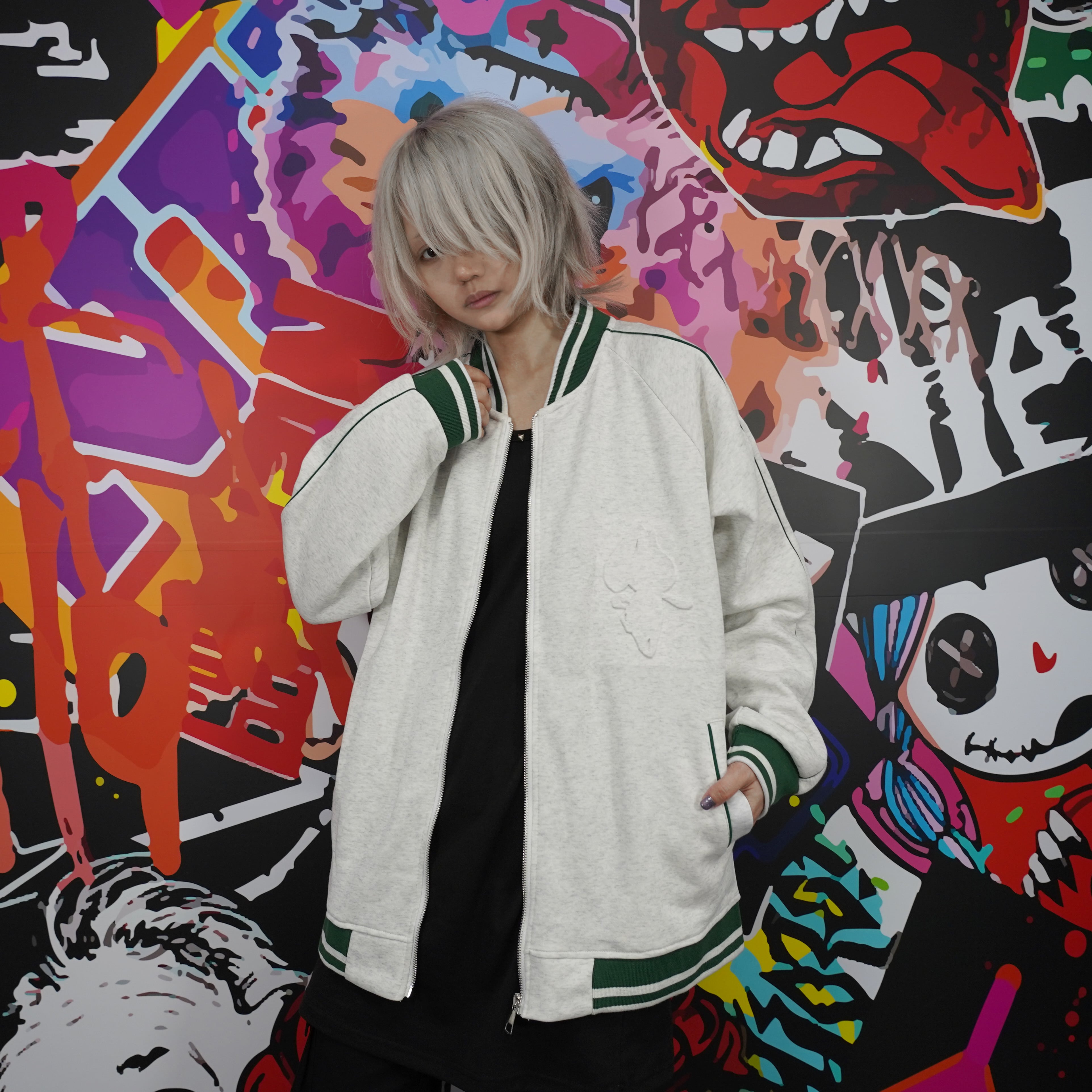 ライトグレーのボディに映えるグリーンラインの襟・袖・裾リブが、全体の印象を引き締め、スポーティーかつストリートな雰囲気を演出✩