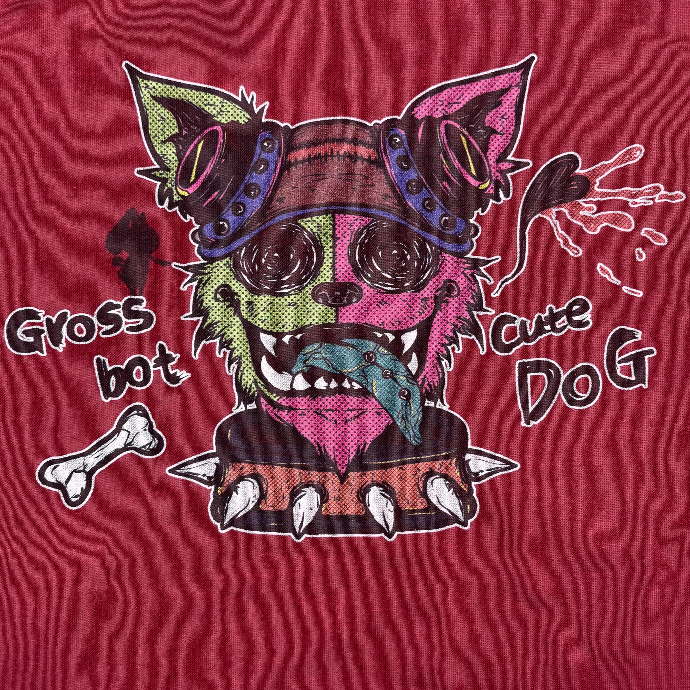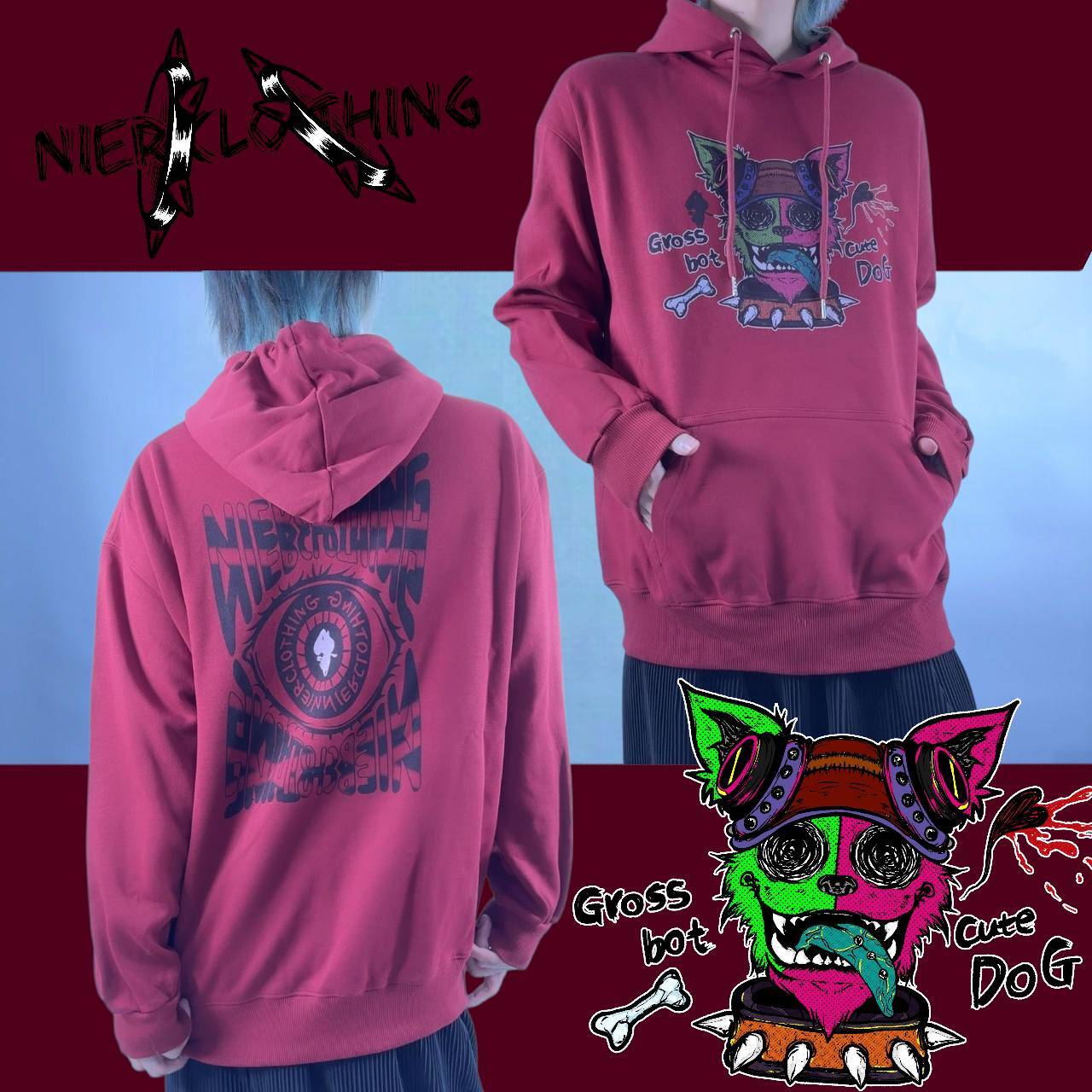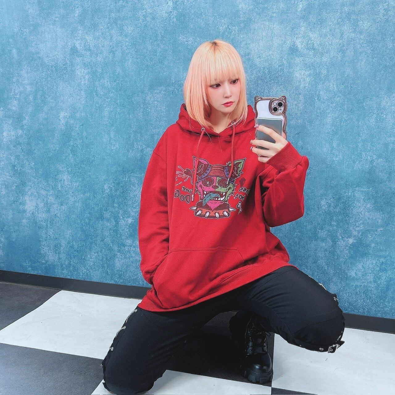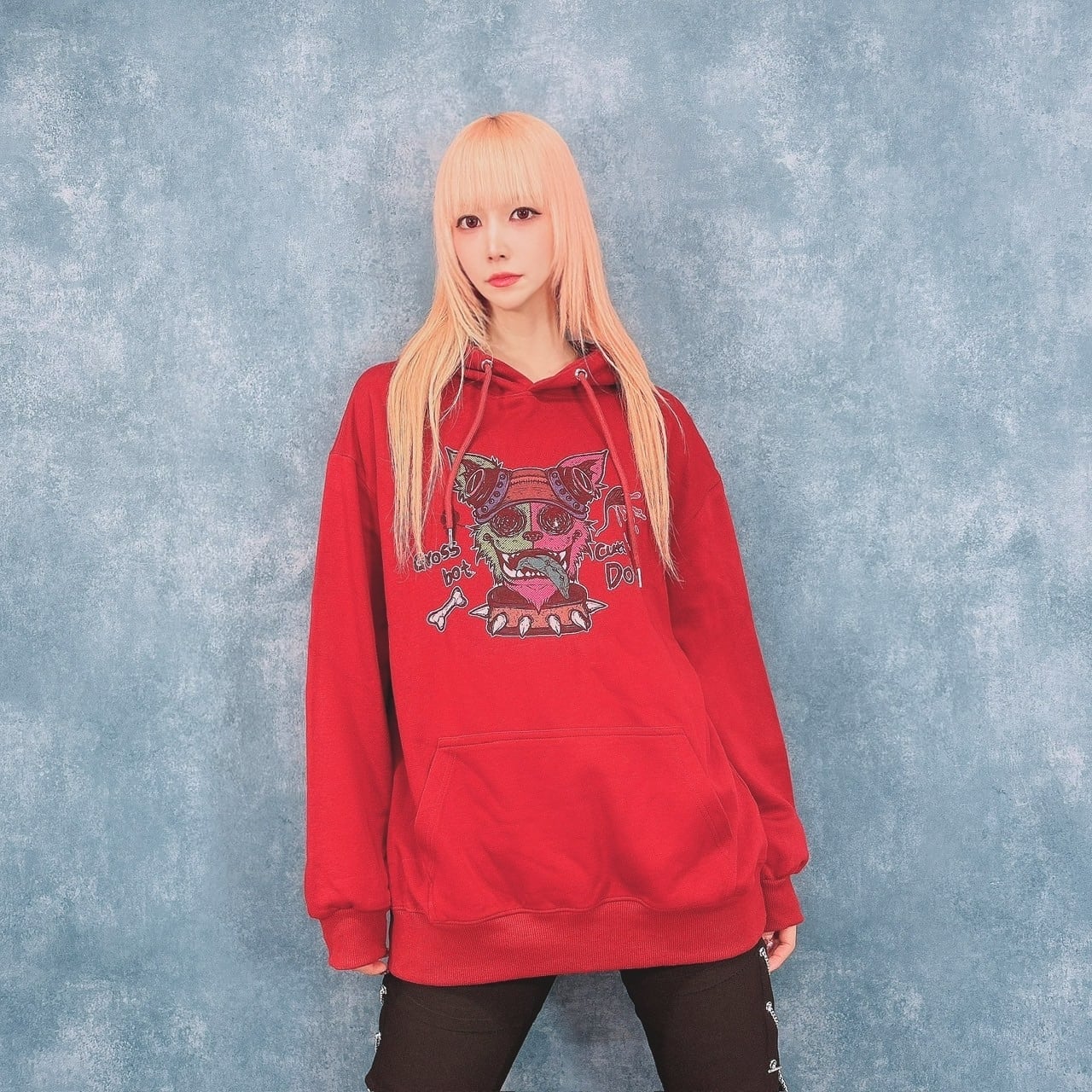 毒っぽくて愛らしい犬が主役のフードパーカーとなります。
