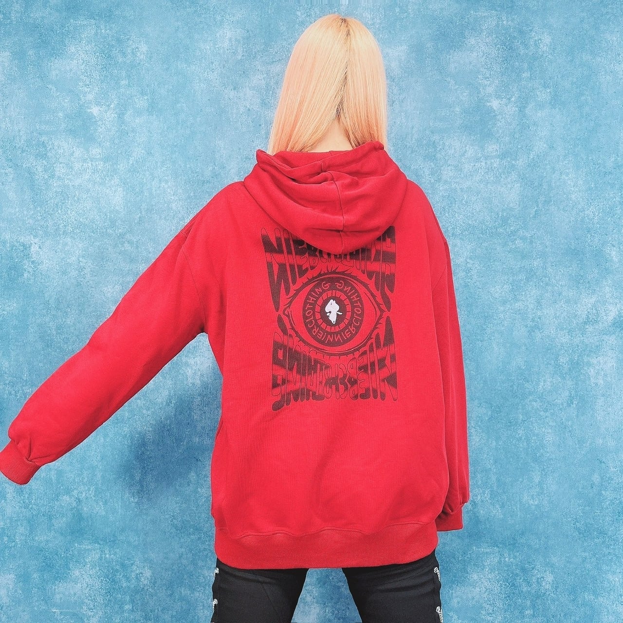 背面は歪んだタイポと目をモチーフにしたビッグプリントで、振り向いた瞬間まで抜かりなく主張します。