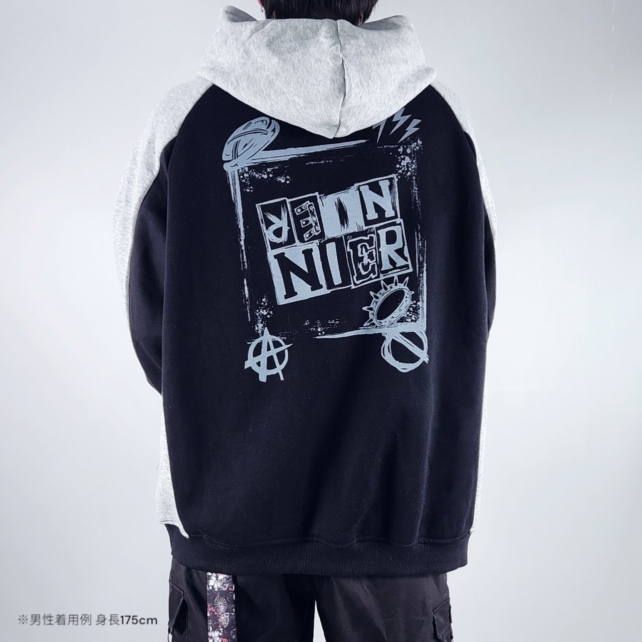 バックはコラージュ風NIERグラフィックに首輪やボタンなどのモチーフを散りばめ、1枚でストリート感と反骨ムードを纏えます。
