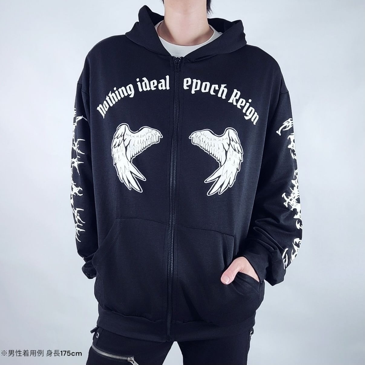 印象的なメッセージが胸元に刻まれた、存在感あるジップパーカーとなっております。