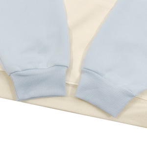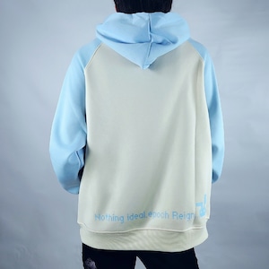 淡いブルーとアイボリーのバイカラーが爽やかな印象を与えるユニセックスパーカーとなります。