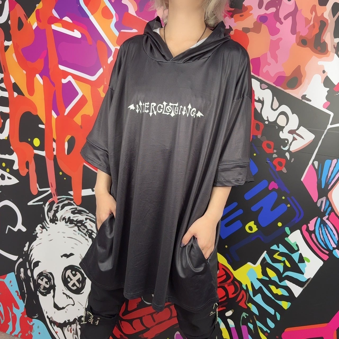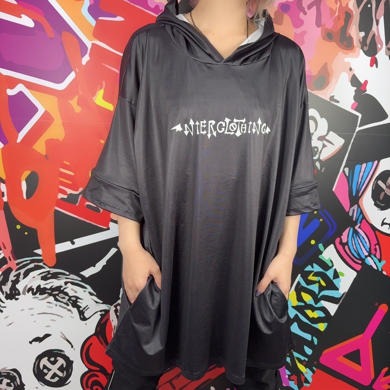微光沢のあるとろみ生地にフードをのせた、ユニセックス対応のオーバーサイズ2WAYトップスです。