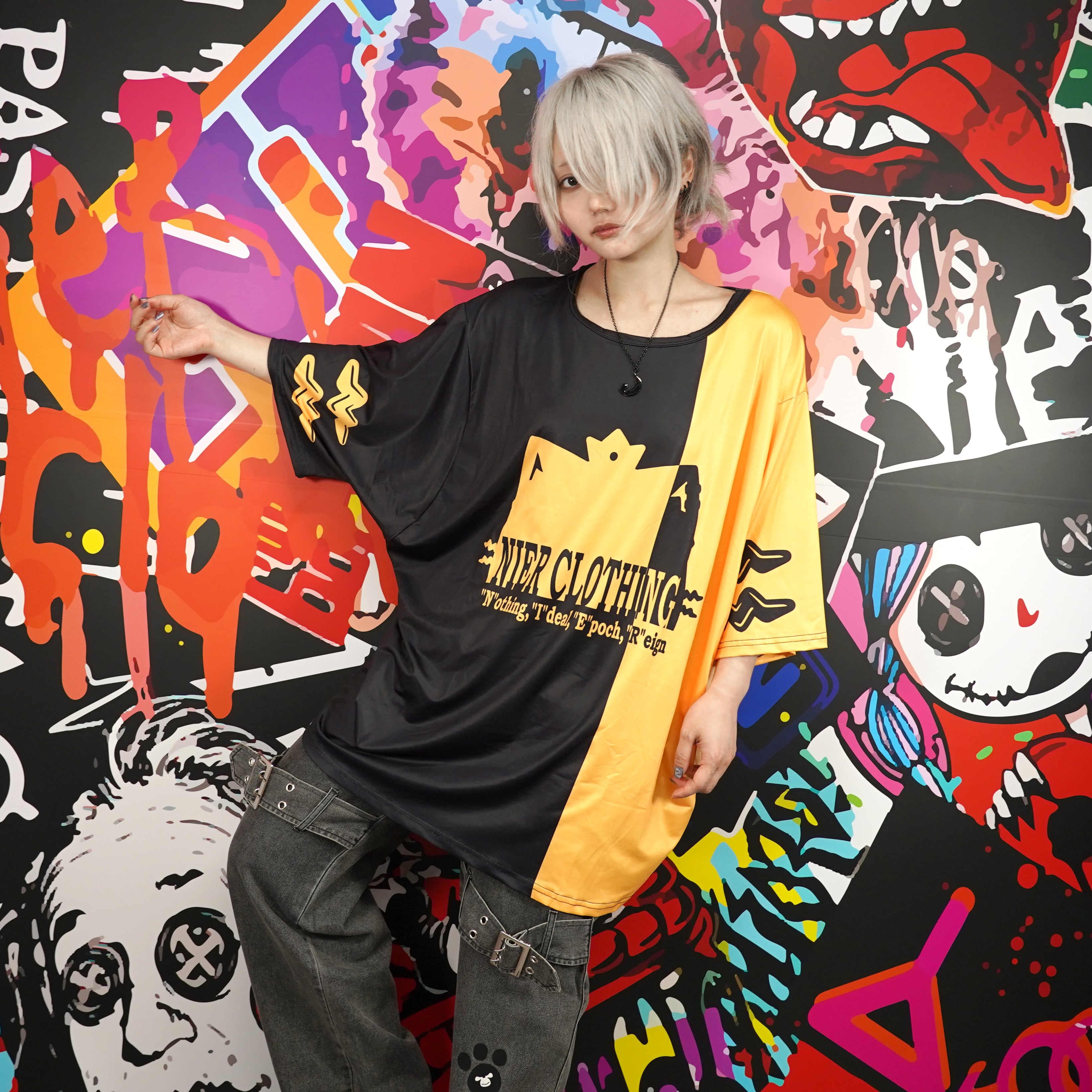 ミケシルエットの大胆なグラフィックと「NIER CLOTHING」ロゴを配置。