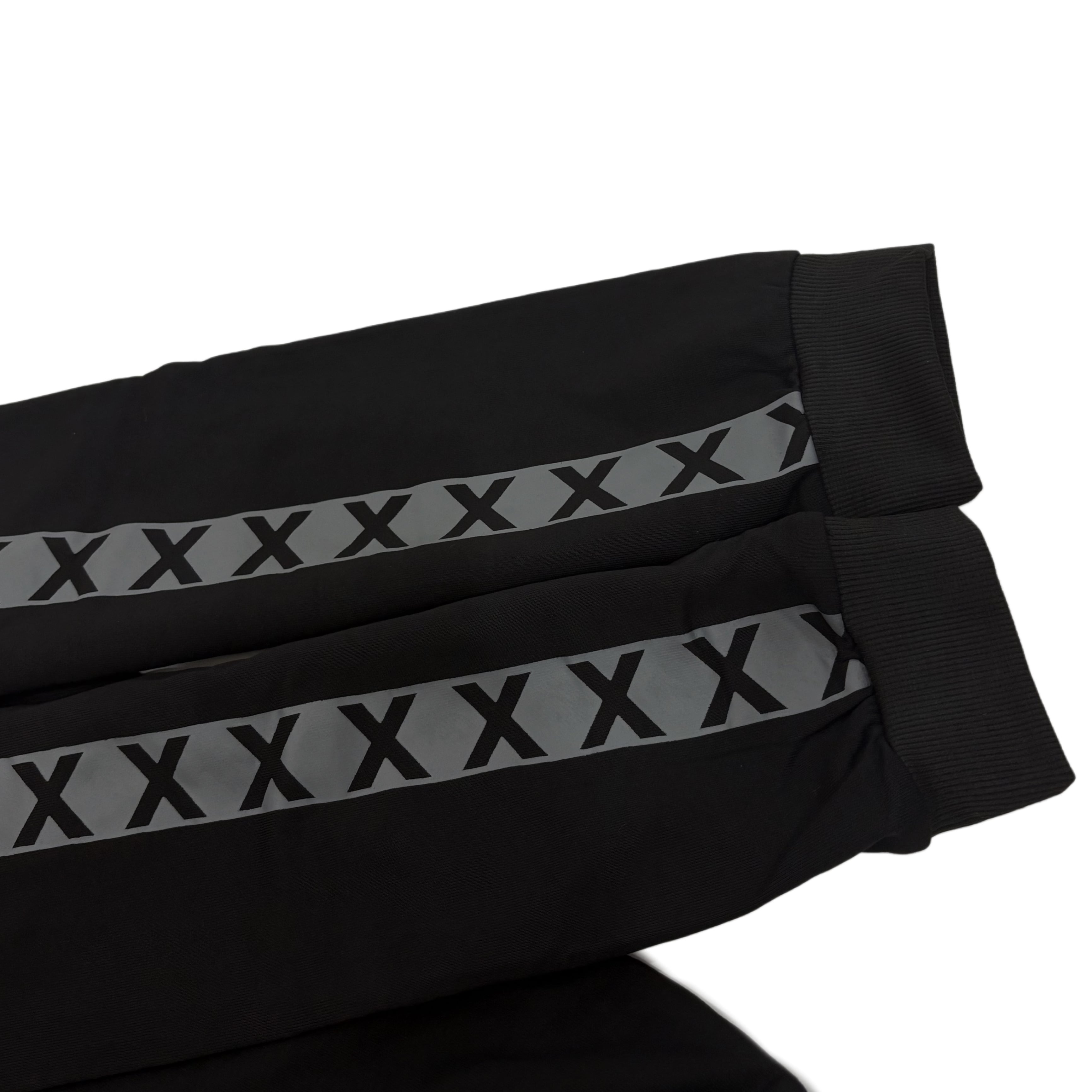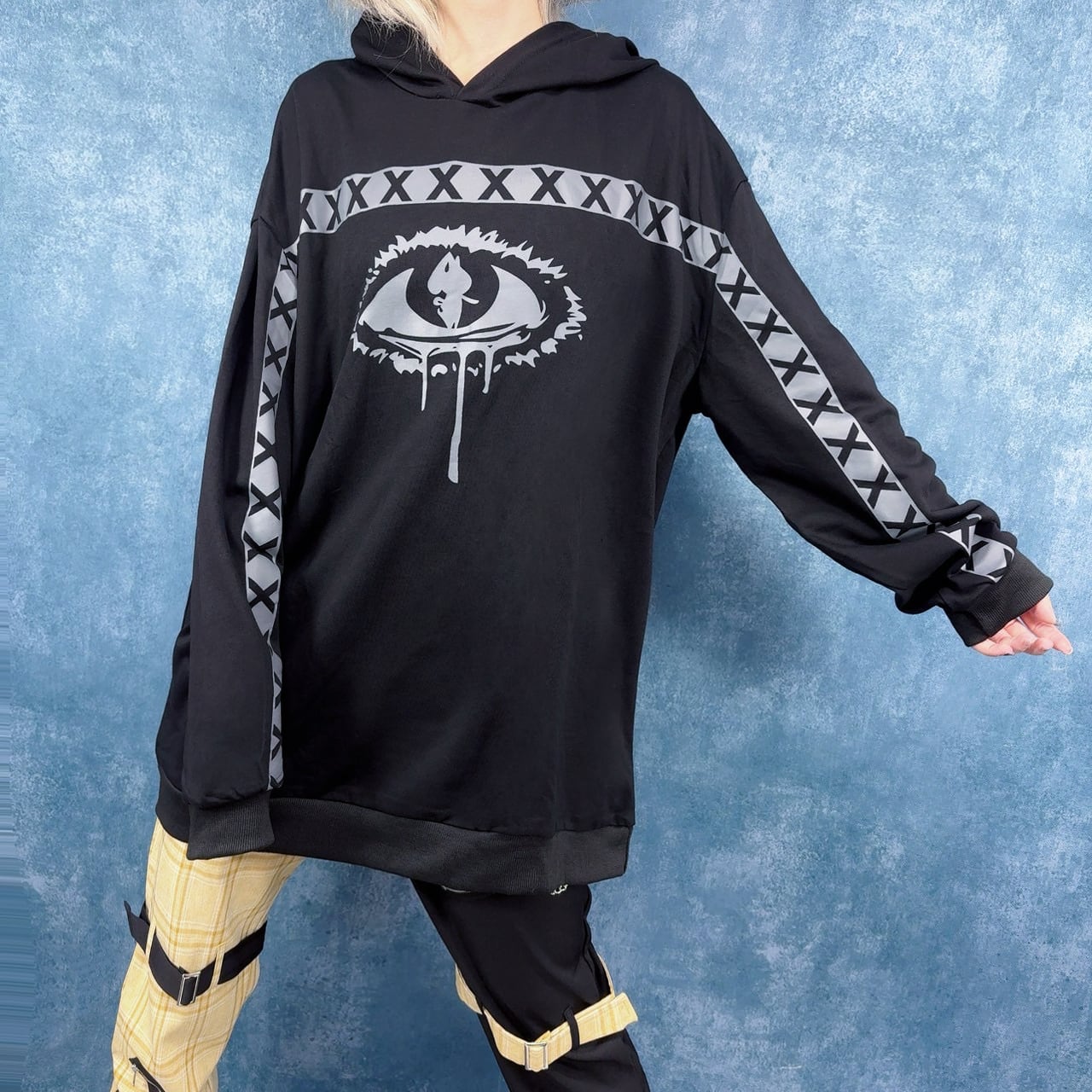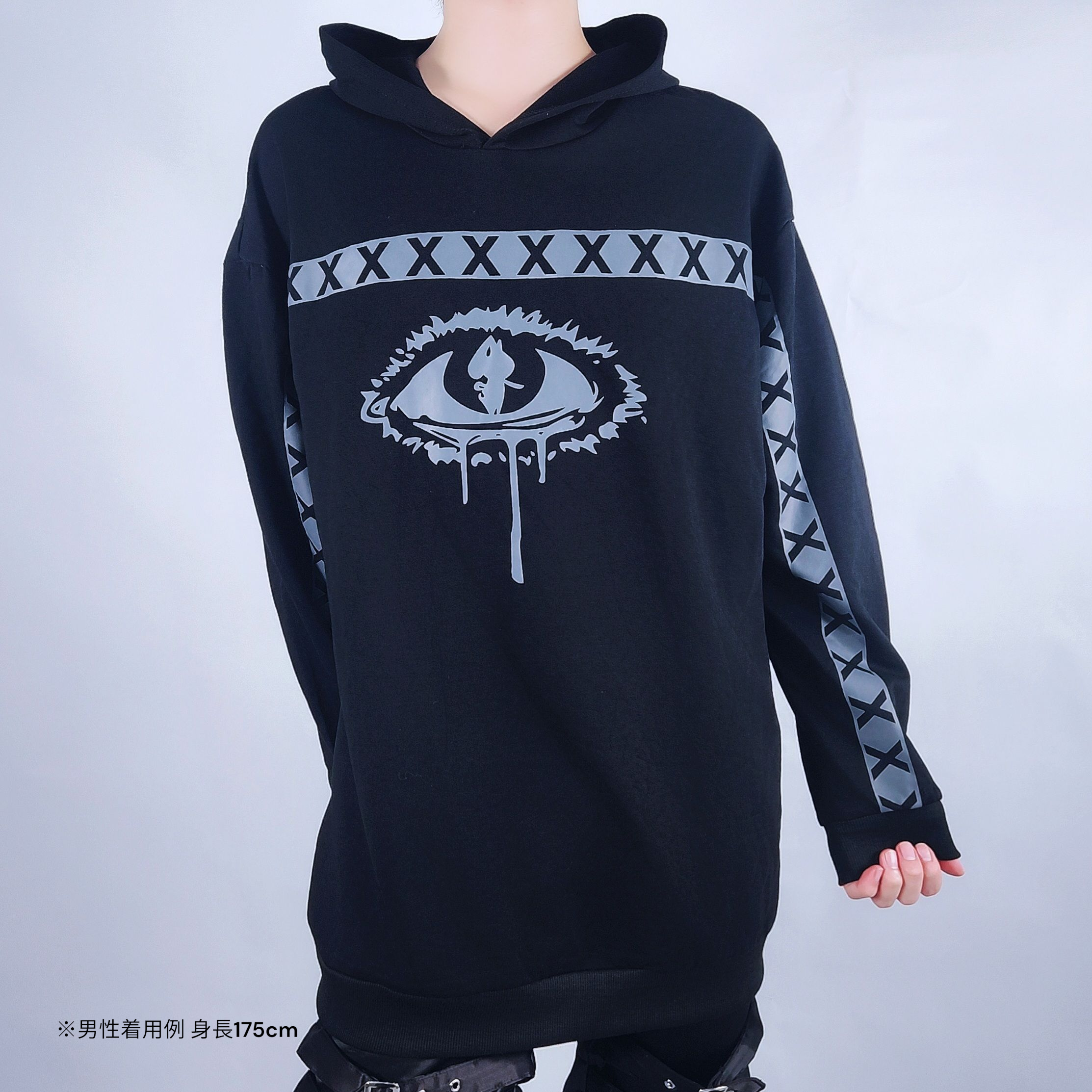 両袖から胸にかけては存在感ある「X」ラインが走り、ストリート感とダークな雰囲気を演出します。