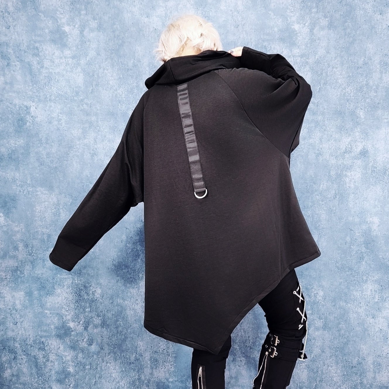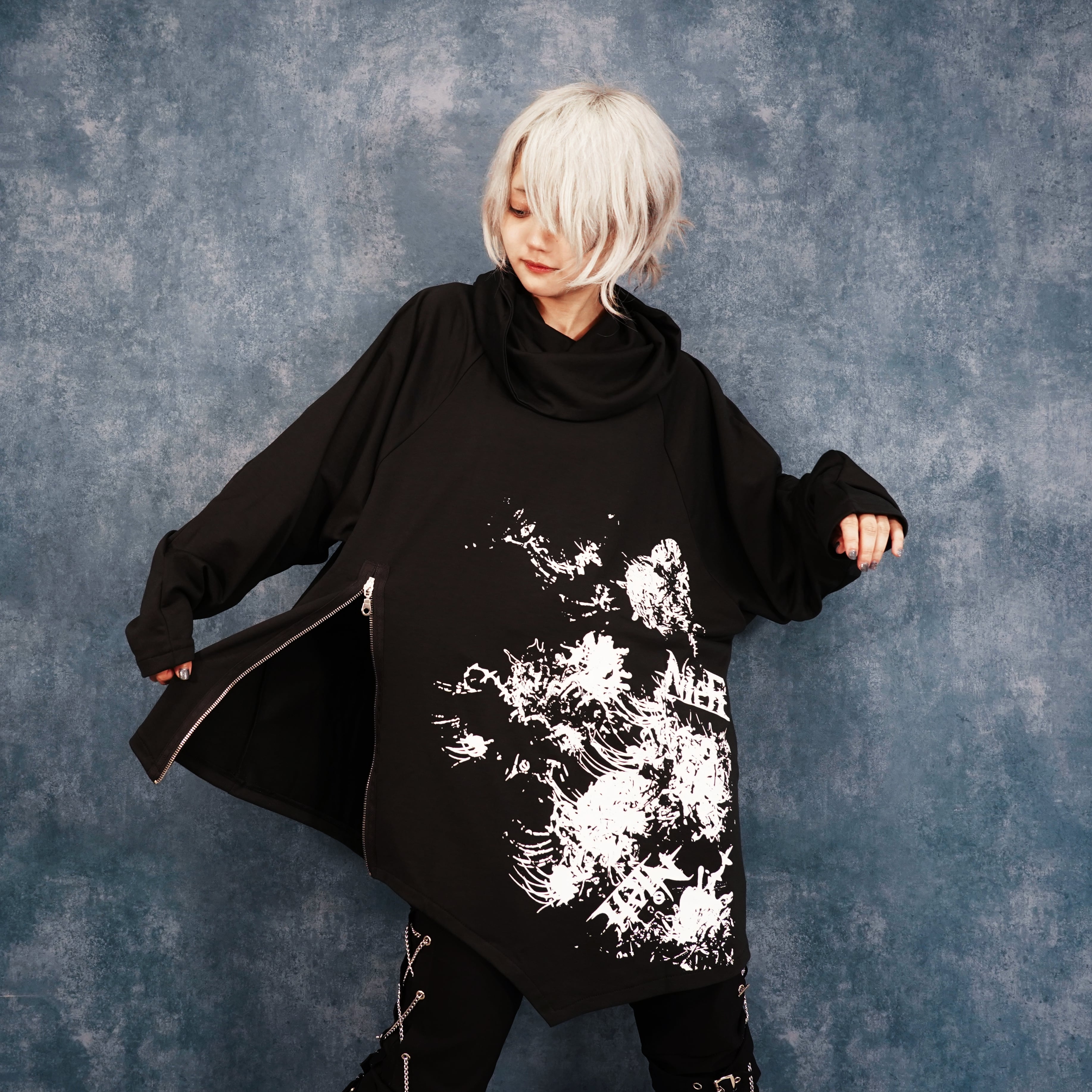 モノトーンの衝撃を纏う、ビッグシルエットのアシメトリートップスとなります。