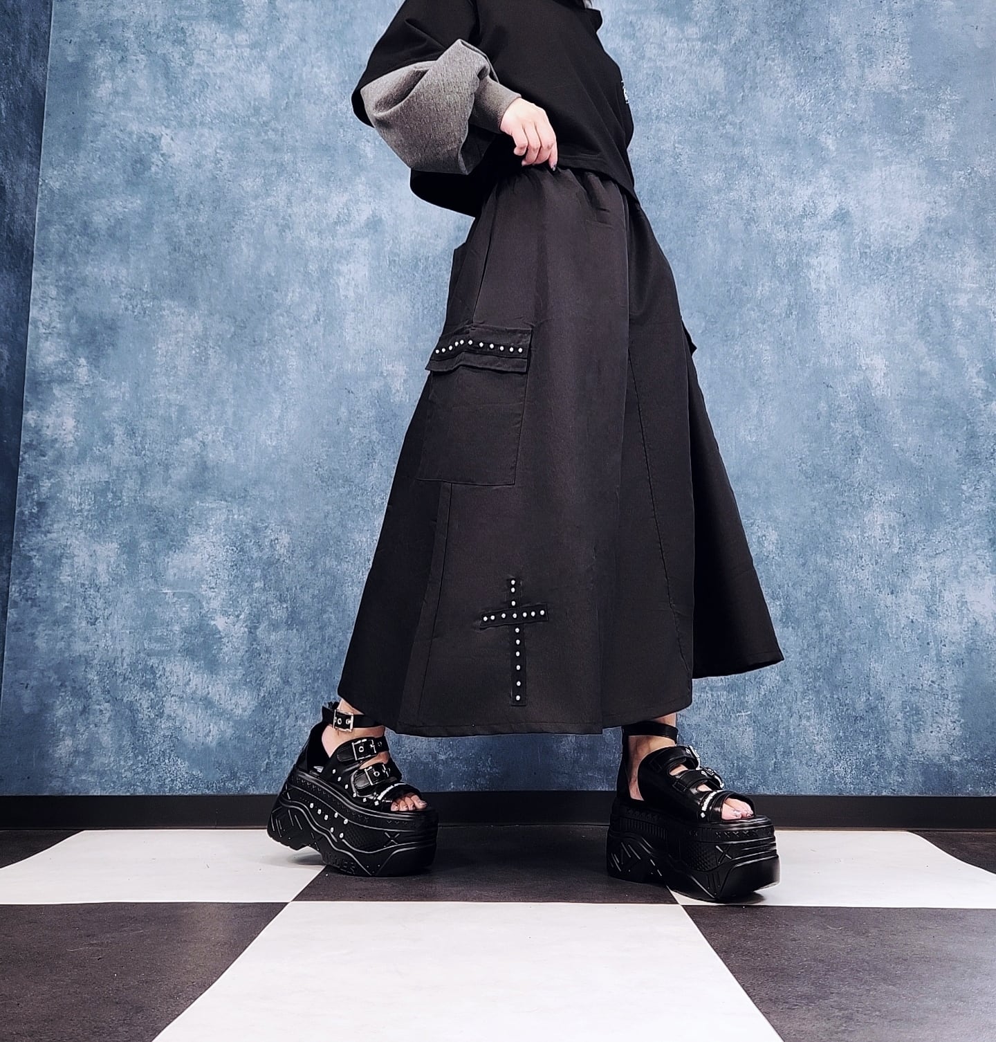 さらに裾部分にはクロスモチーフのスタッズ装飾をあしらい、ゴシックかつストリート感漂う仕上がりになっています。