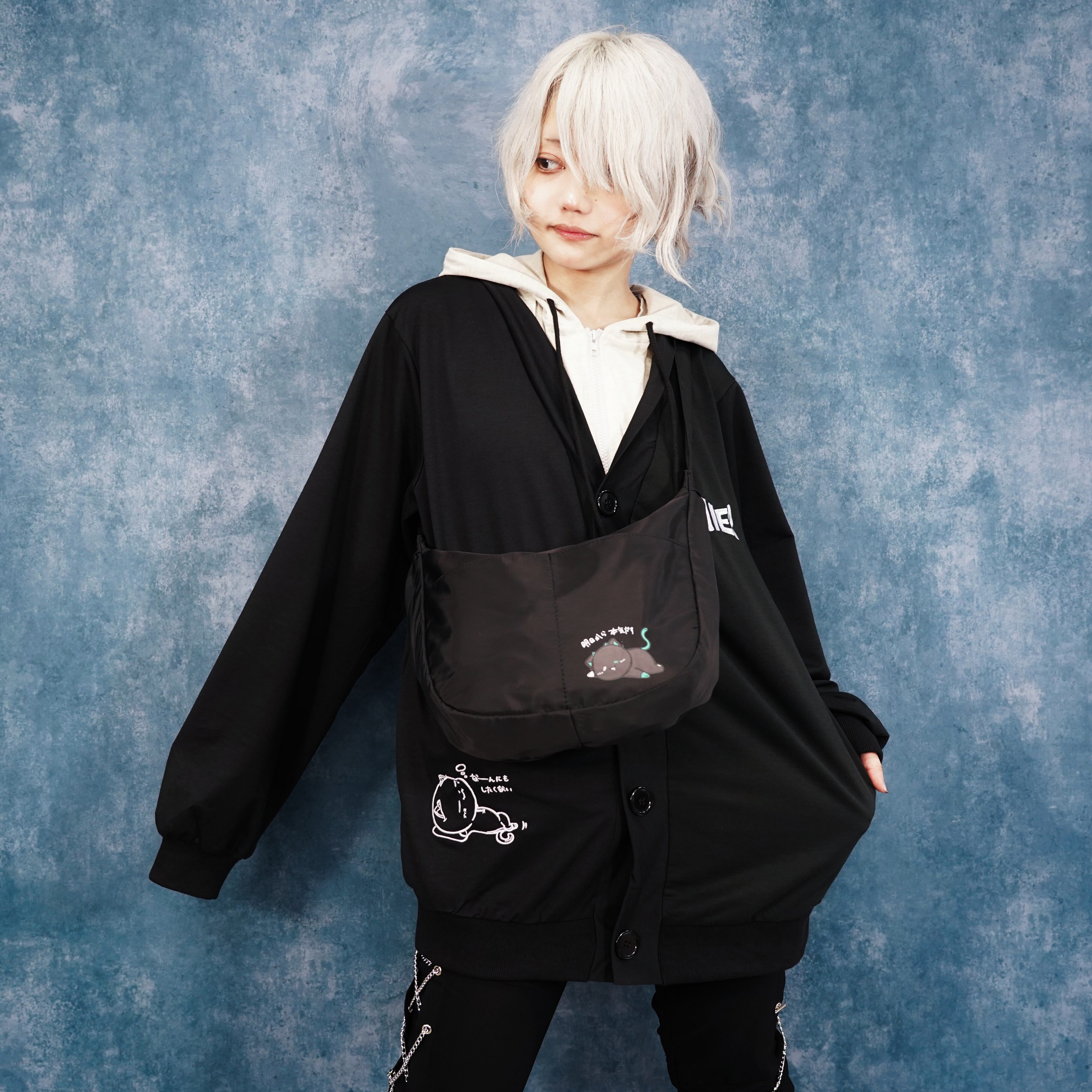 シンプルなブラックボディに、寝そべるシエルのプリントがワンポイントで施されたショルダーバッグです。