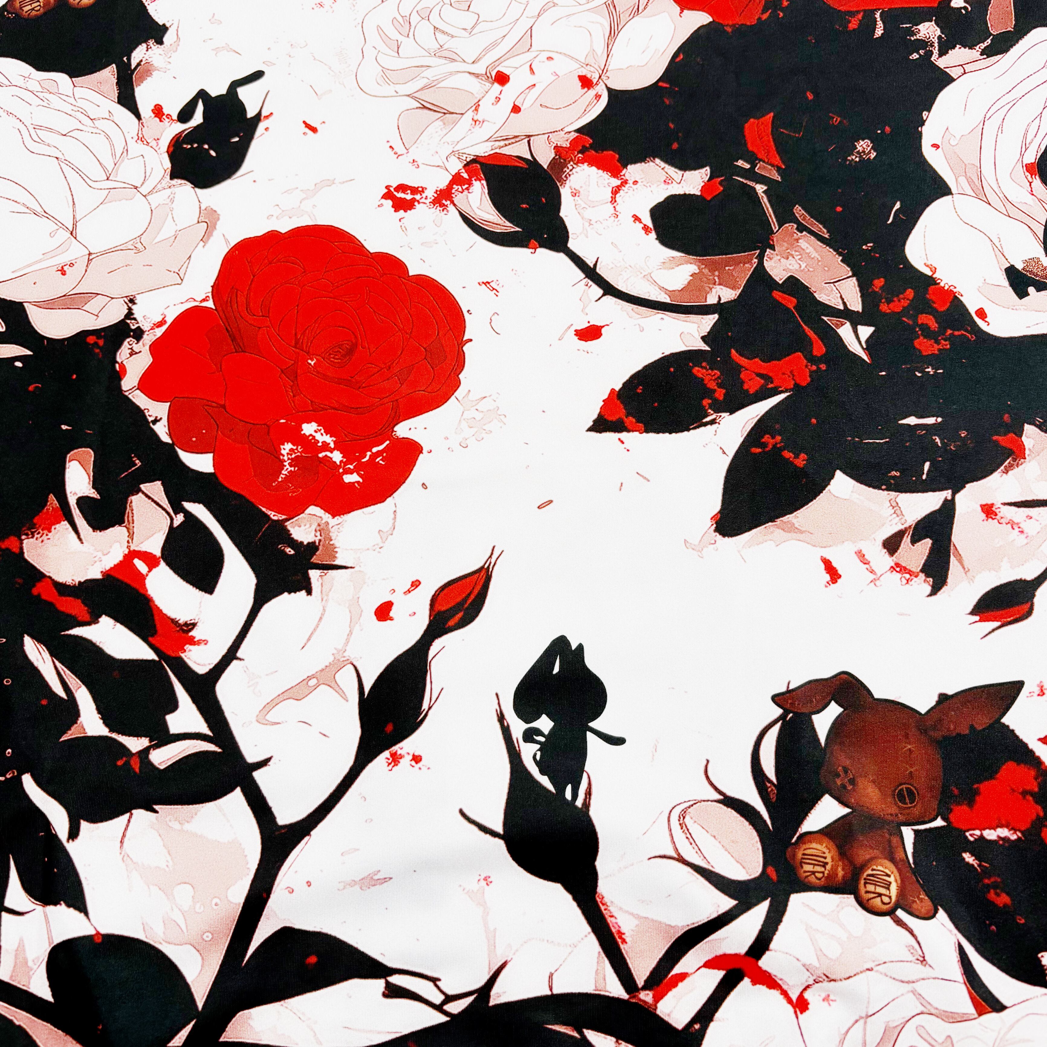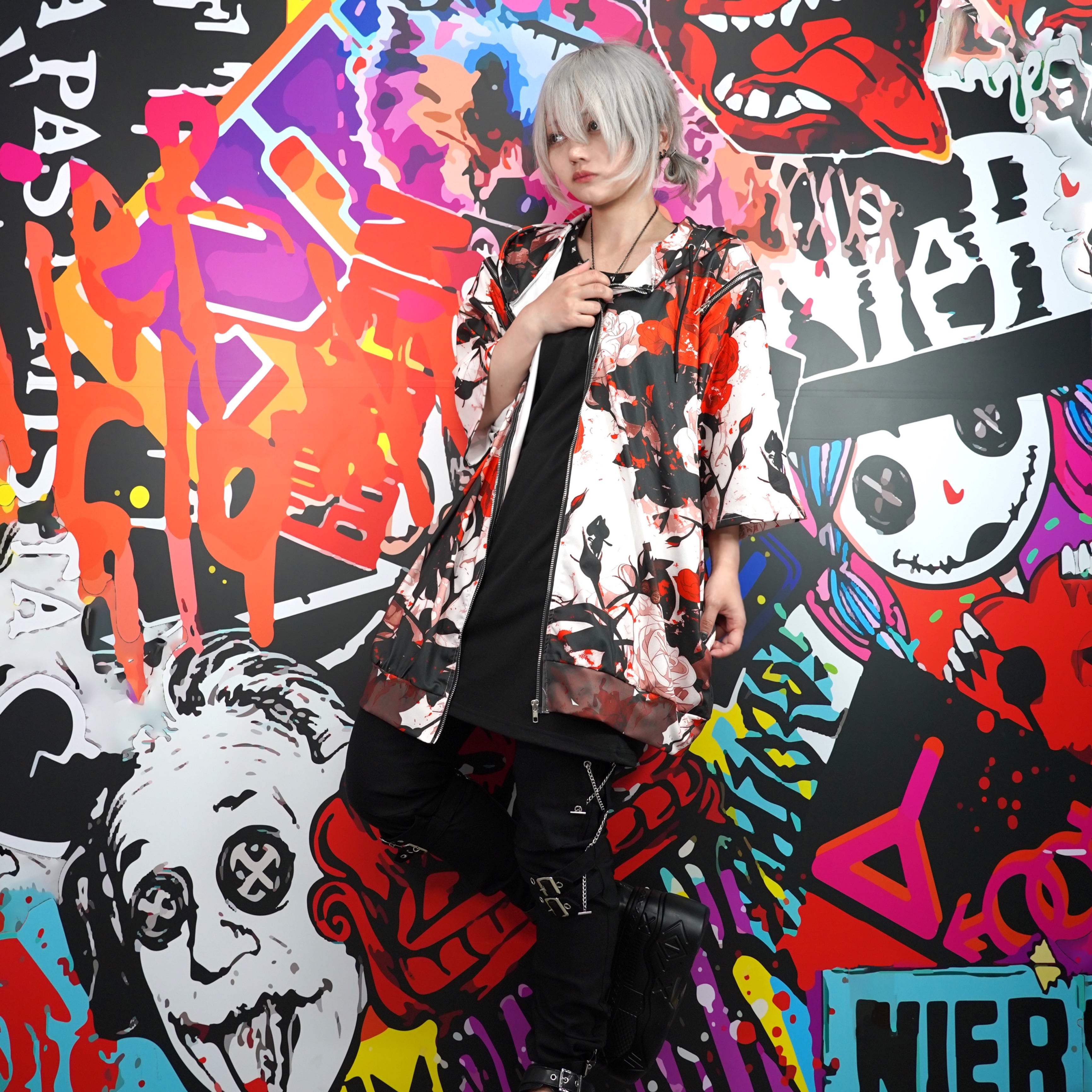 全面に描いた赤×白のローズとスプラッシュ柄が、視線を奪うショートスリーブの2WAYジップアウターです。