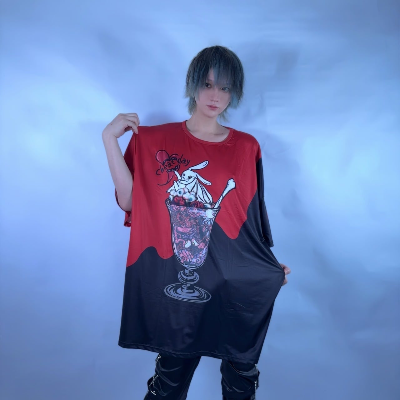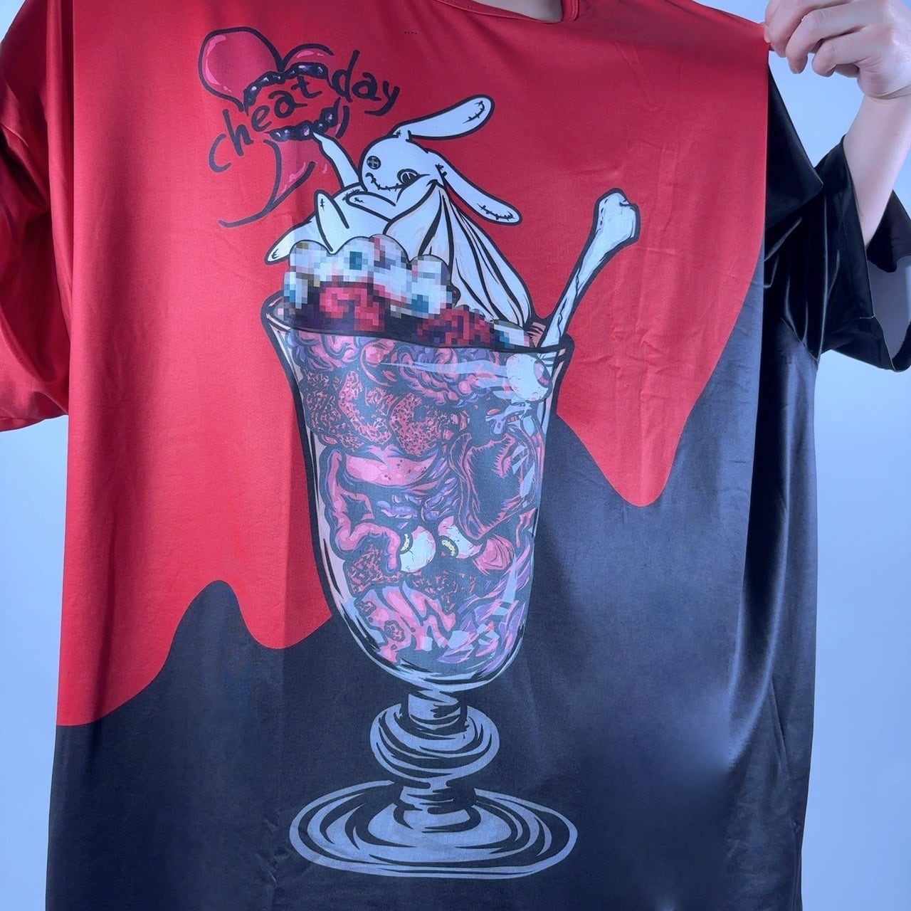 レッド×ブラックのツートーンに、臓物パフェとNIERちゃんのアートを大胆プリント。