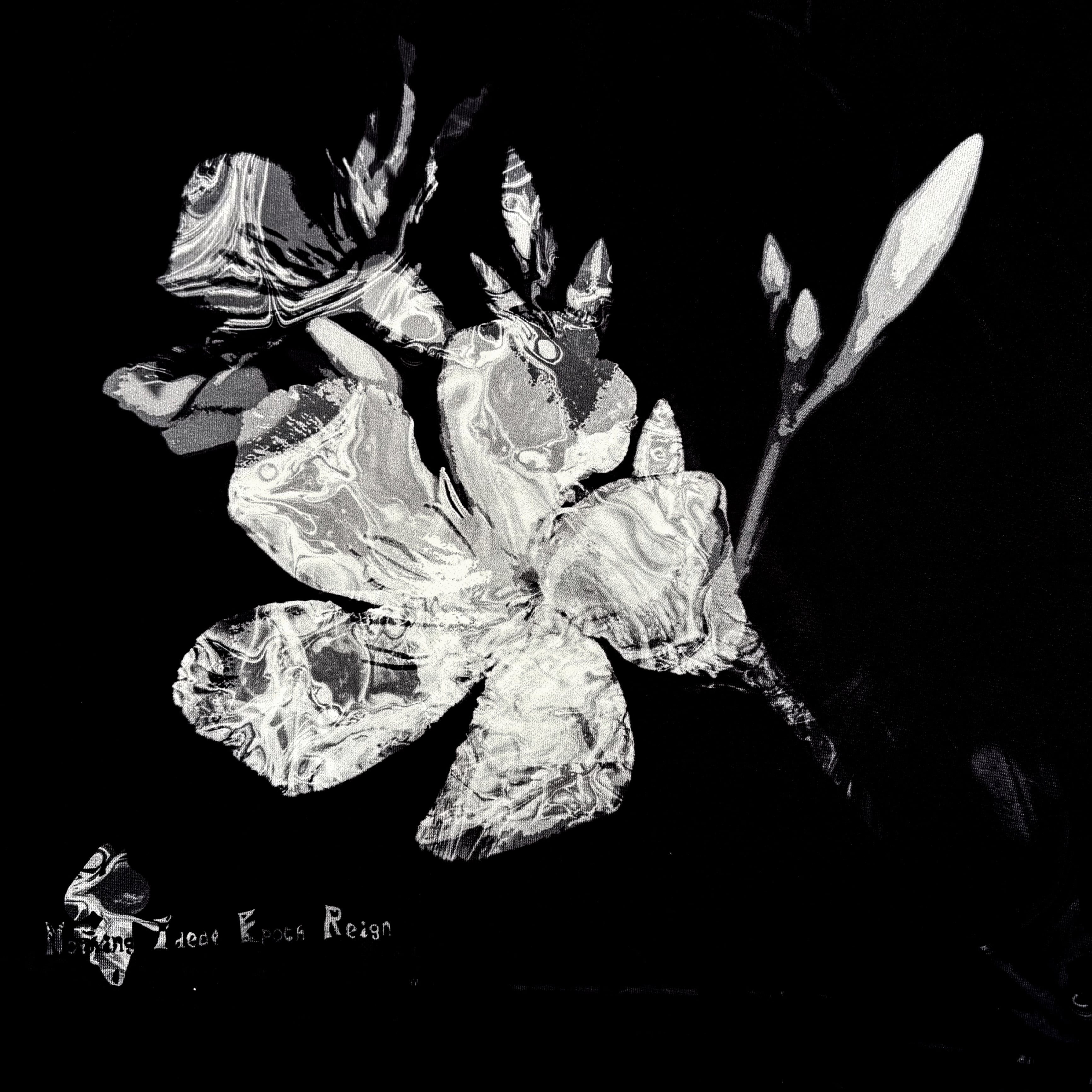 深いブラックに前面はモノクロの花、背面には渦・EYE・和柄アートを大胆に配したオーバーサイズトップスです。