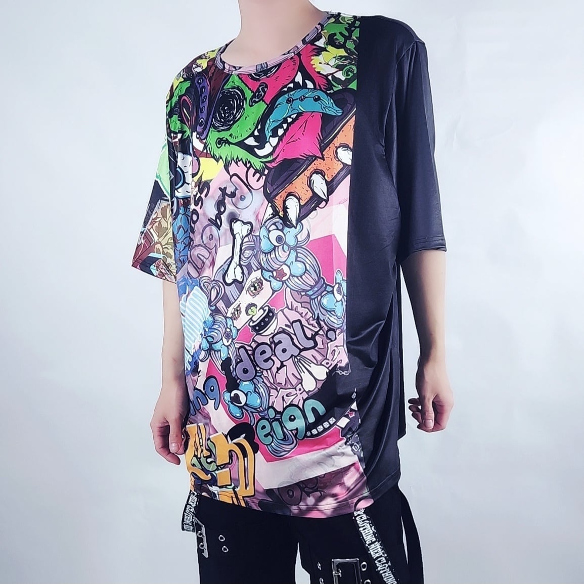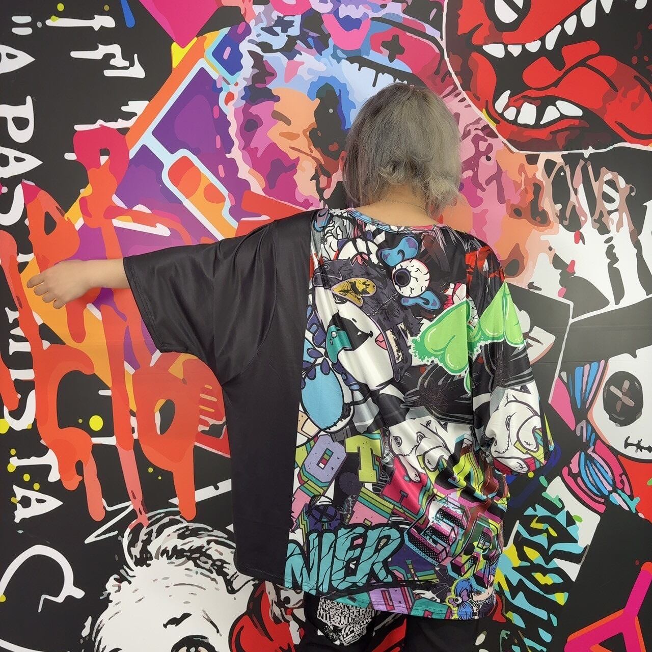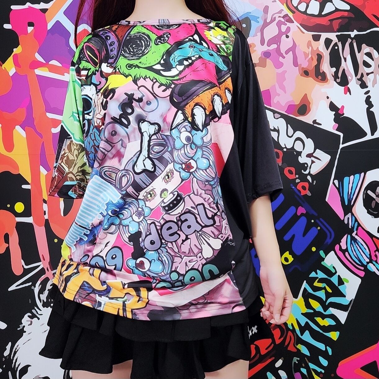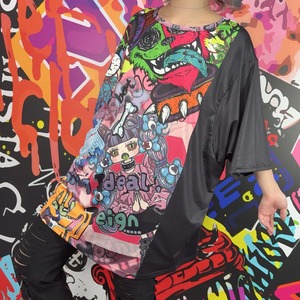 ポップで遊び心あふれるグラフィックが全面にデザインされたビッグシルエットトップスです。