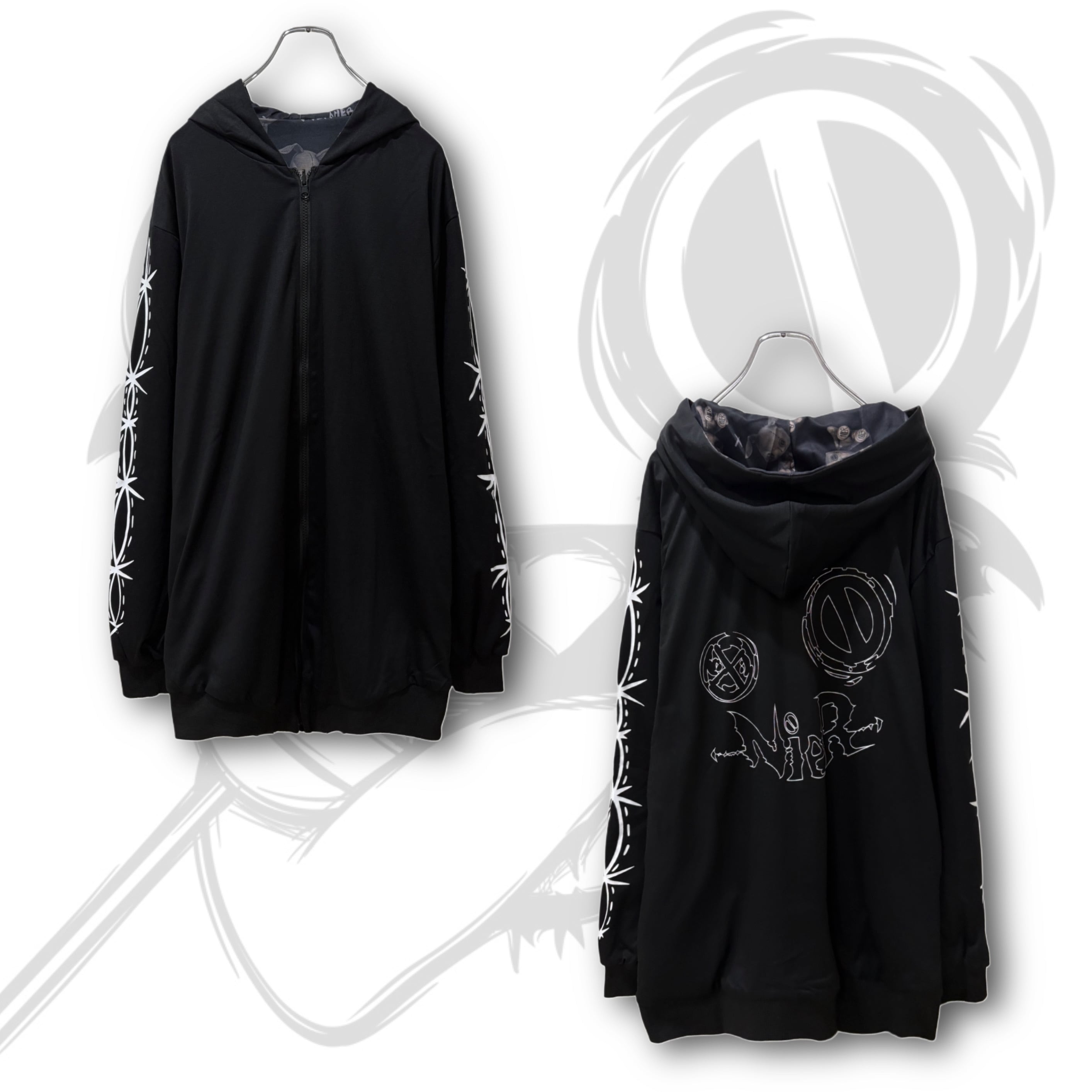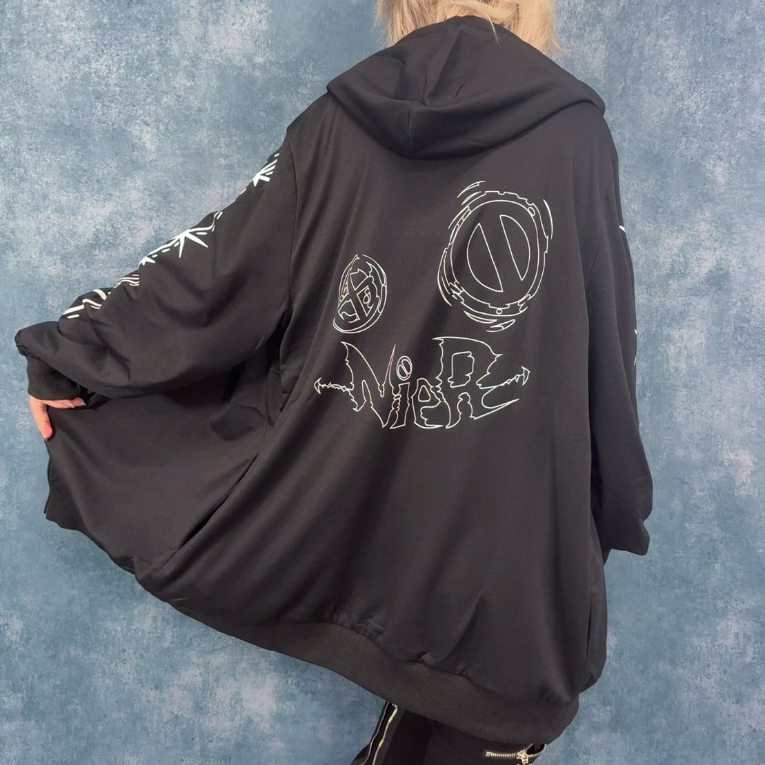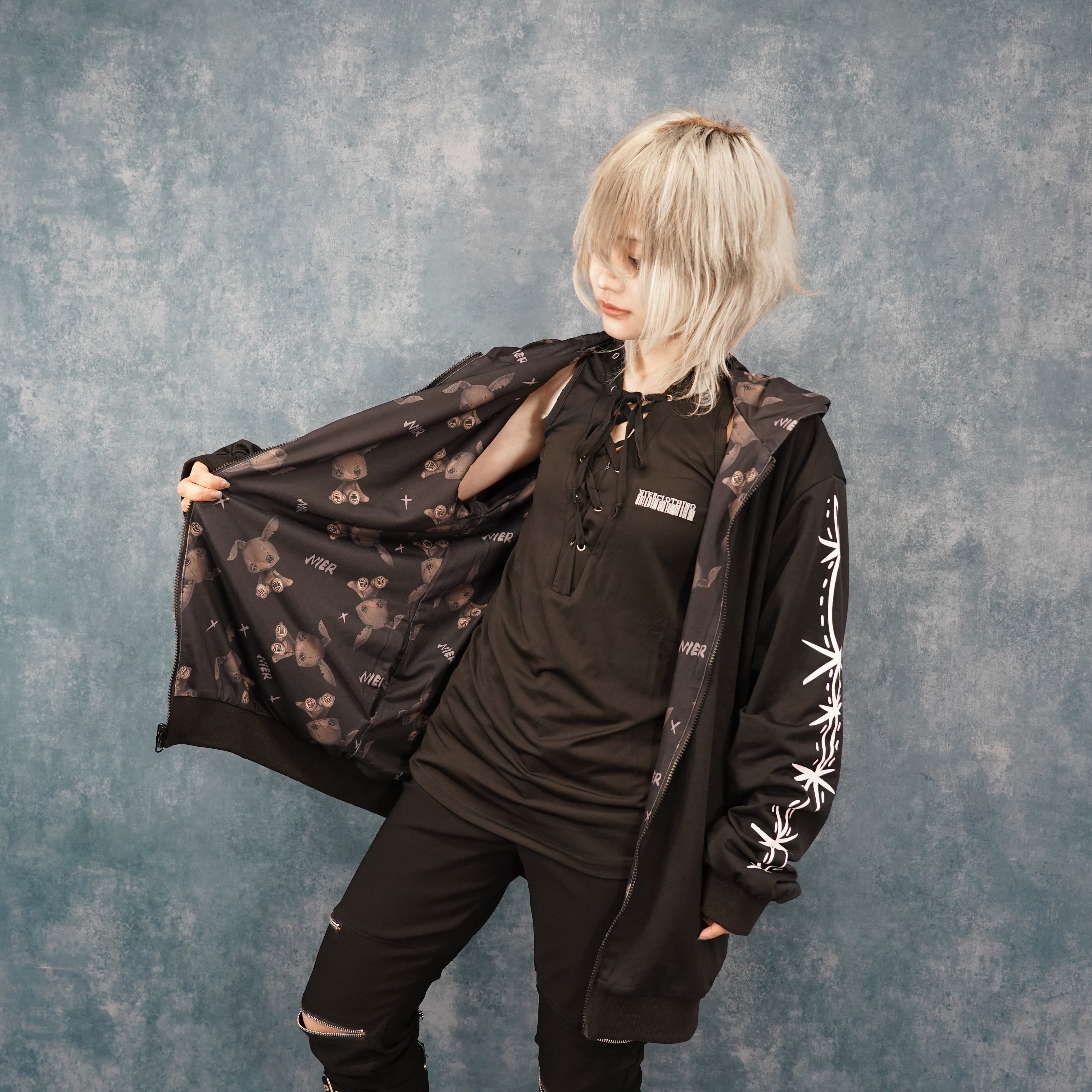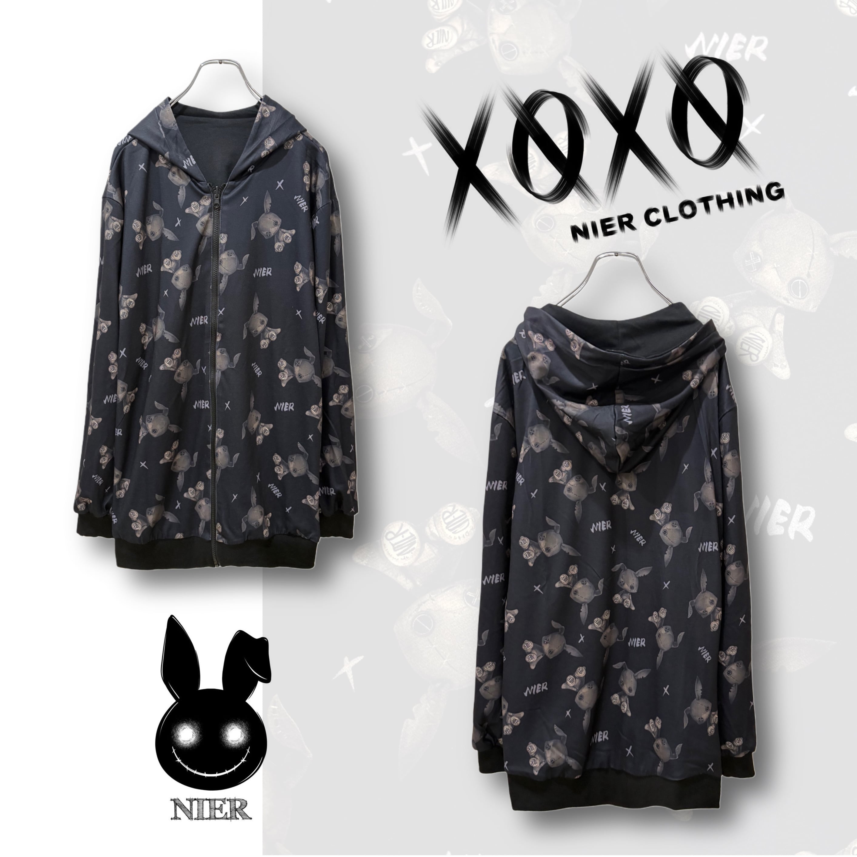 もう片面は袖の縫い目風プリントと背面の大胆なNIER FACEロゴグラフィックが印象的なクールデザイン。