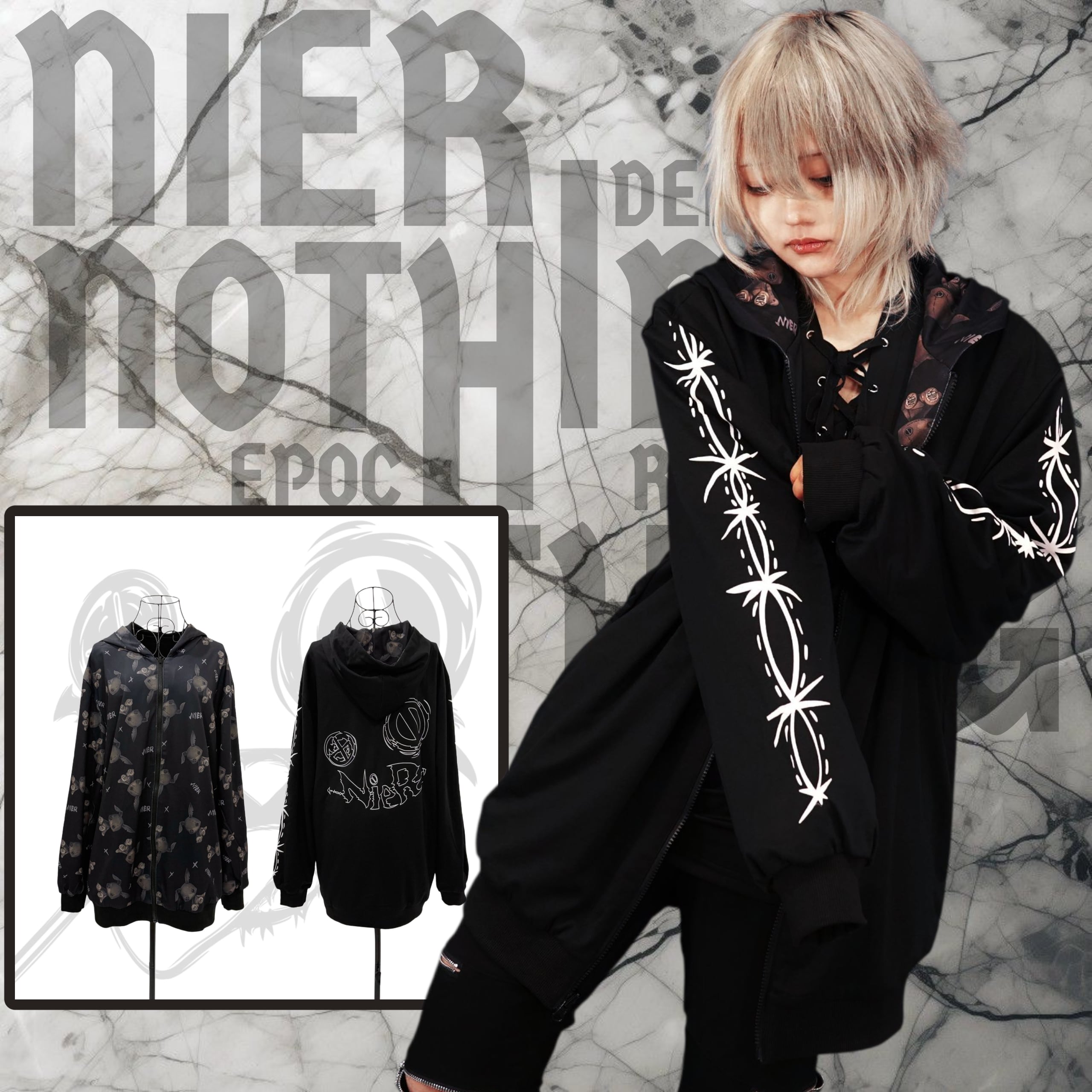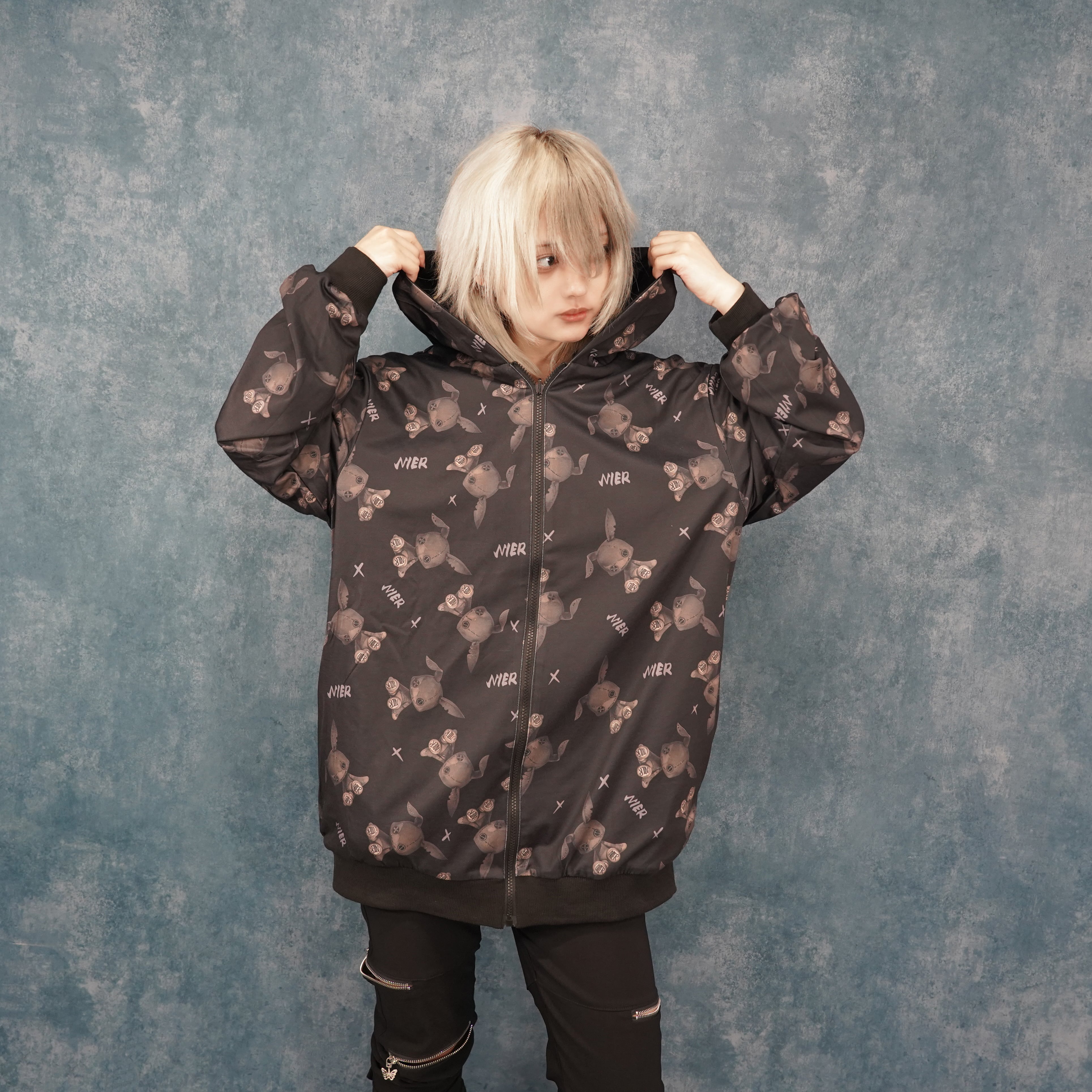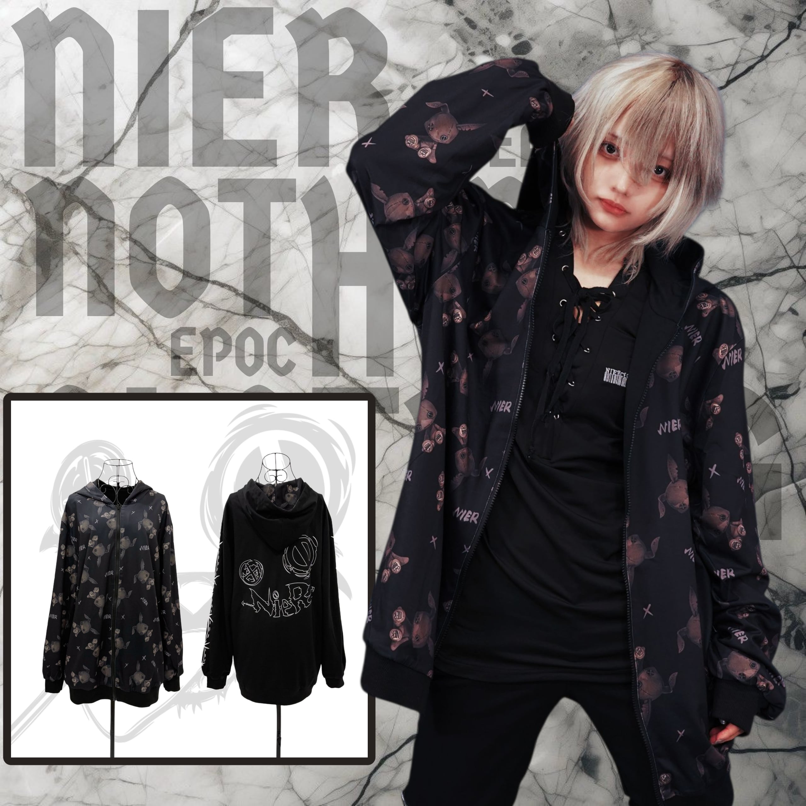 もう片面は袖の縫い目風プリントと背面の大胆なNIER FACEロゴグラフィックが印象的なクールデザイン。