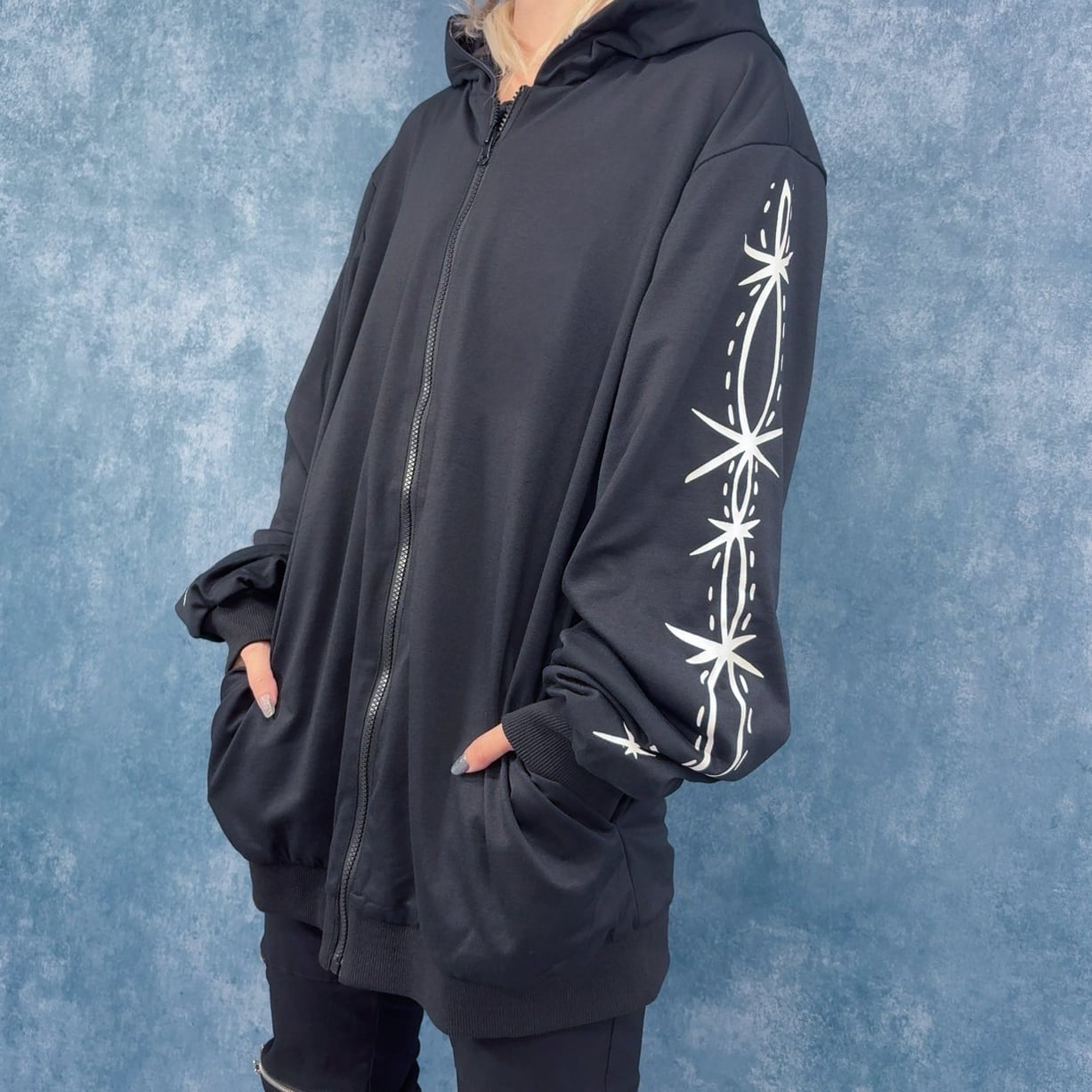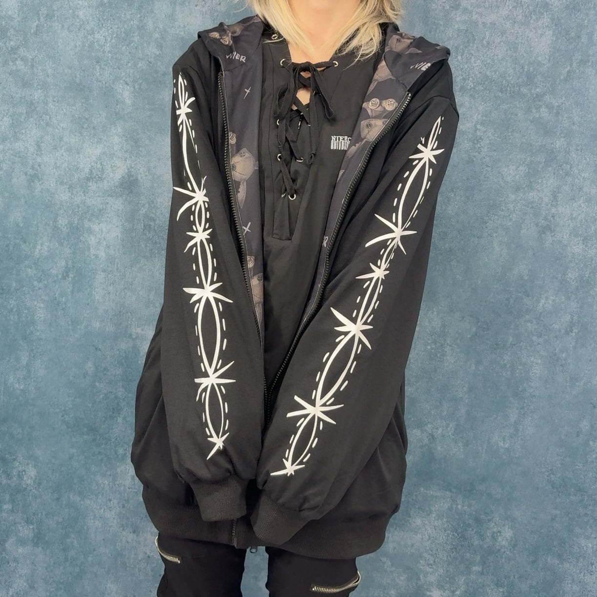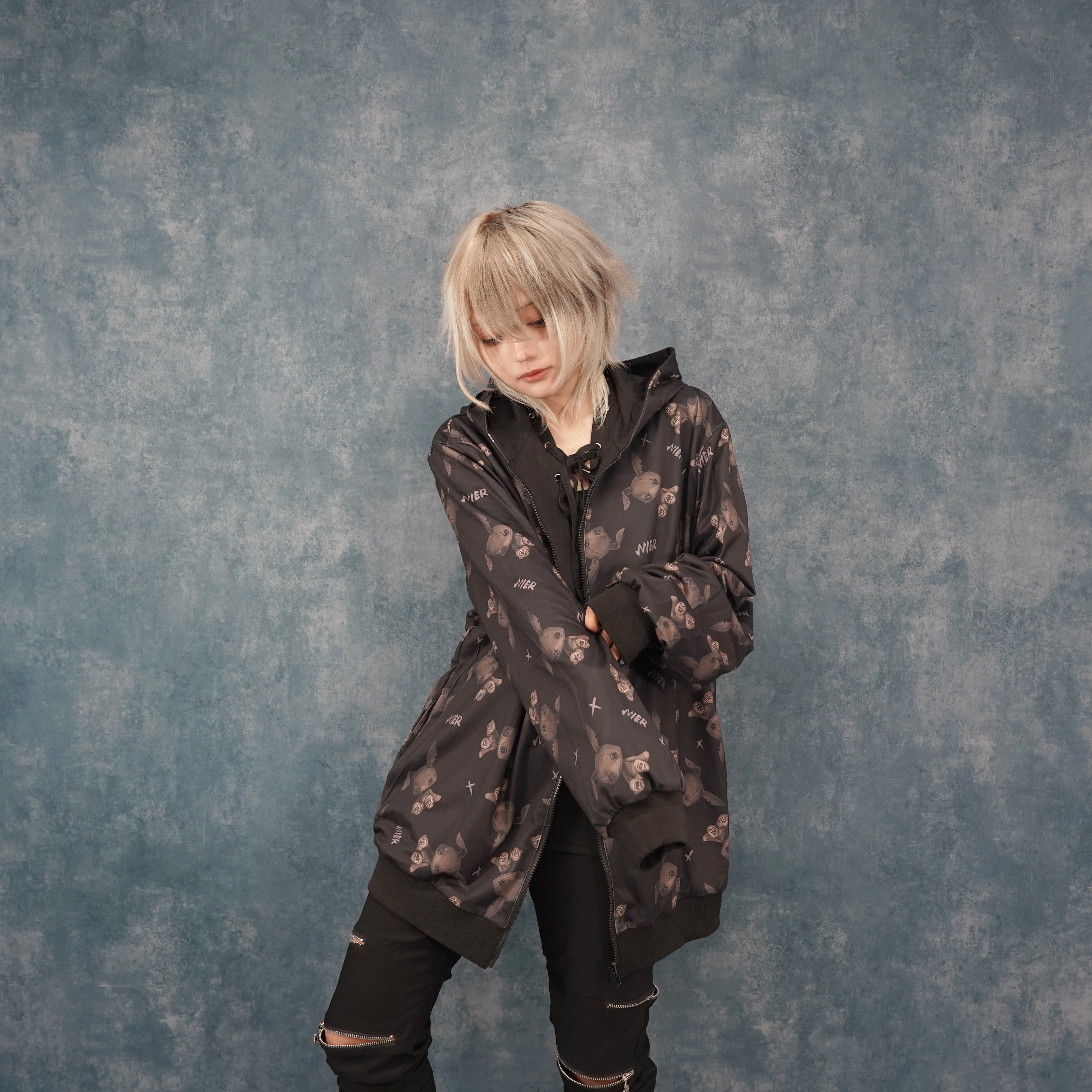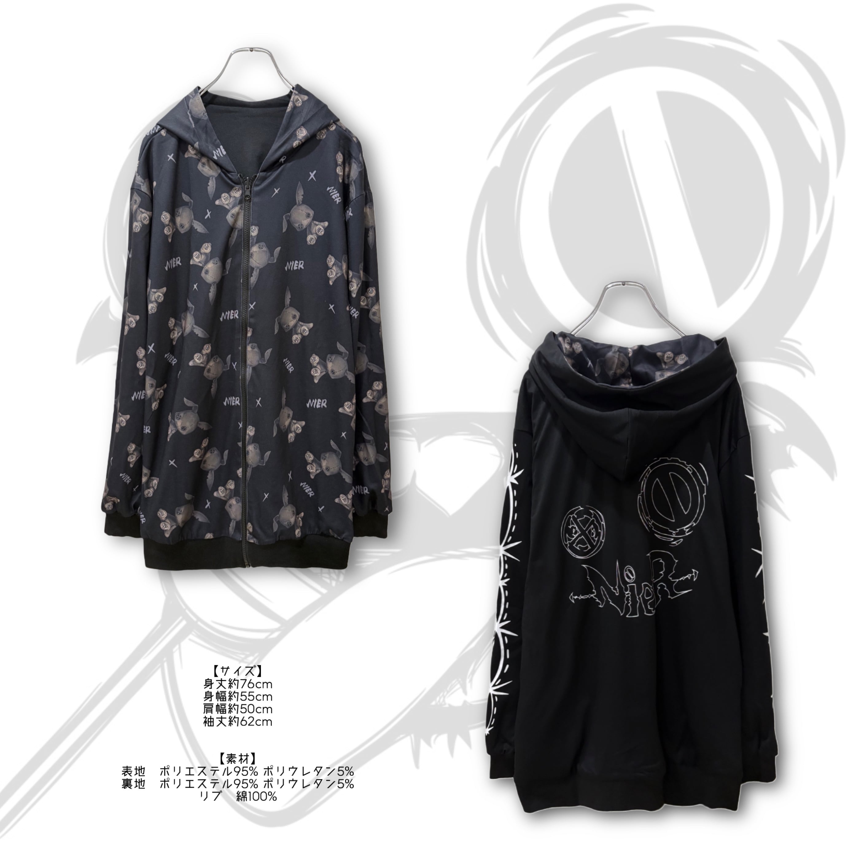 もう片面は袖の縫い目風プリントと背面の大胆なNIER FACEロゴグラフィックが印象的なクールデザイン。