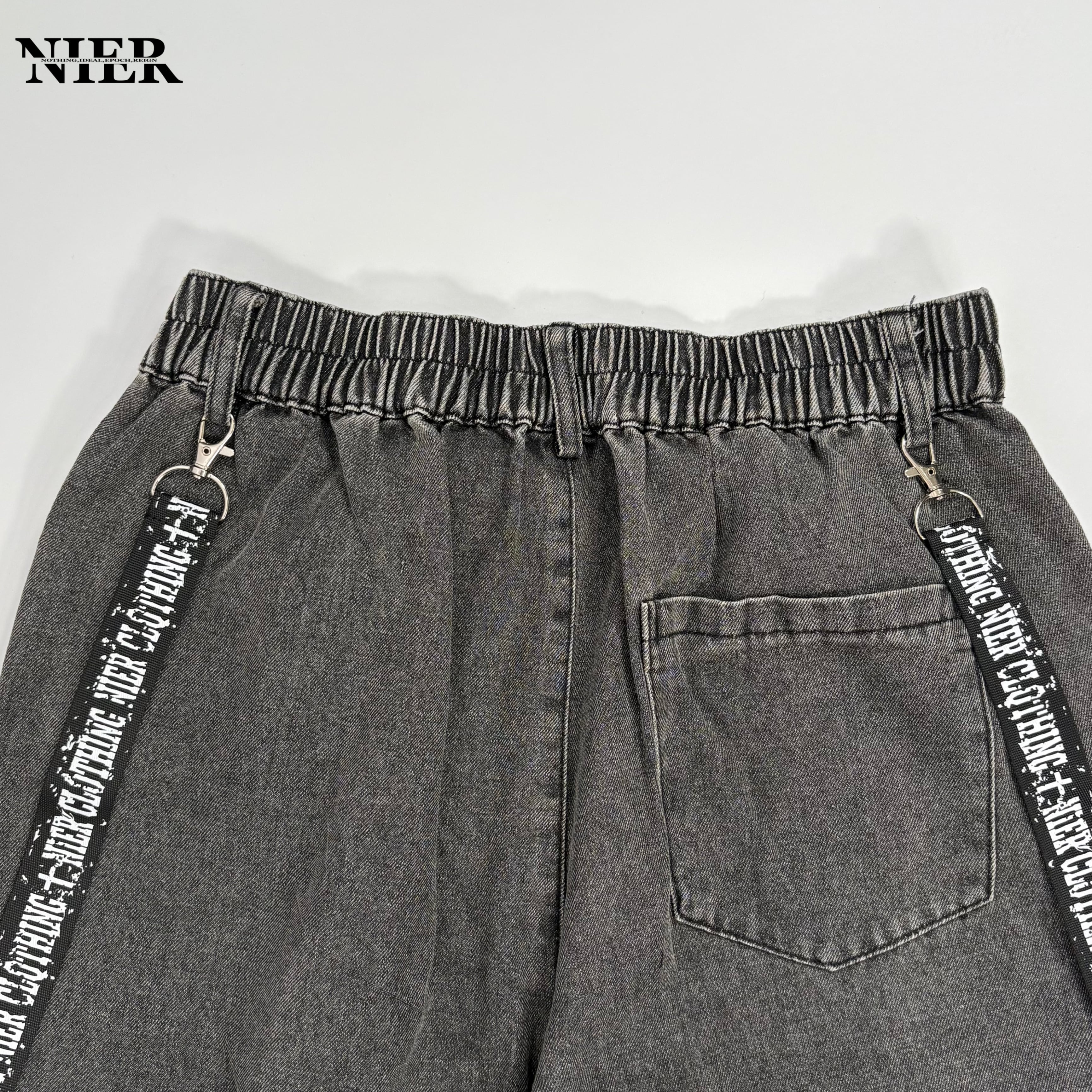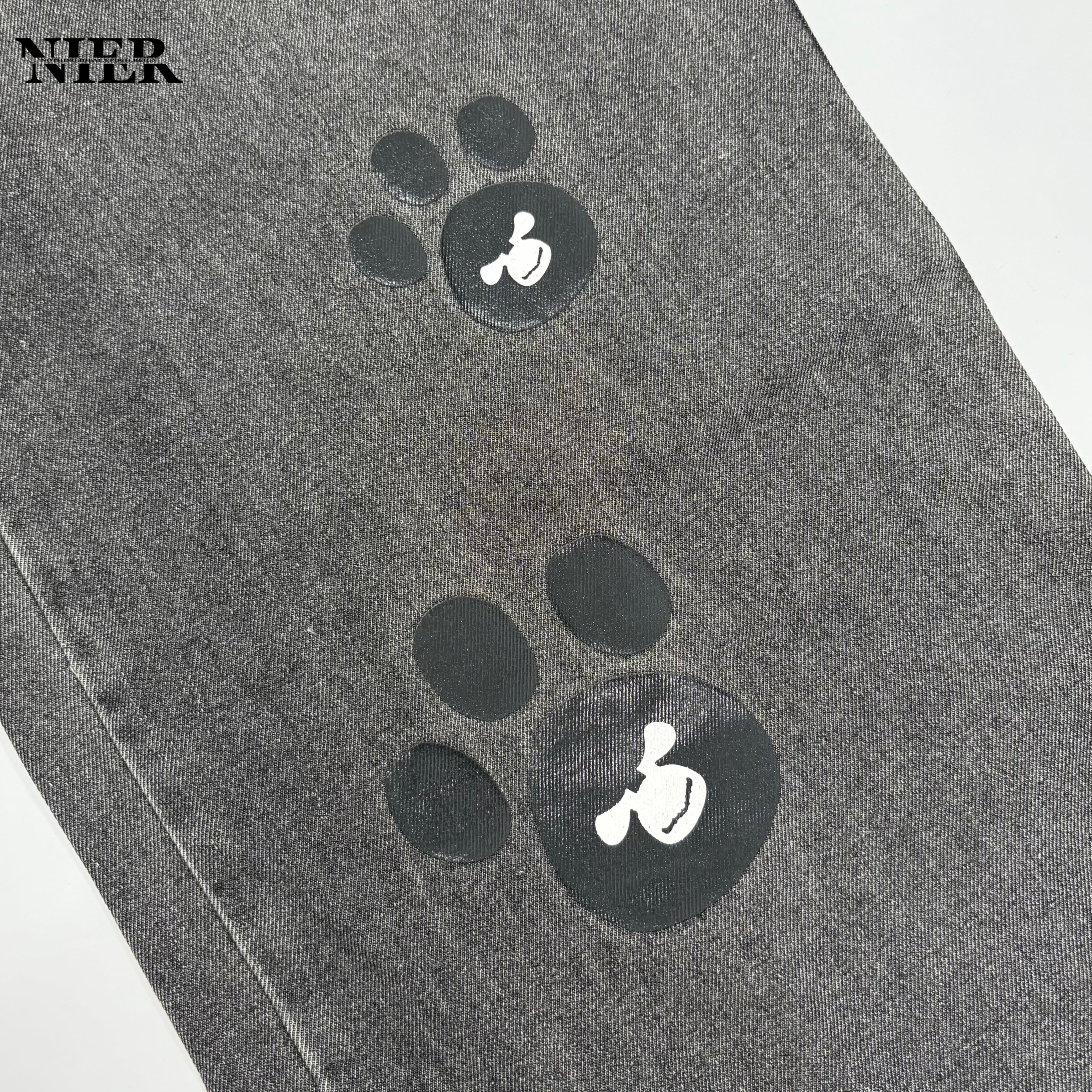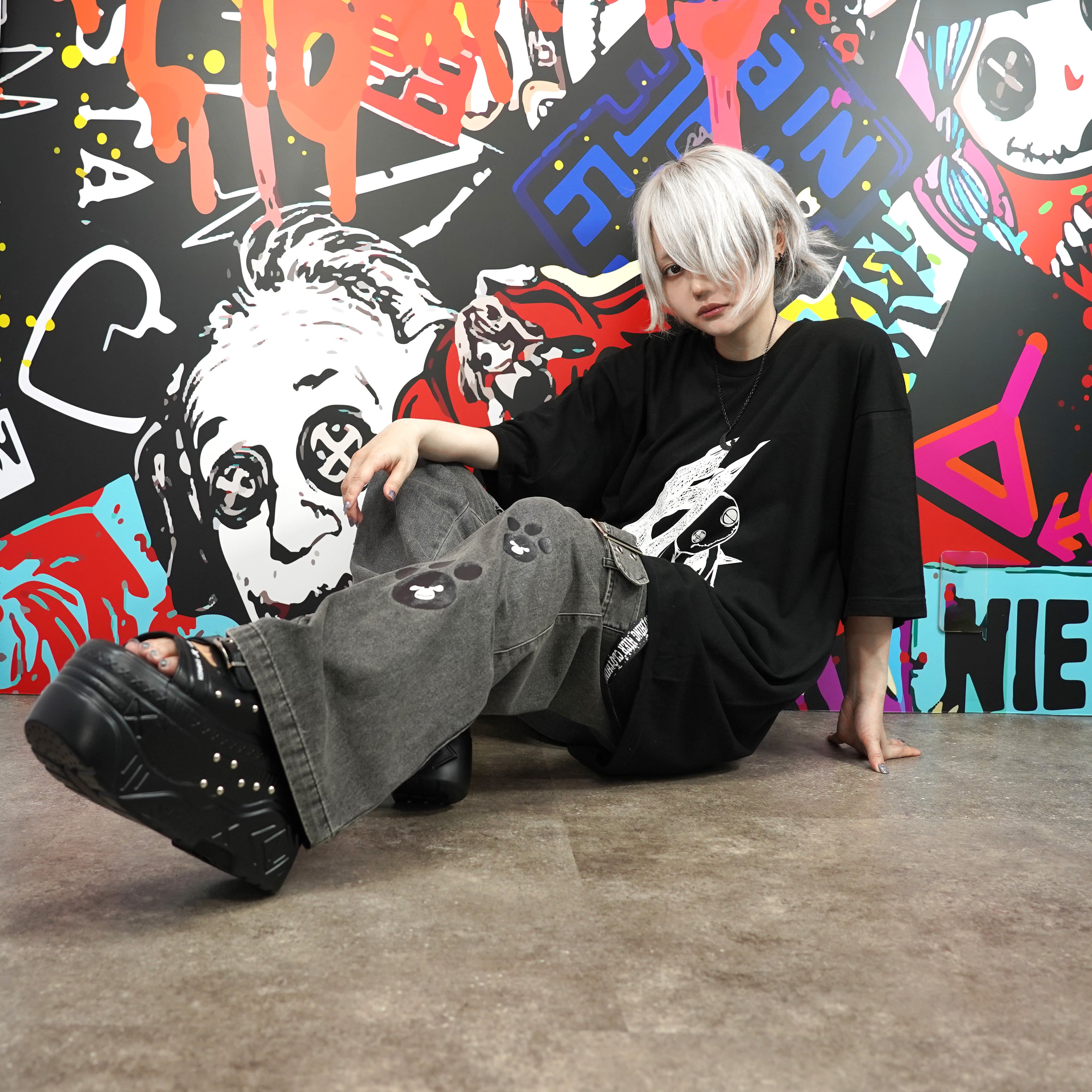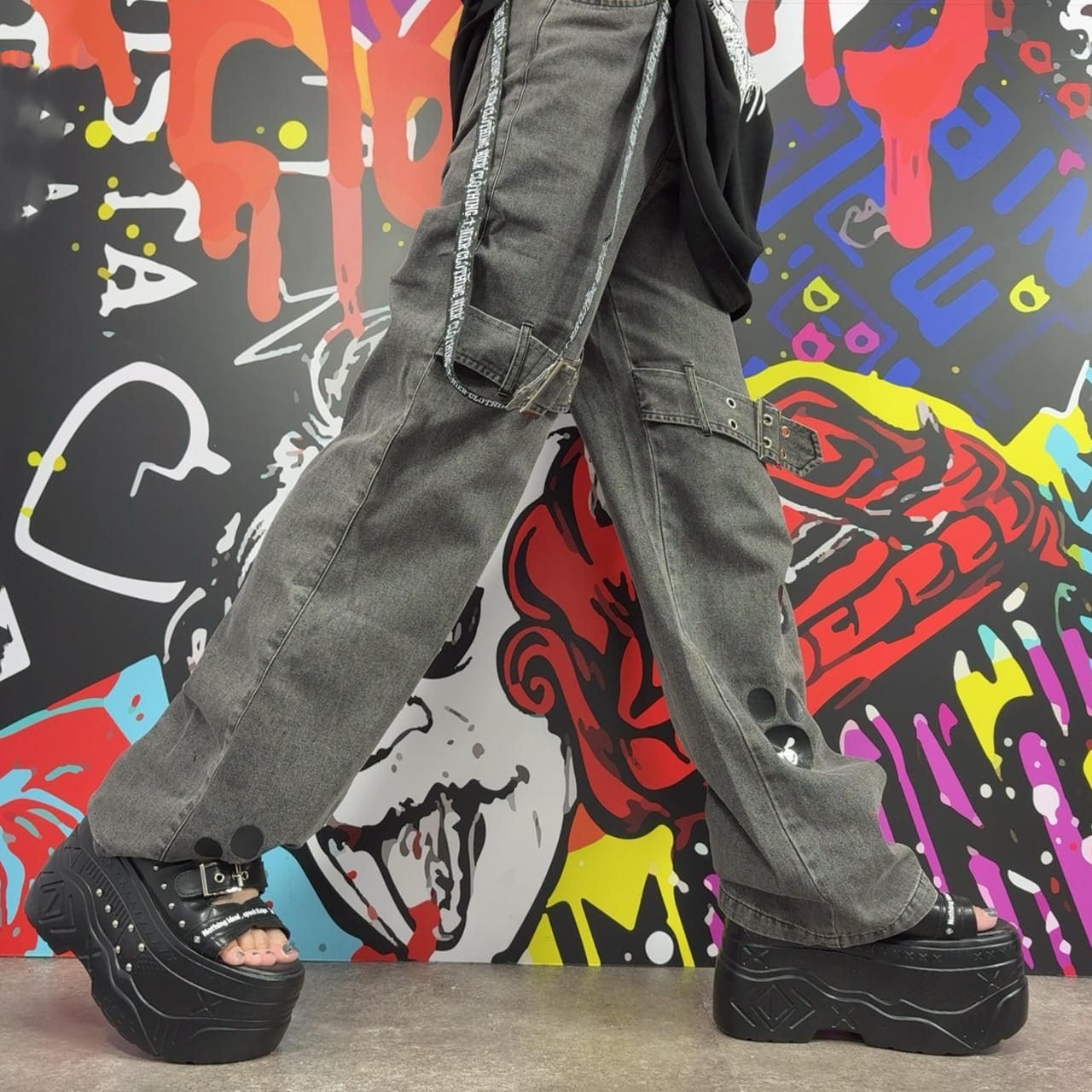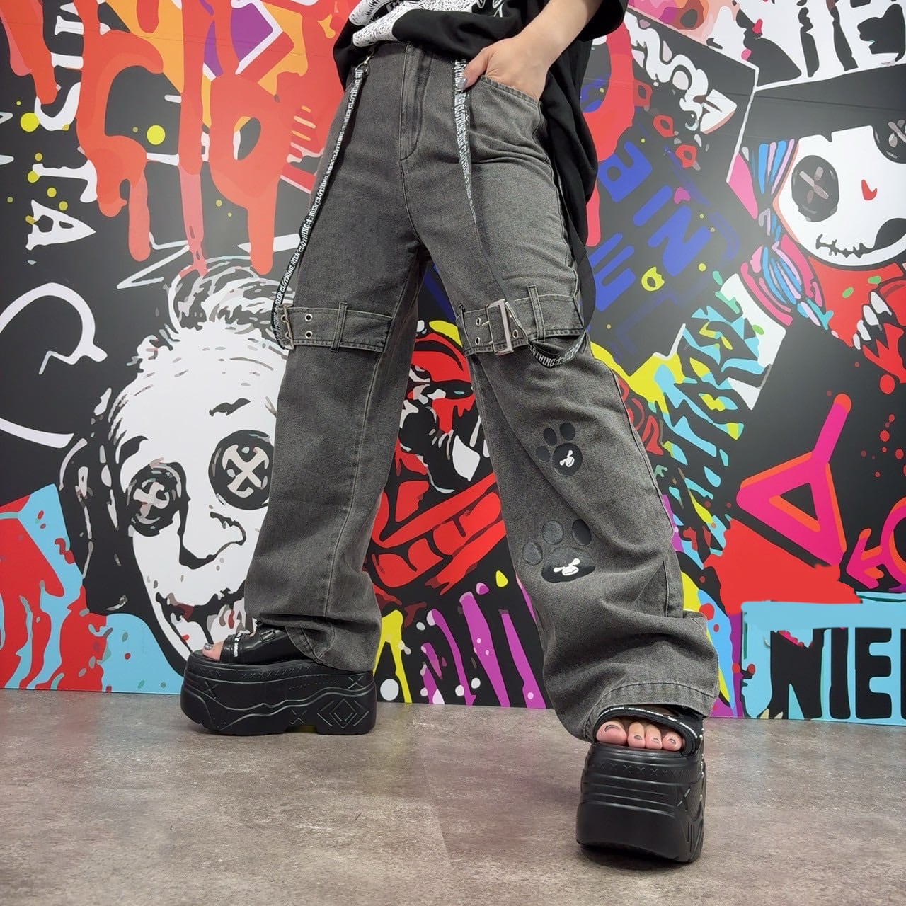 足跡PRINT×STRAP高品質WIDE DENIM PANTS