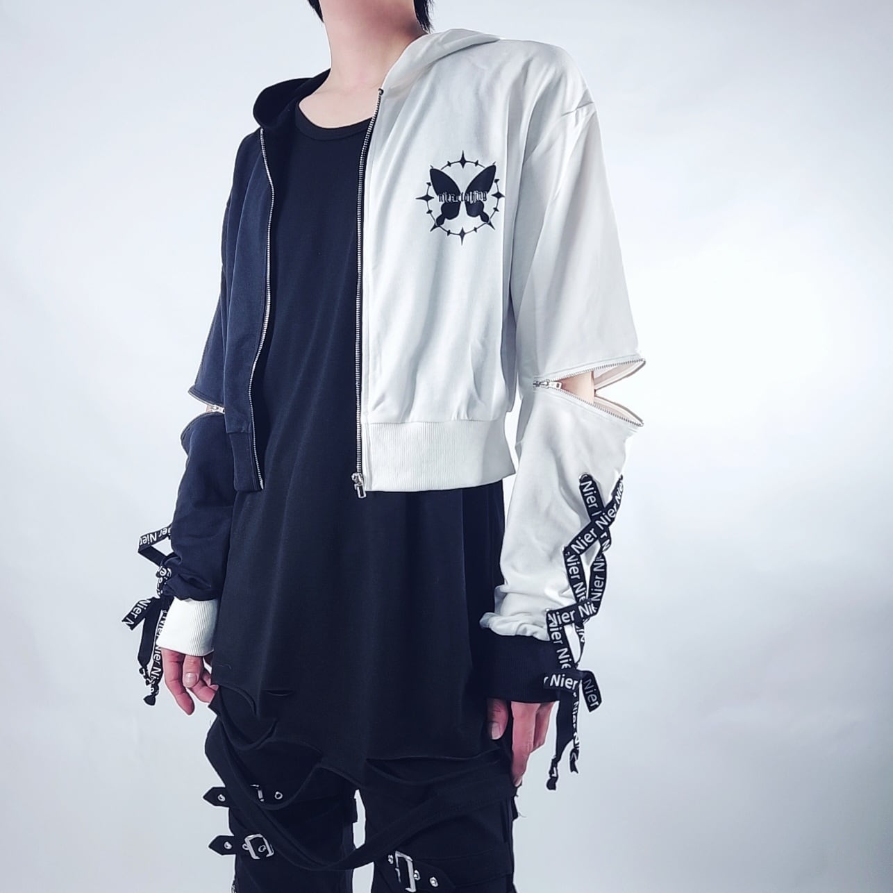 胸元と背中には存在感のある蝶モチーフ×NIERロゴプリントを配置し、スタイルに個性をプラスします。