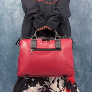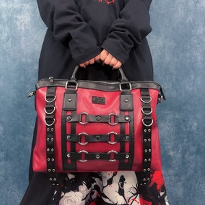 インパクト抜群のレッド×ブラック配色と、ベルト×リングの重厚なデザインが特徴的な 4WAYバッグ。