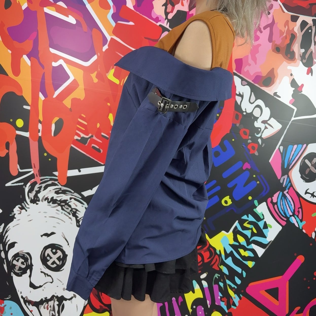 オフショルダー仕様のシャツ部分にはベルトが付属しており、スタイルにアクセントをプラス。