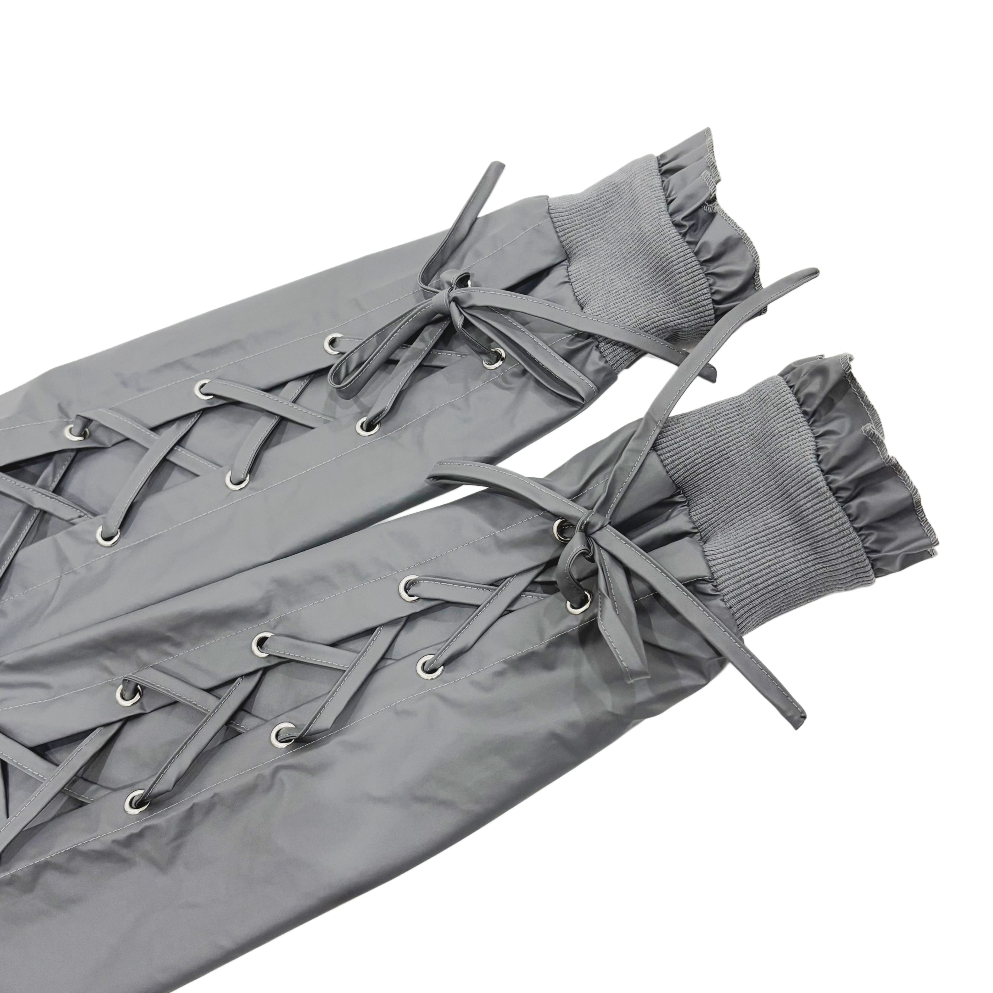 シックなグレーカラーのボディに、袖部分の編み上げリボンディティール、