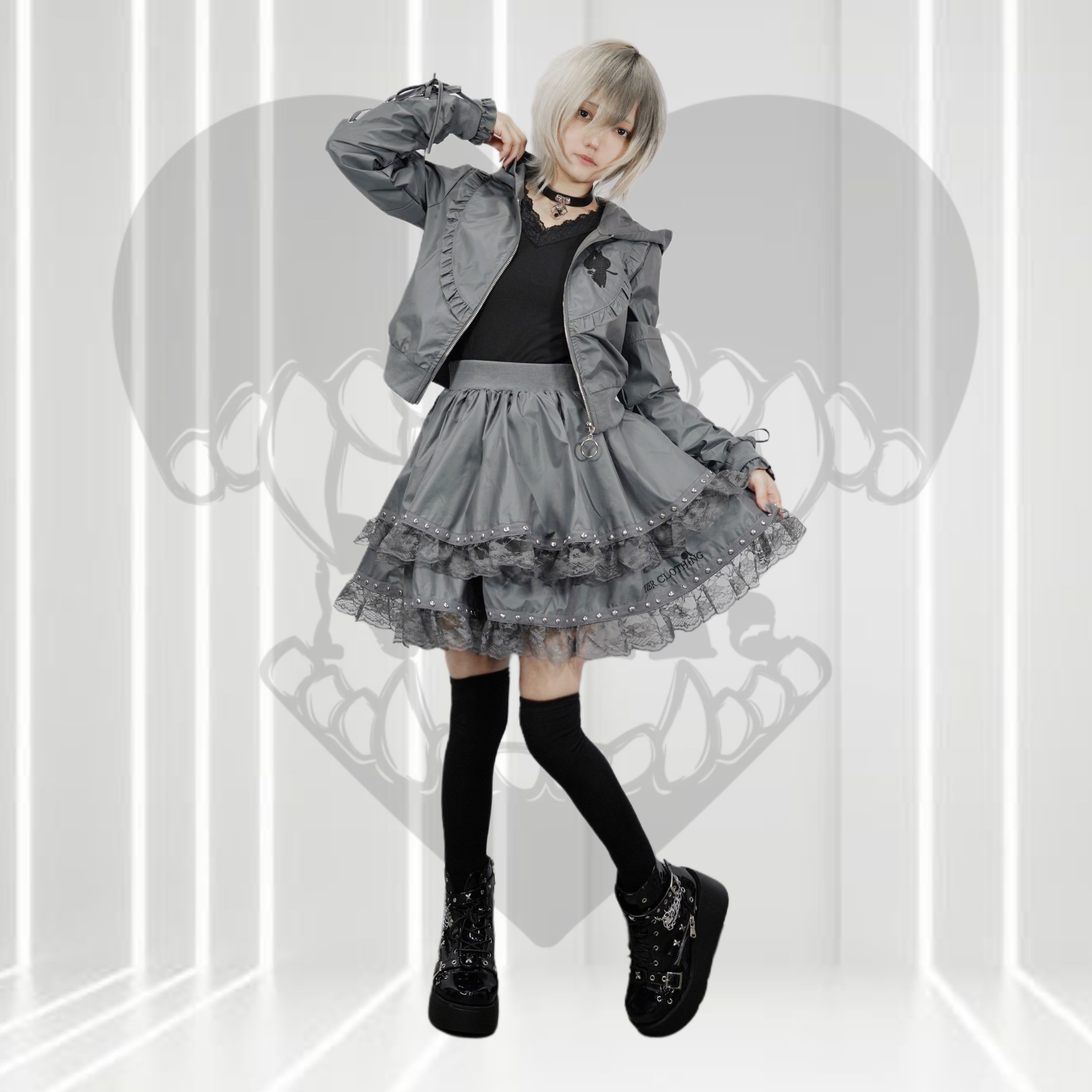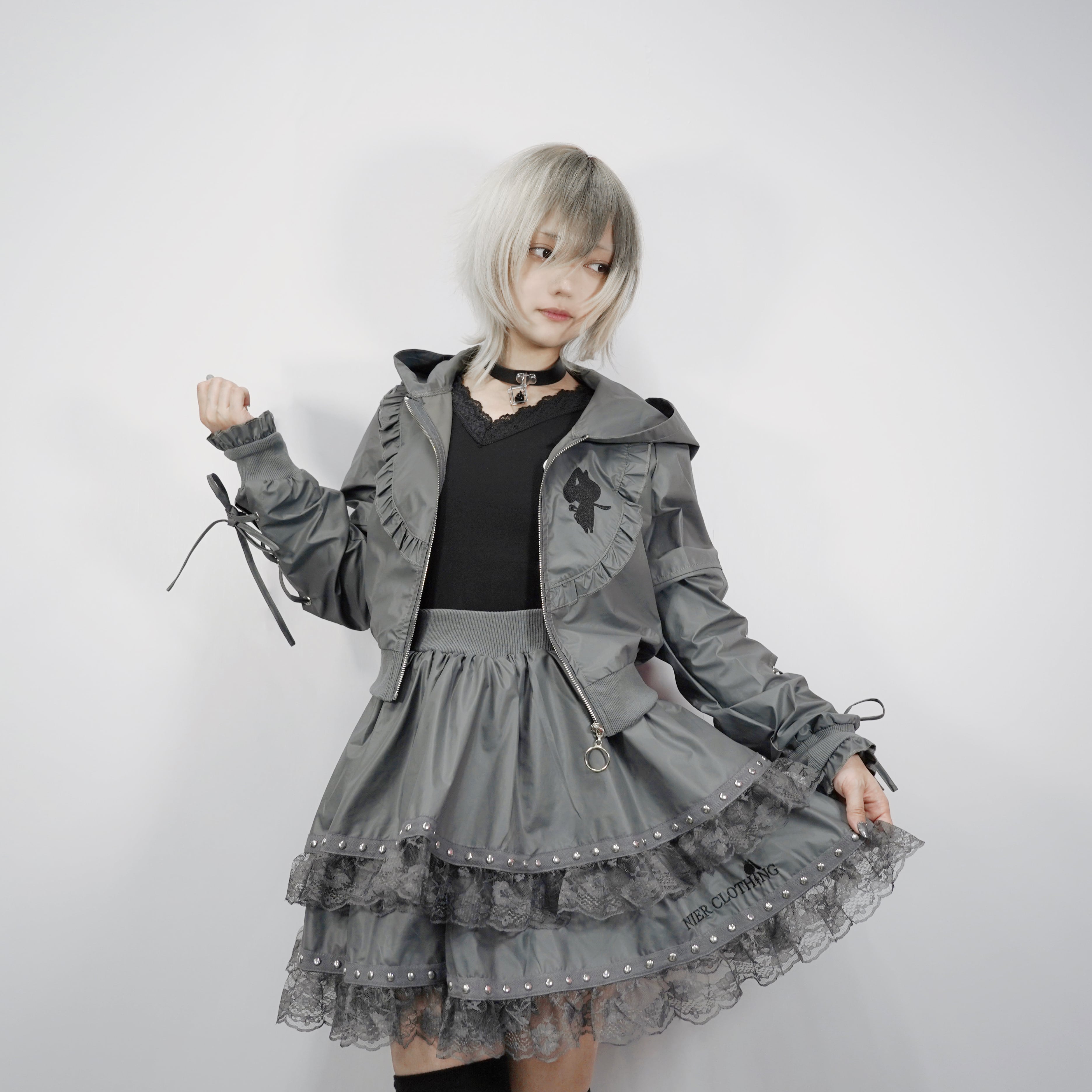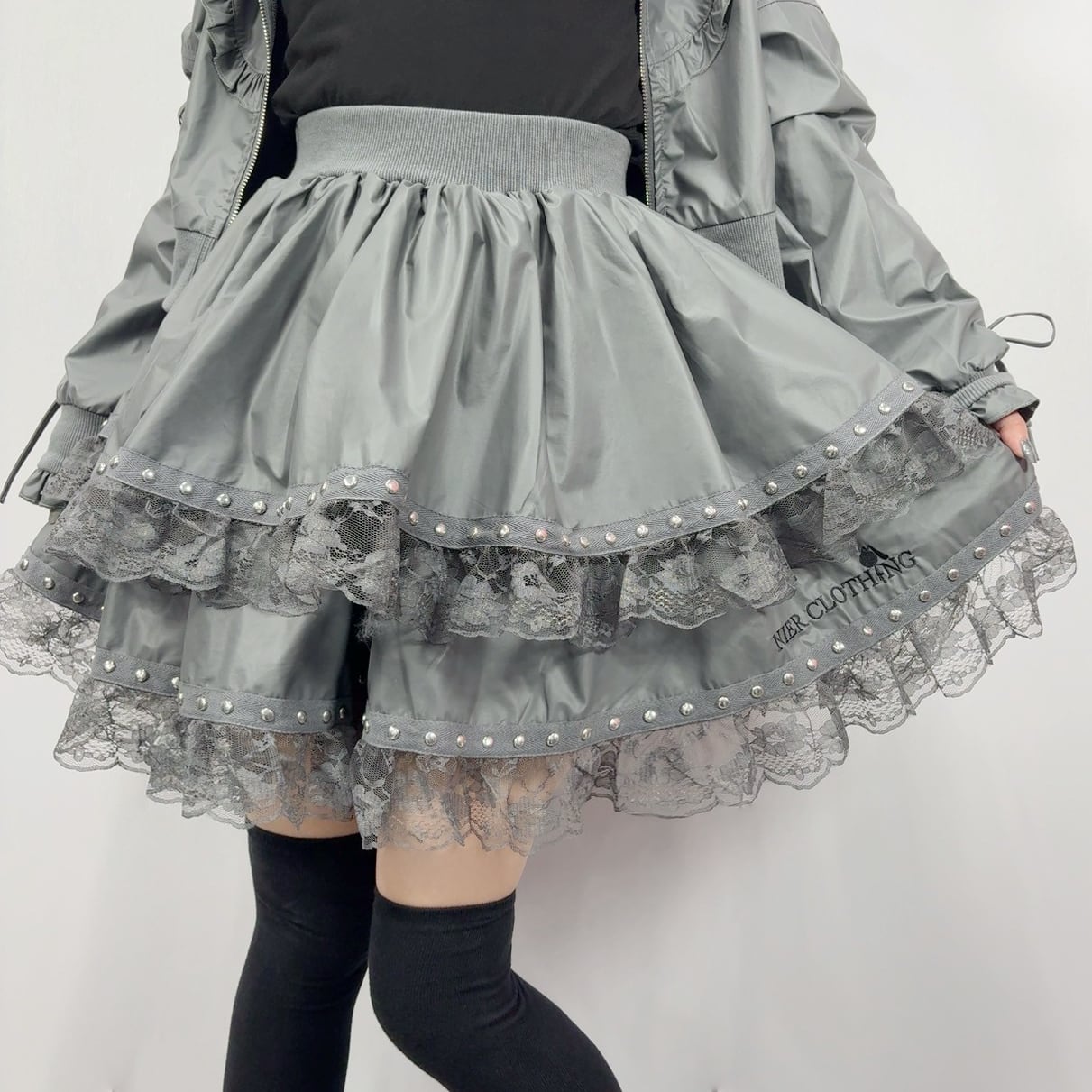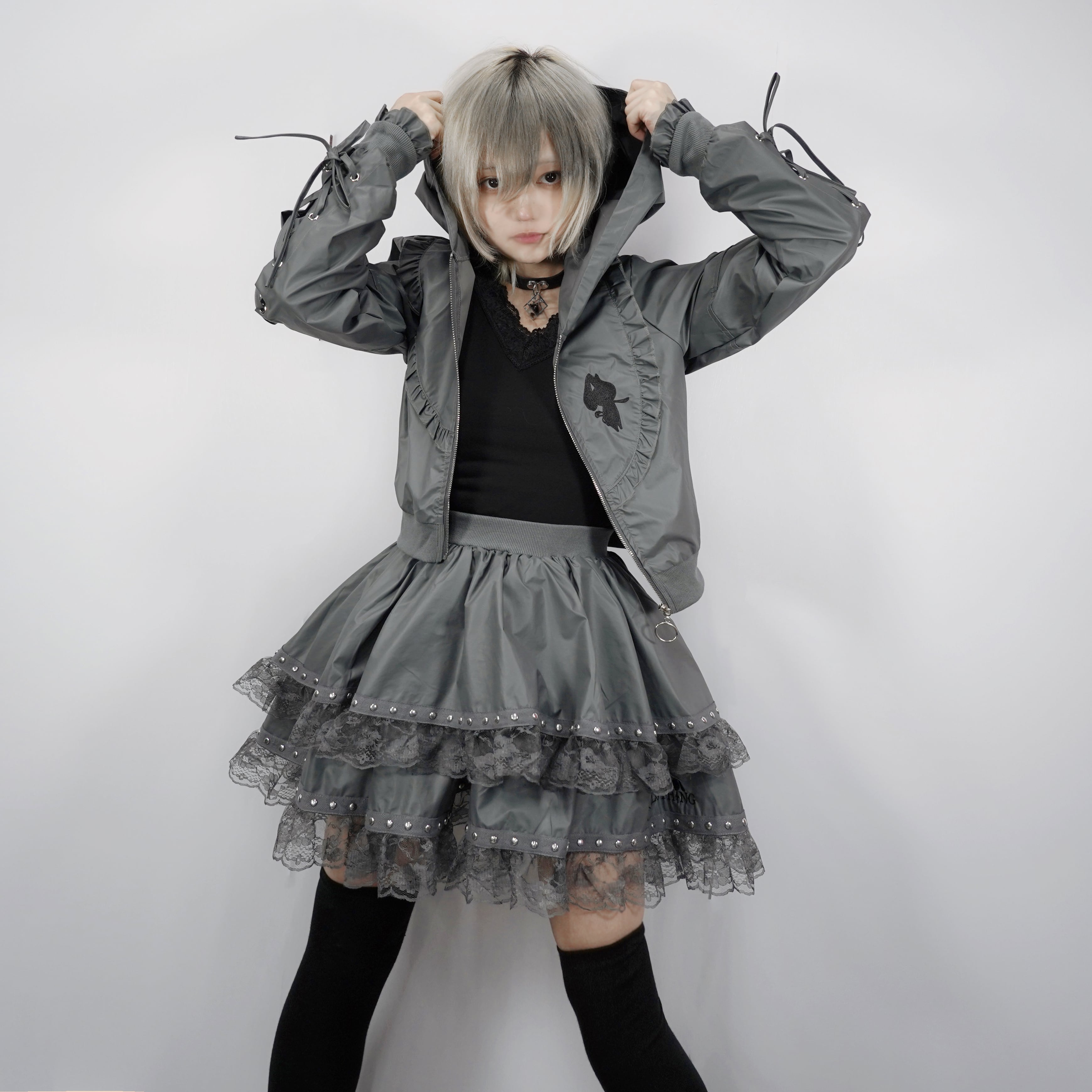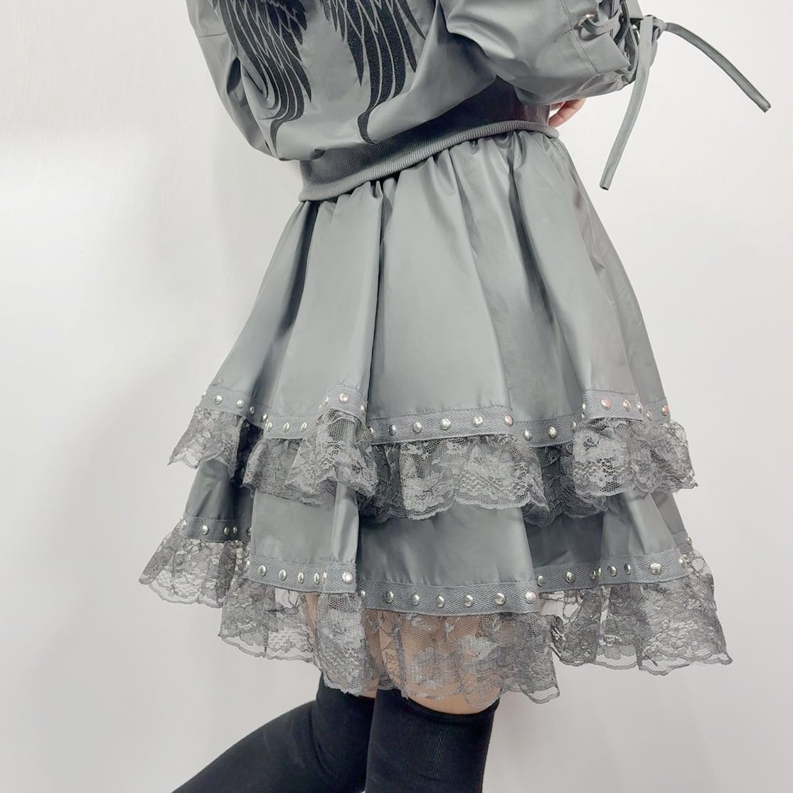 裾には繊細なレースと並んだスタッズ風装飾が施され、ゴシックかつガーリーな雰囲気を演出。