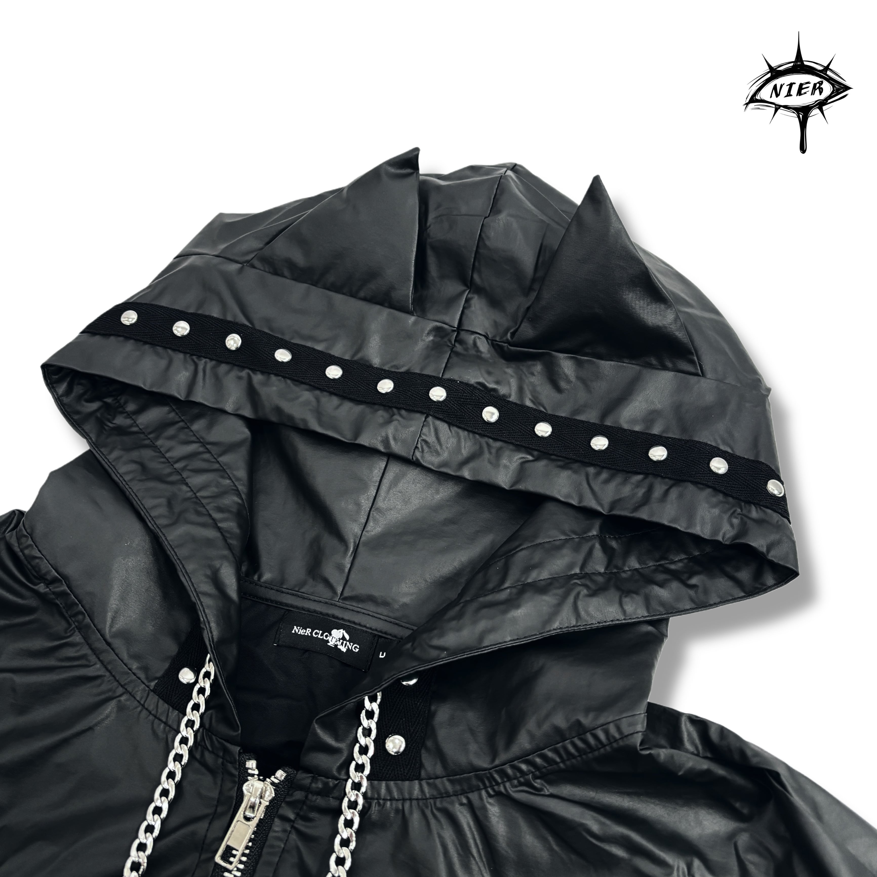 フード周りにはスタッズを並べたデザインが施されており、エッジの効いたアクセントになっています。