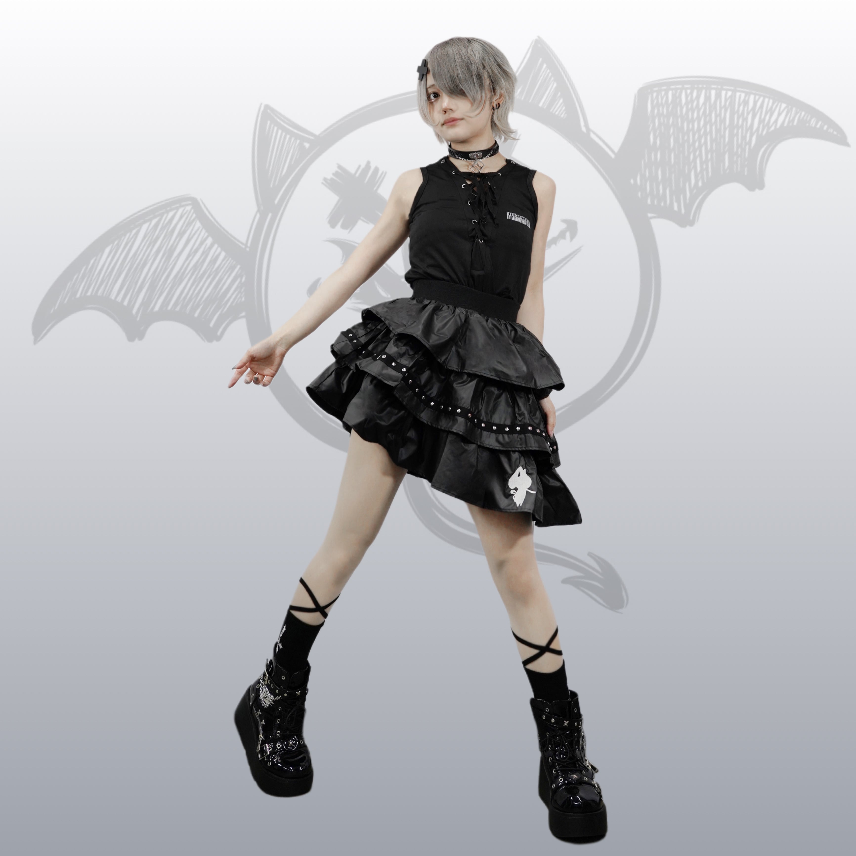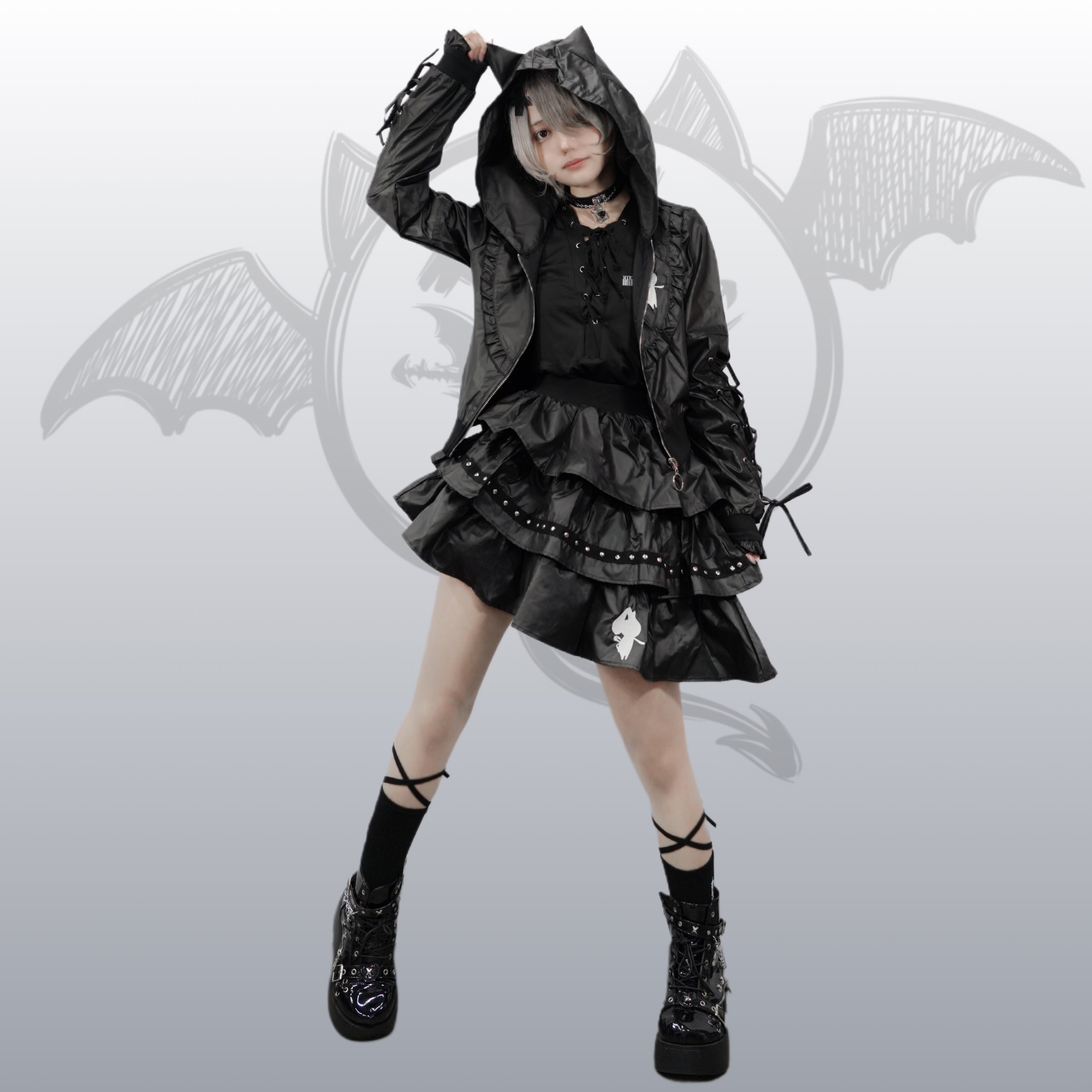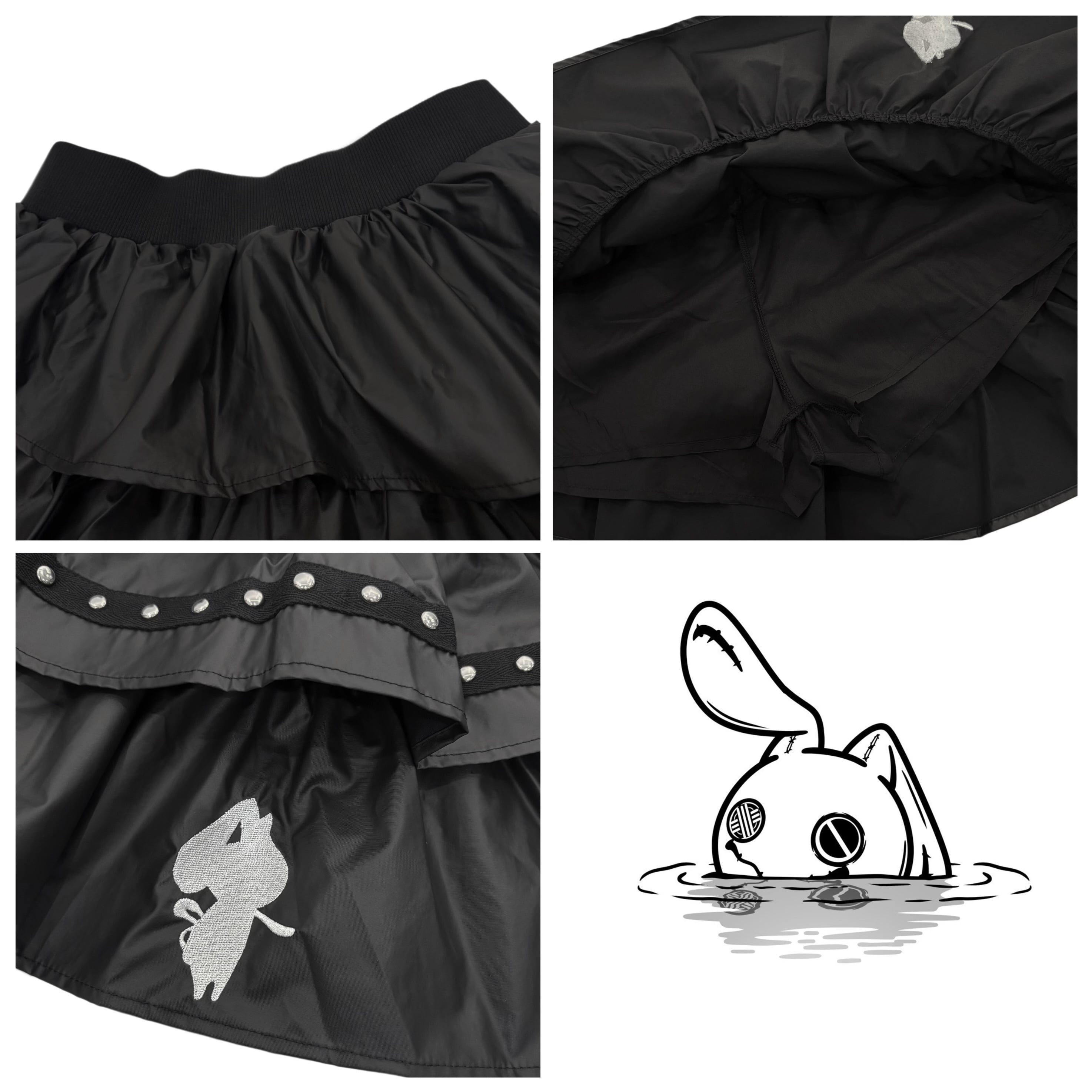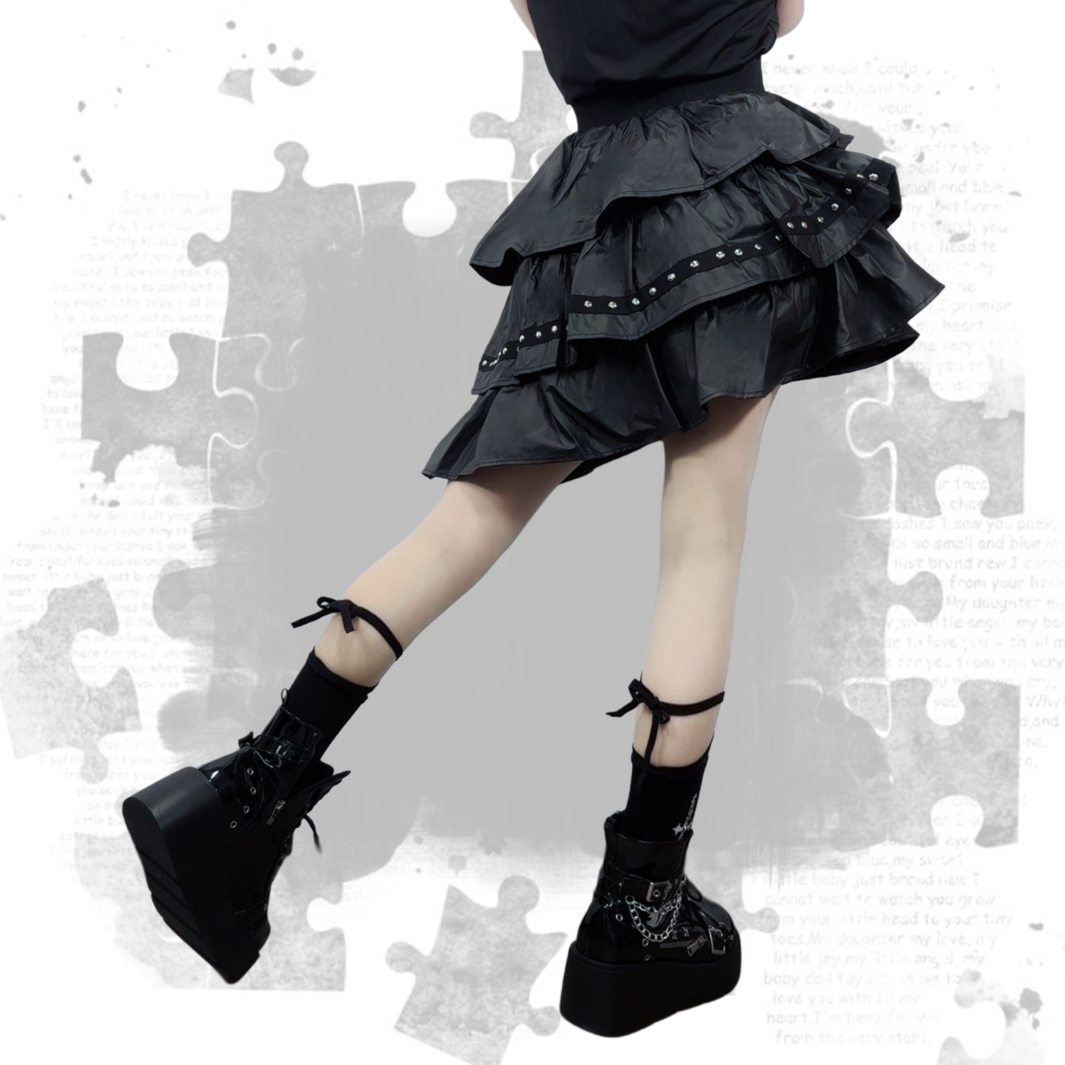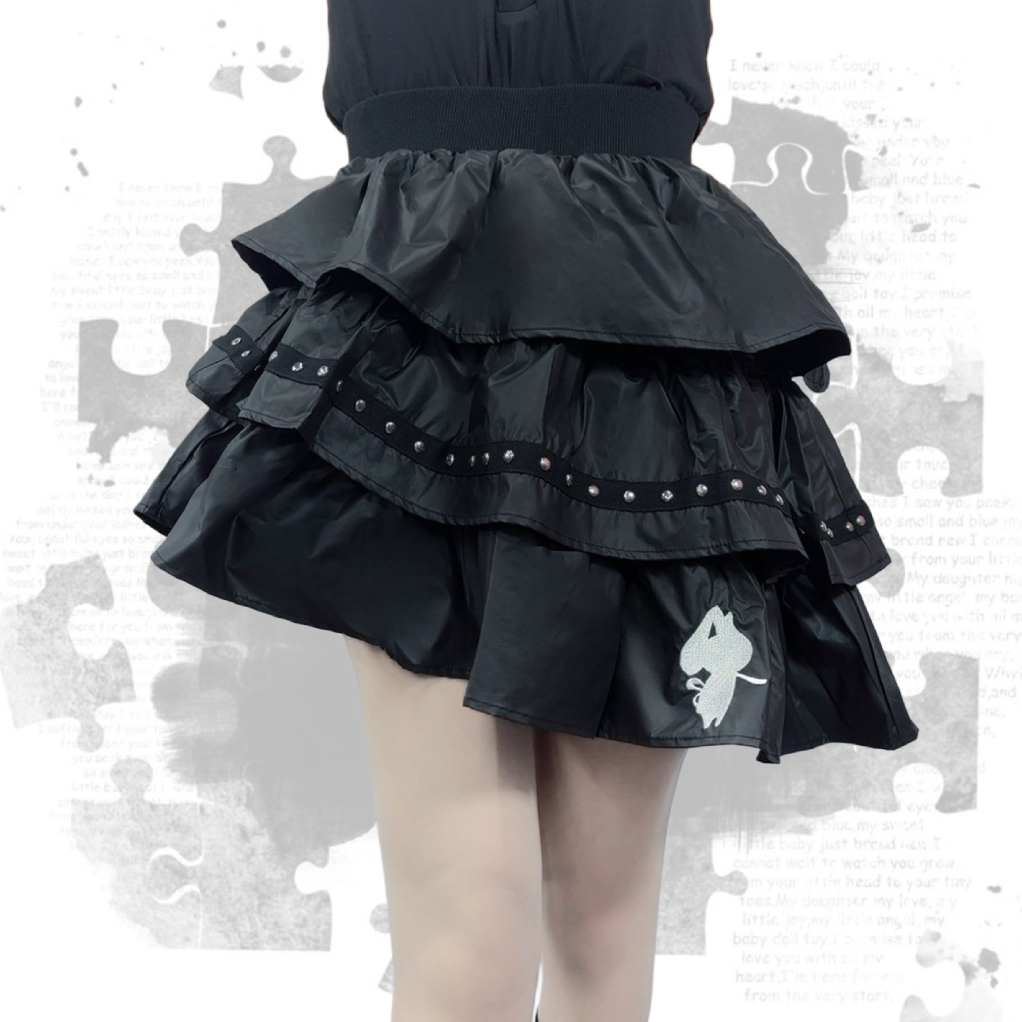 光沢感のあるブラック生地を使用した、3段フリルのティアードスカートです。