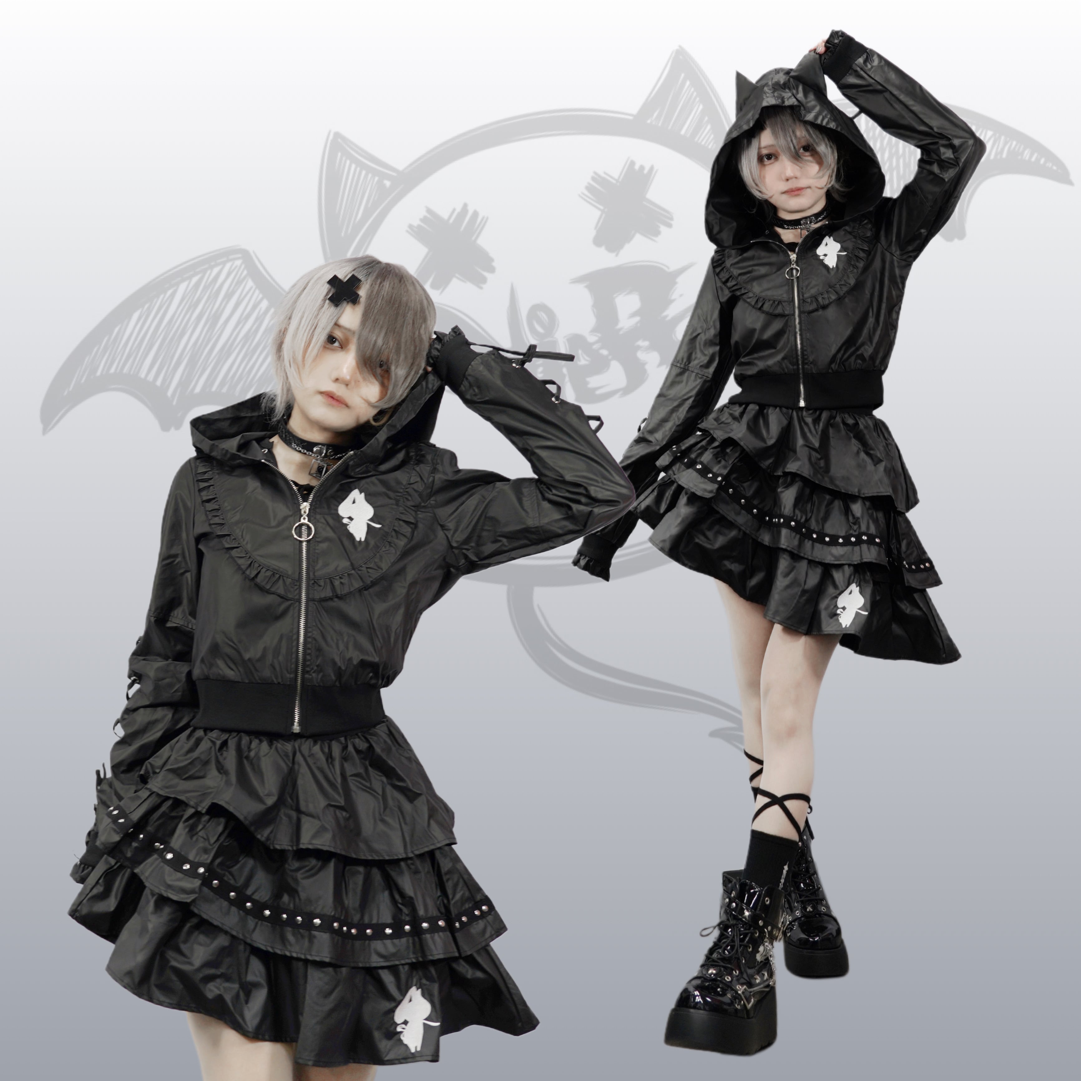 スタッズ装飾がダークな印象を引き立てつつ、裾にはブランドオリジナルの刺繍入りで遊び心もプラス。
