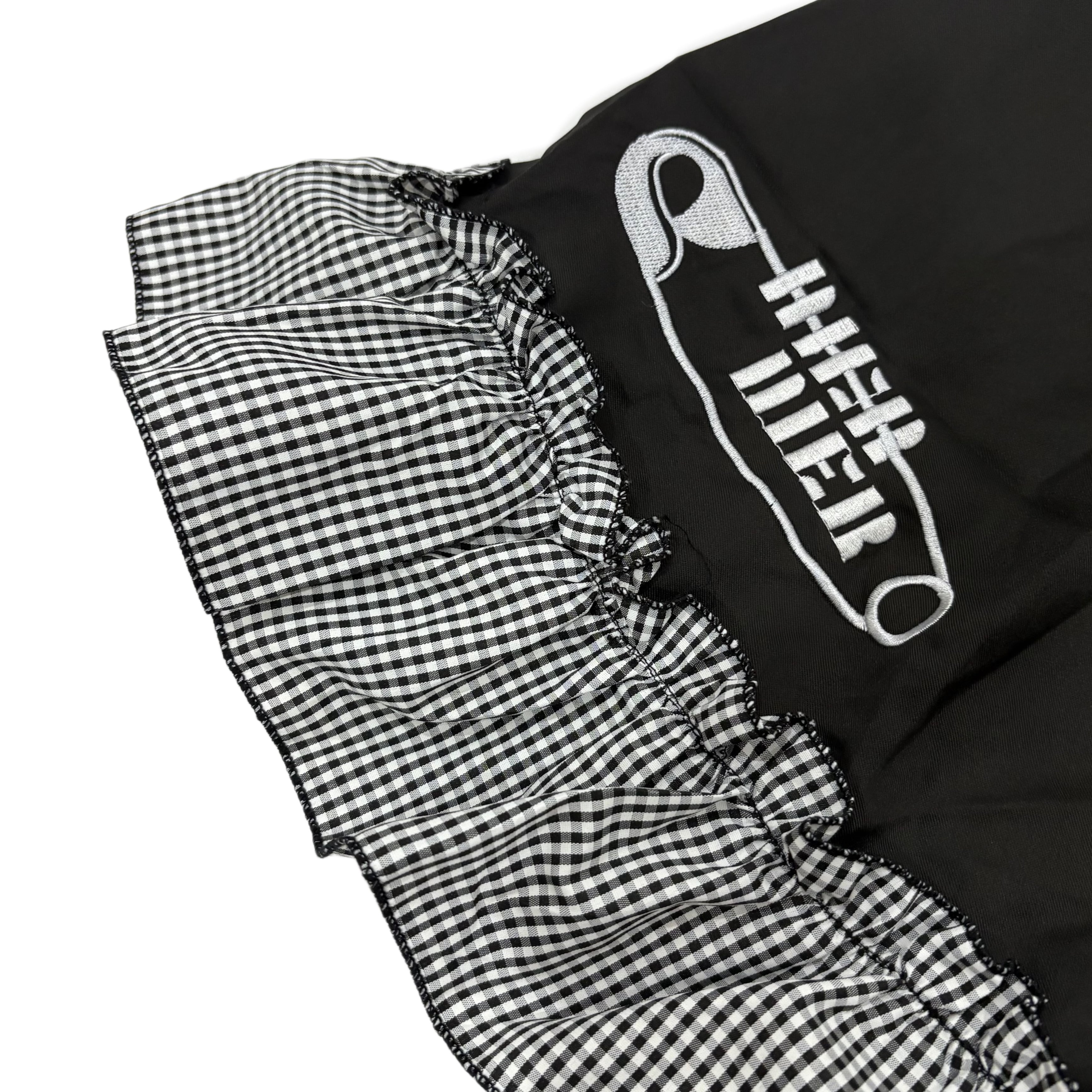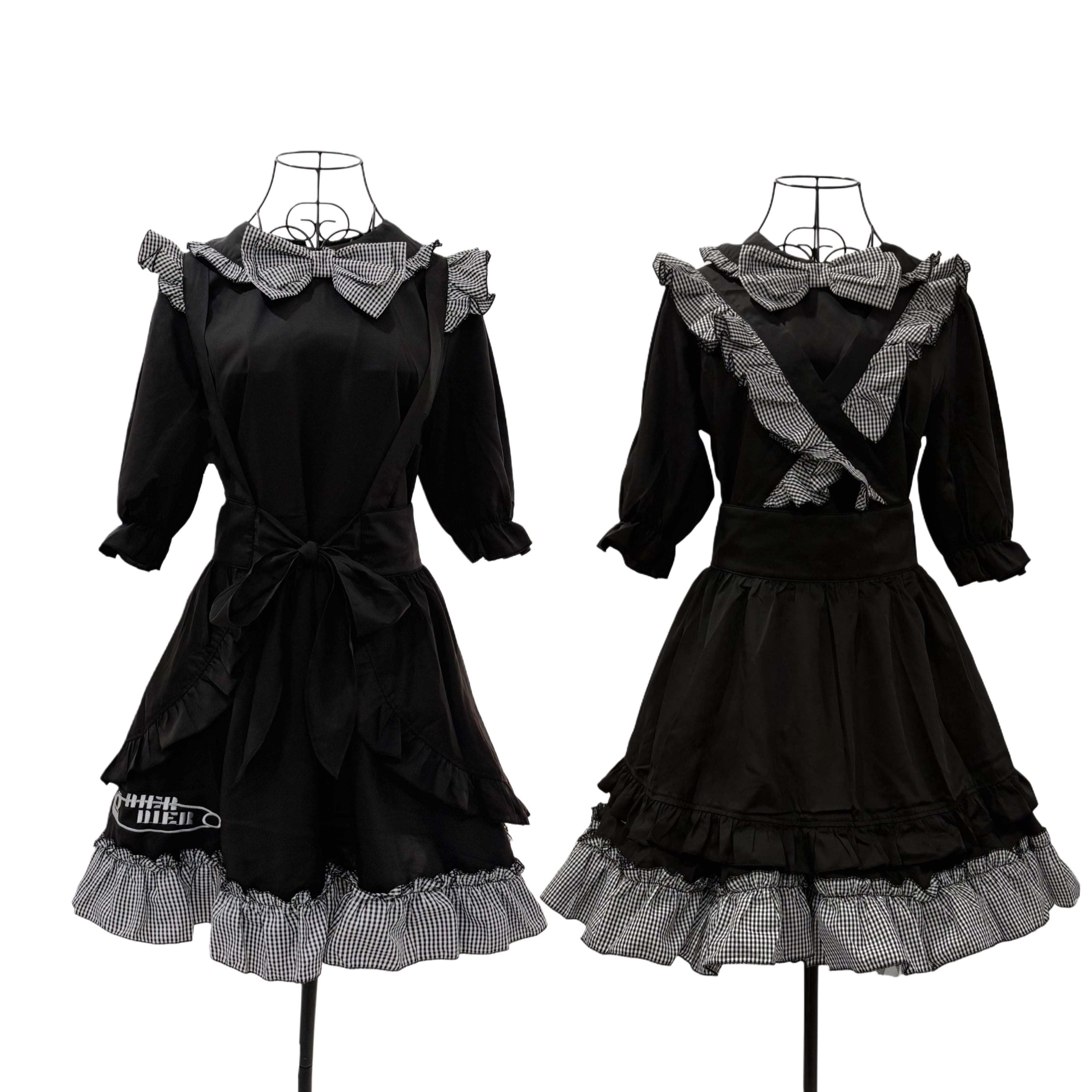 身頃はシックなブラックで統一し、裾と襟、胸元のリボンにはギンガムチェック柄を採用。