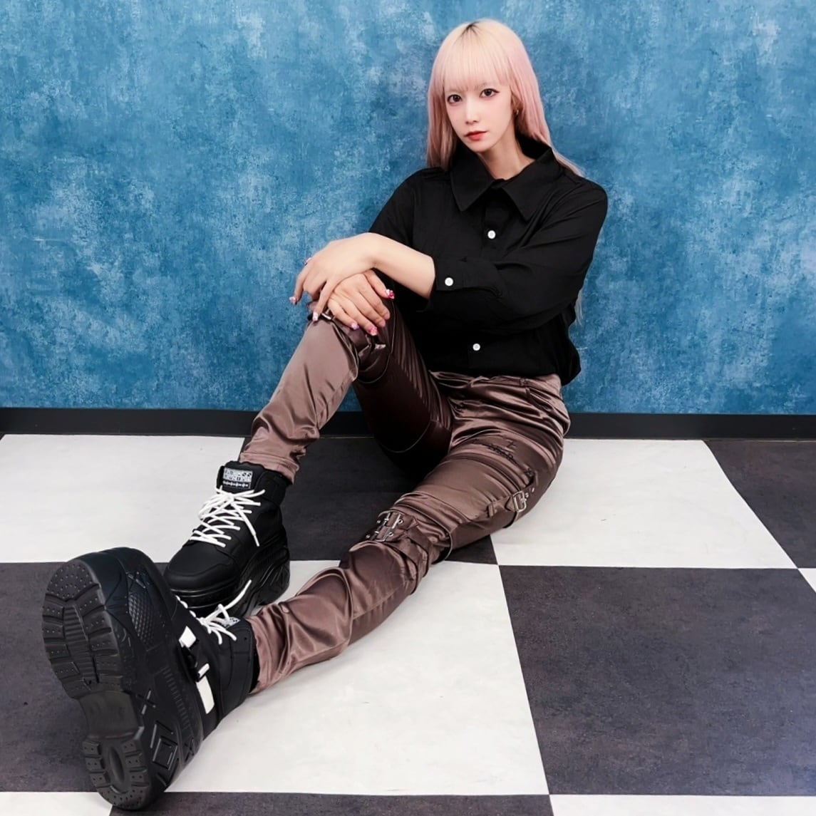 光沢感のある生地で、コーデにエッジをプラスしてくれます。