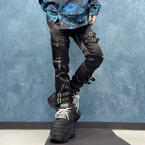 ベルトやジップの無骨なデザインとの対比が、モードかつダークな存在感を際立たせます。