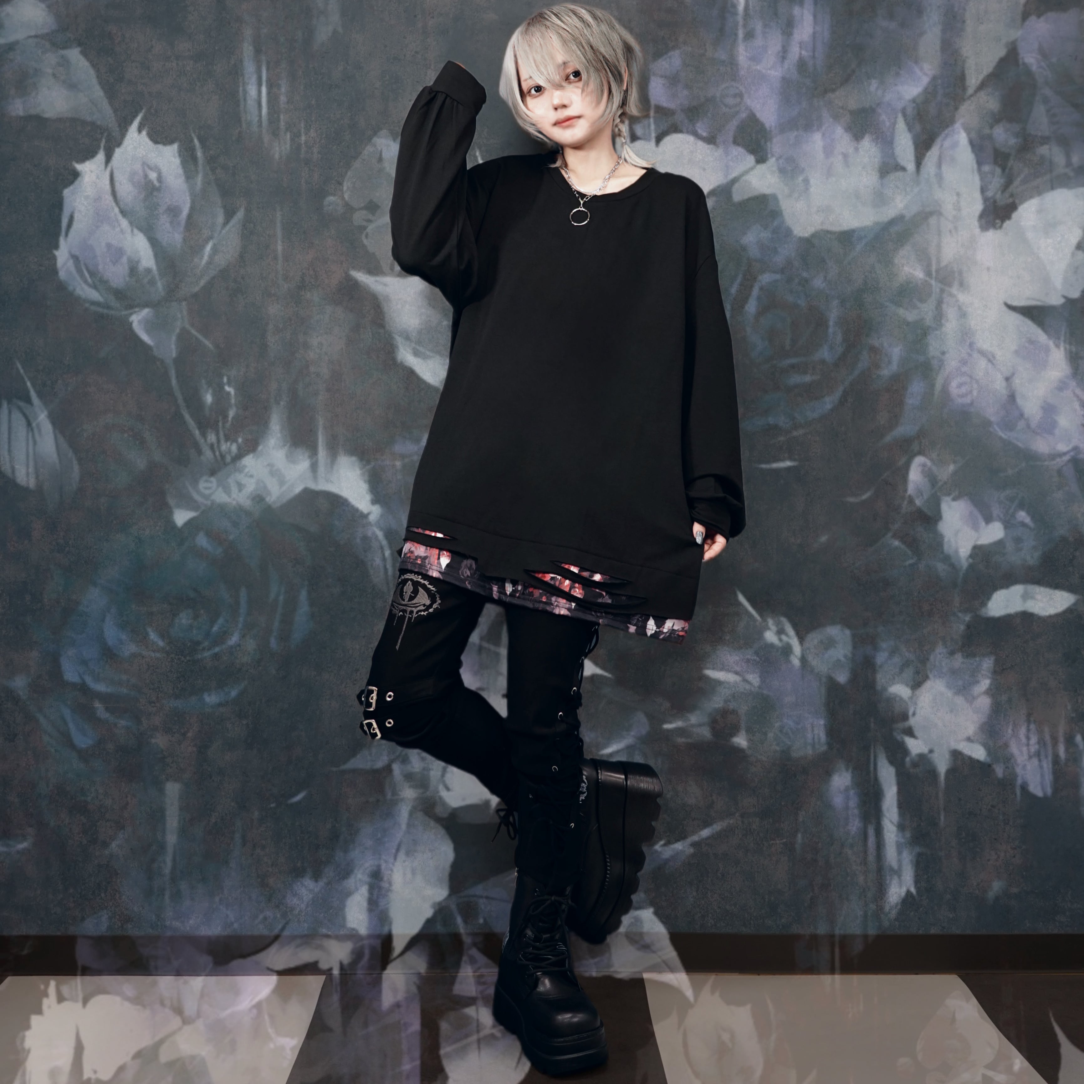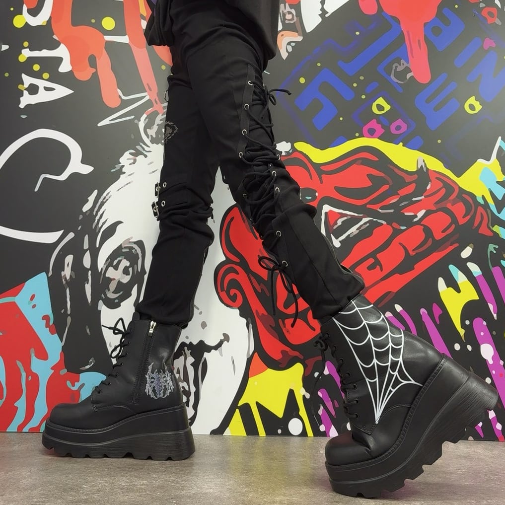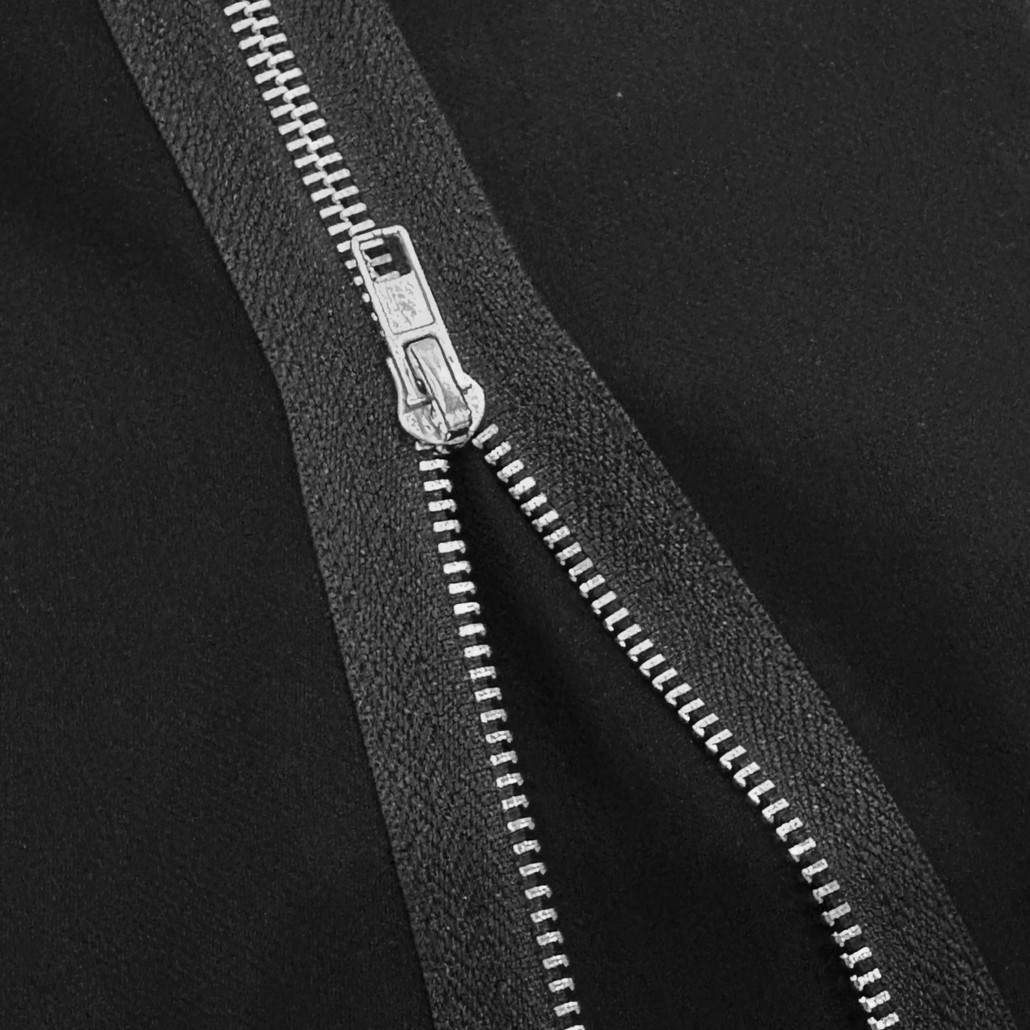 背面には膝下まで伸びるロングZIPを採用し、足元までダークな雰囲気を演出。