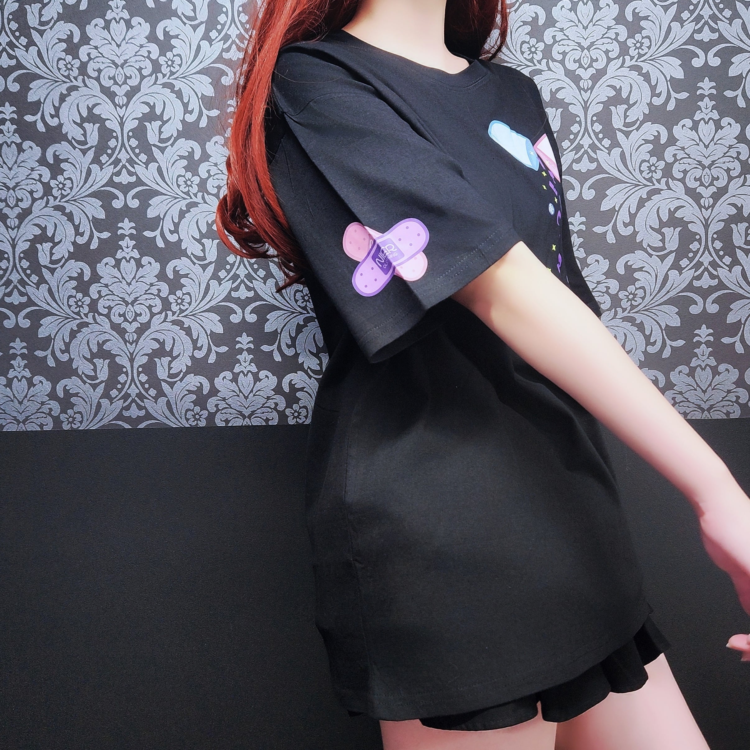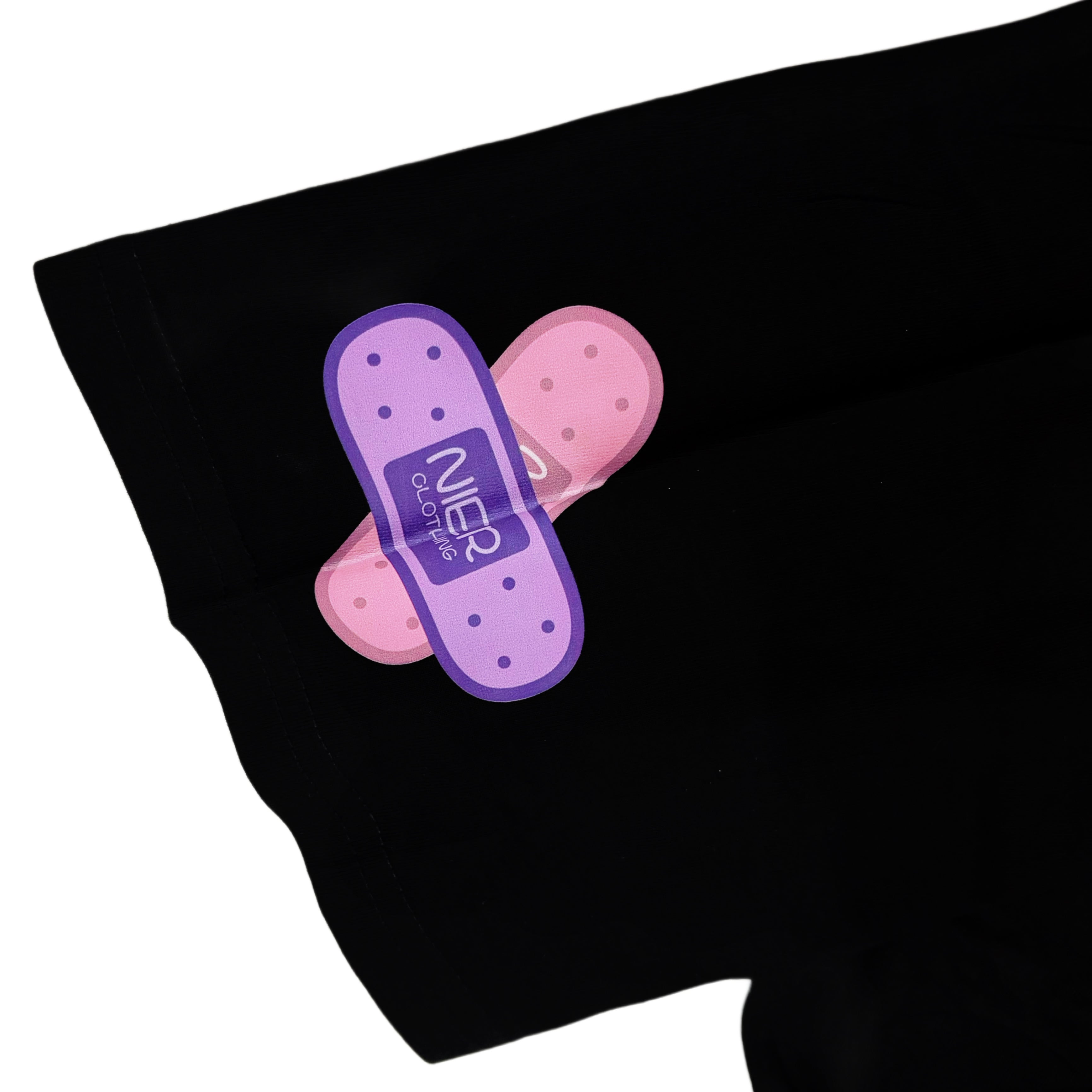 袖にはカラフルなバンソウコウモチーフをプリントし、