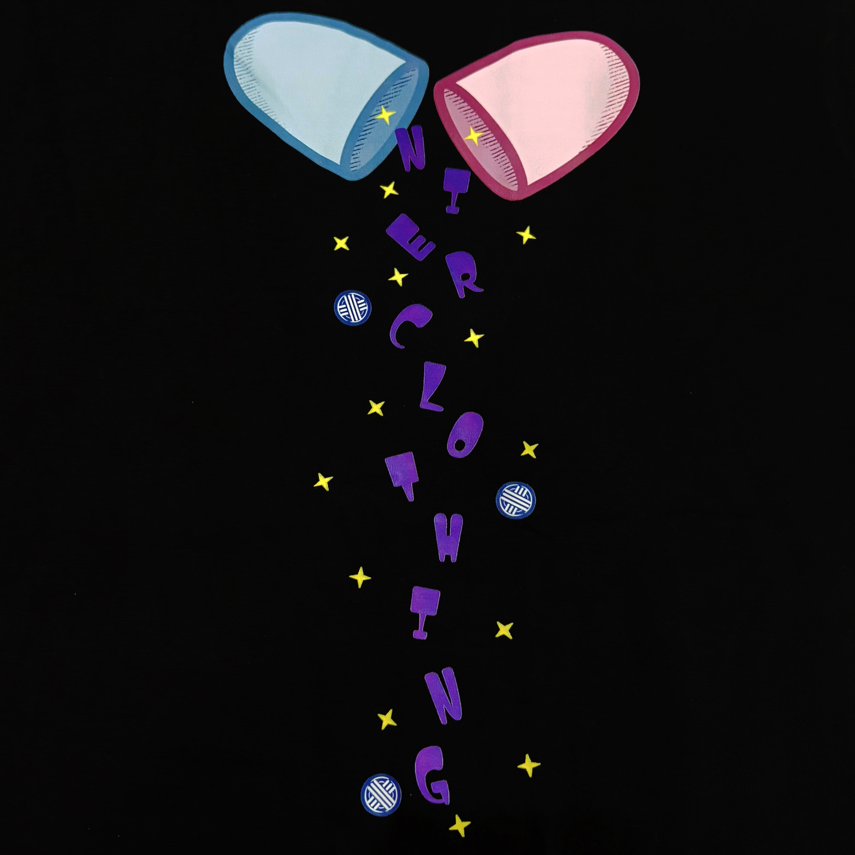 フロントにはカプセルからあふれるように散りばめられた「NIER CLOTHING」の文字が描かれ、